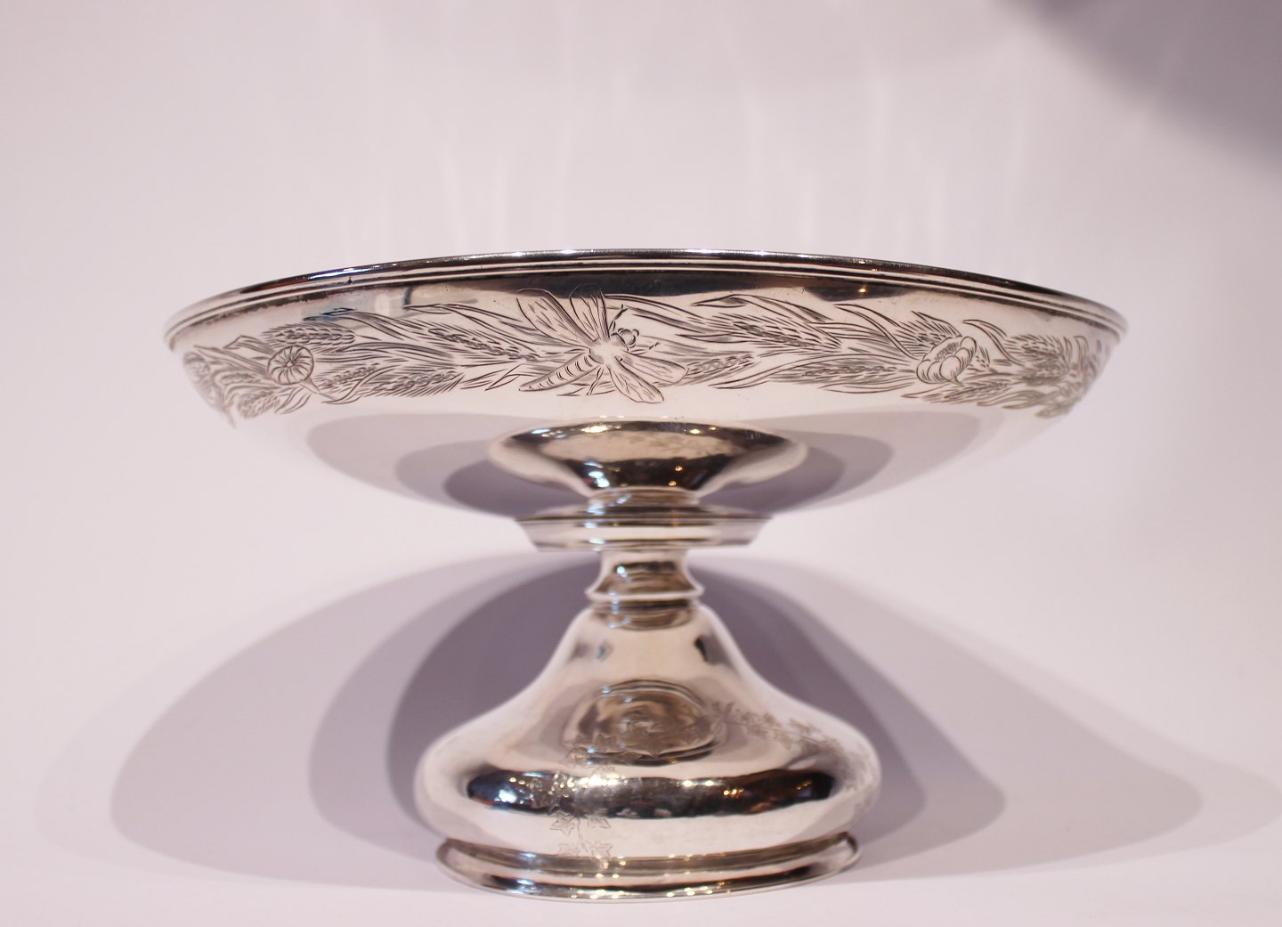 Stor opsats af tretårnet sølv dekoreret med blomster og bier på siden, stemplet Clement.