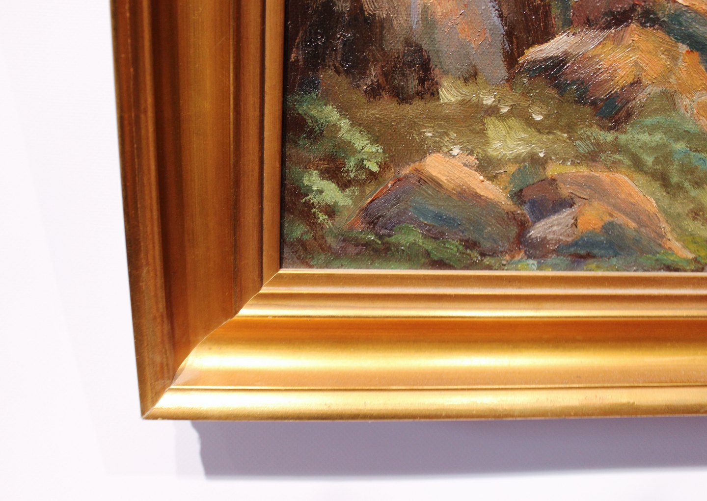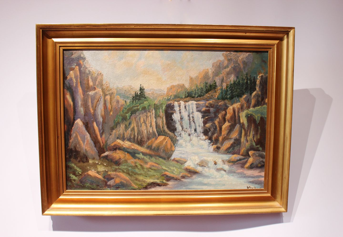 Oliemaleri med motiv af vandfald og klipper, med forgyldt ramme. Maleriet er signeret af en ukendt dansk kunster.