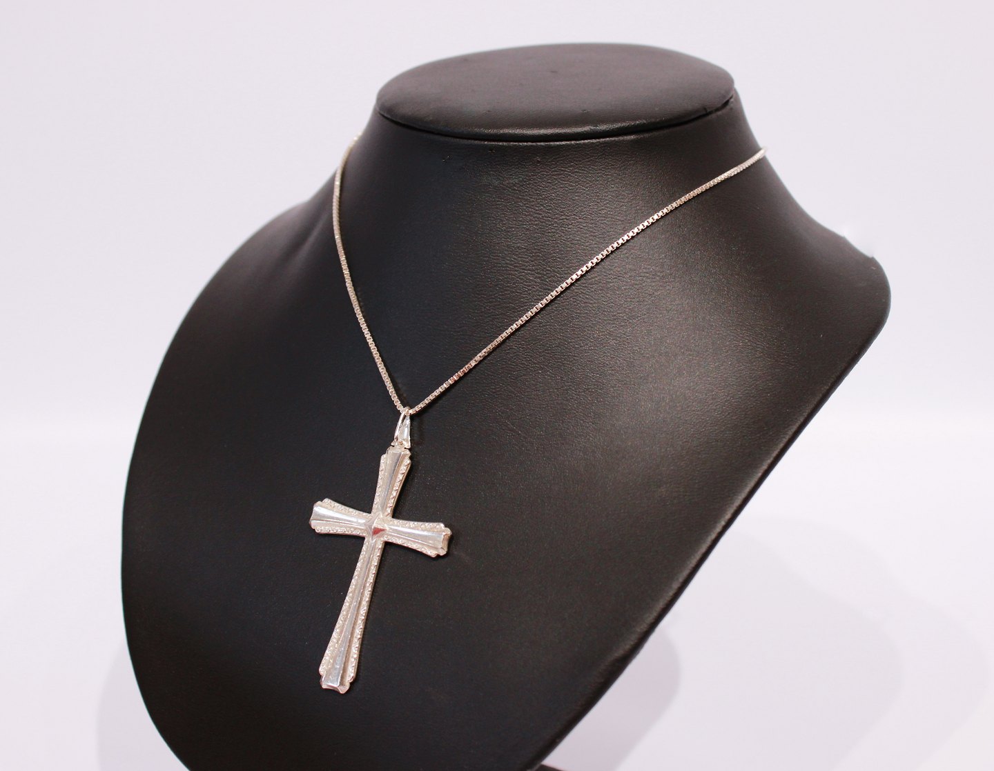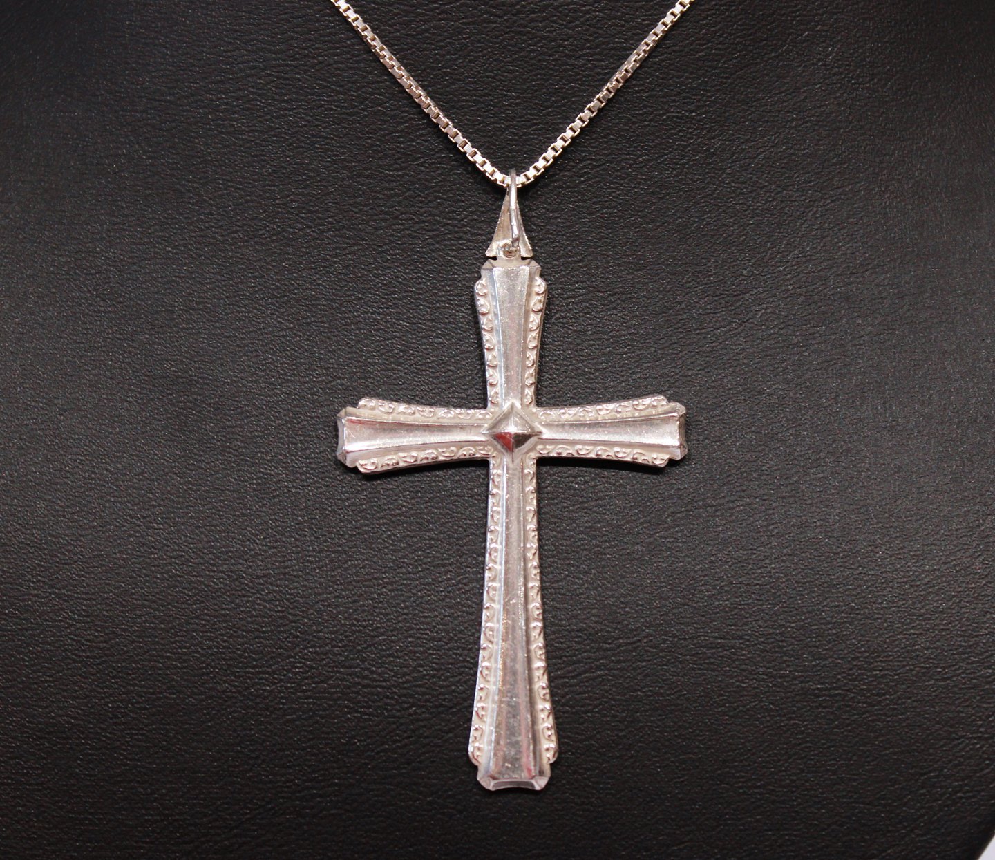 Stort vedhæng i form af kors, stemplet H, i 830 sølv. Lignende kæde kan tilkøbes separat.