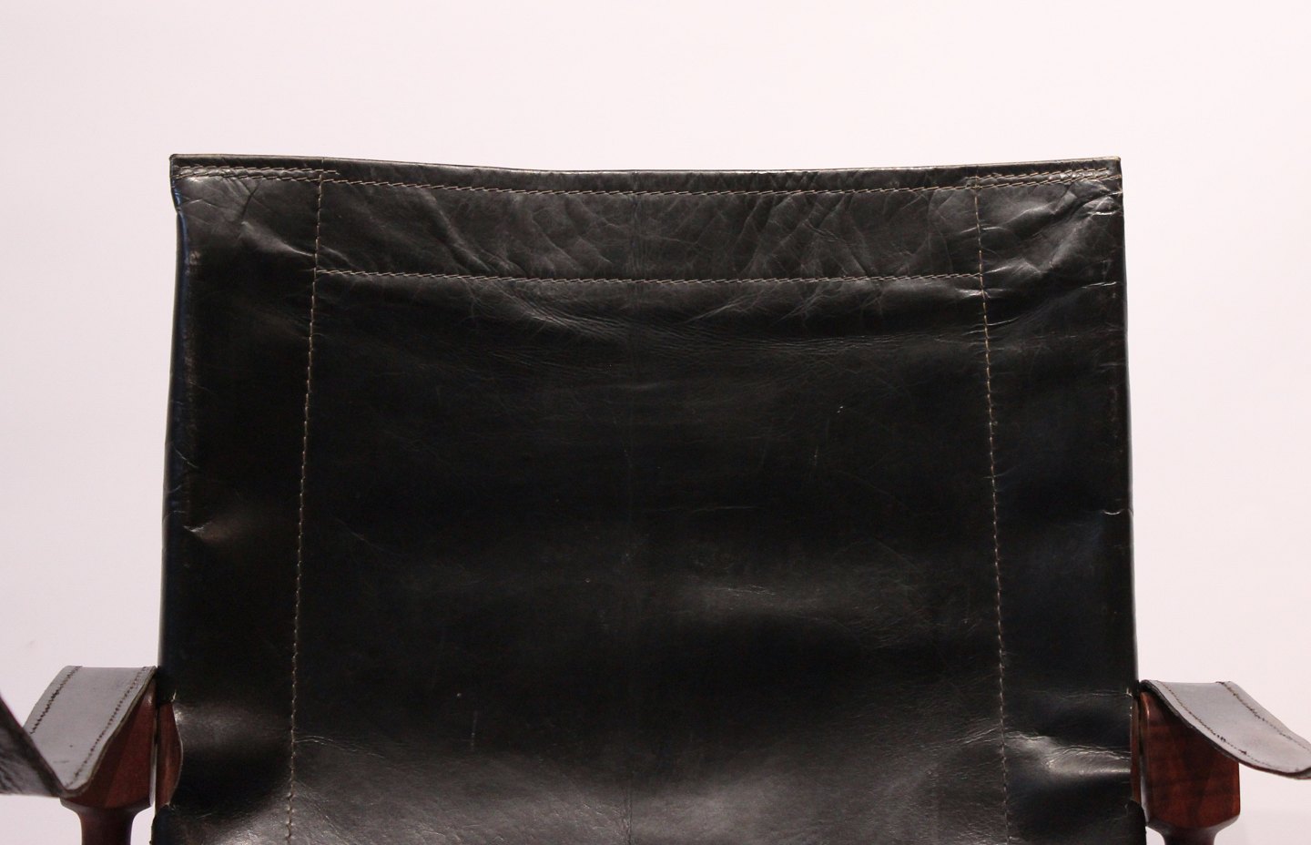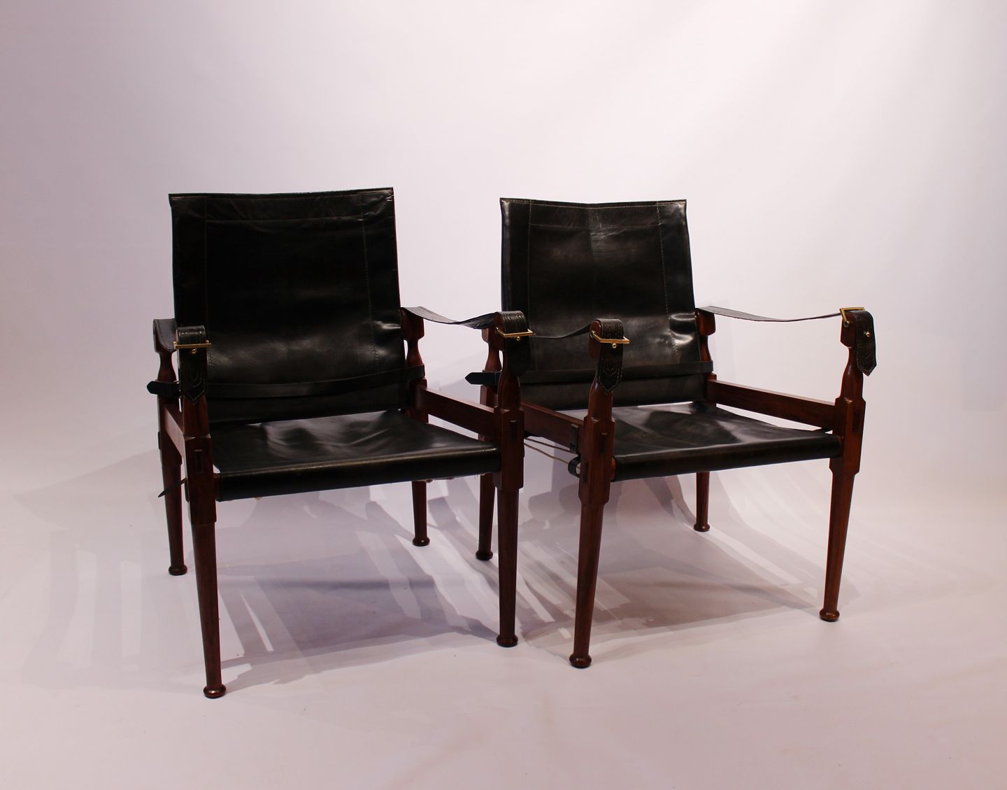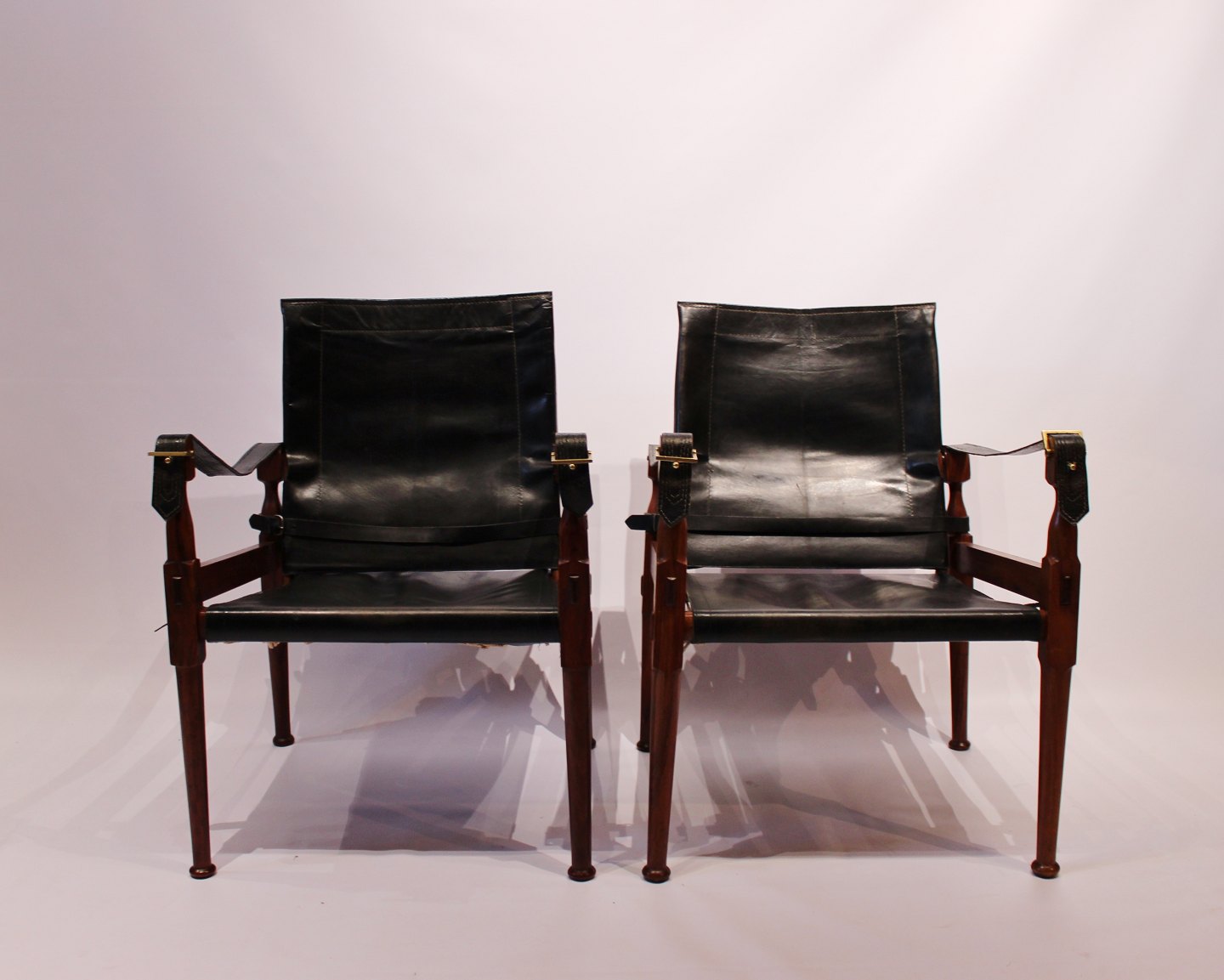 SolgtEt par Safari stole af M. Hayat & Brothers i valnød og sort patineret kernelæder fra Pakistan omkring 1970erne. Stolene er i flot brugt stand.