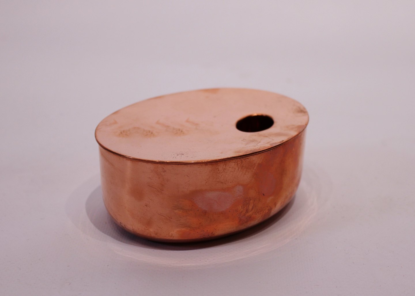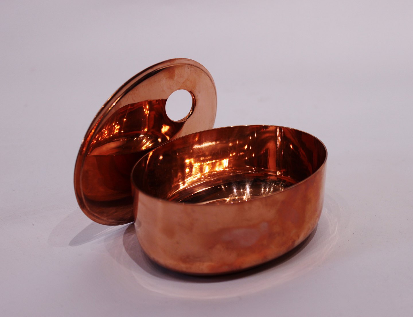 SolgtLille skål med låg i kobber designet af Ilse Crawford i 2012 for Georg Jensen.