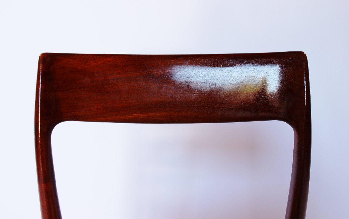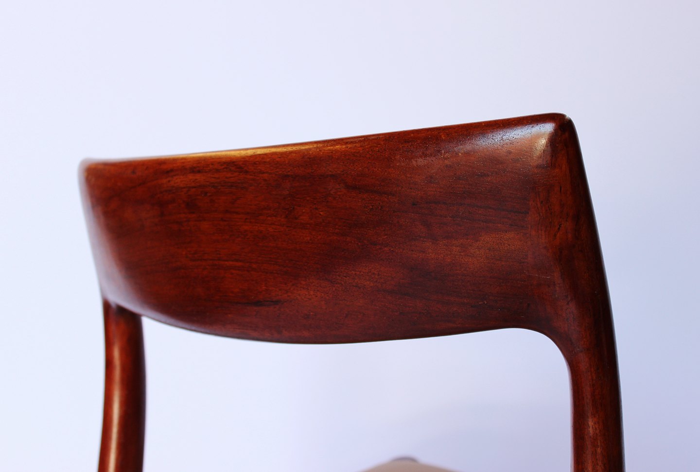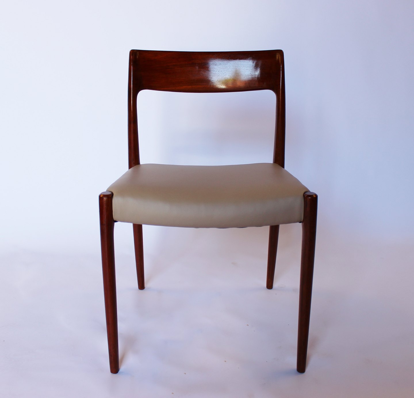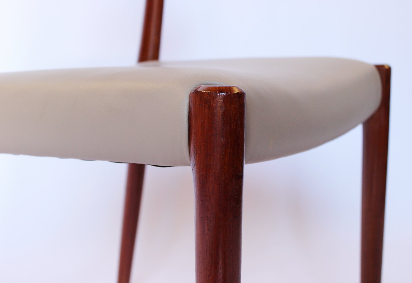 SoldSet of 6 dining chairs, model 77, in teak and light grey leather designed by N.O. Møller and manufactured by J.L. Møller furniture factory in the 1960s.