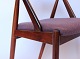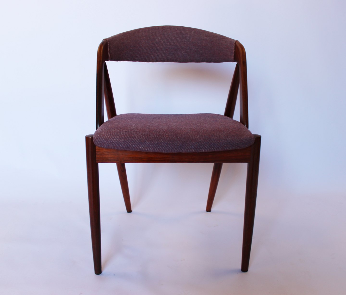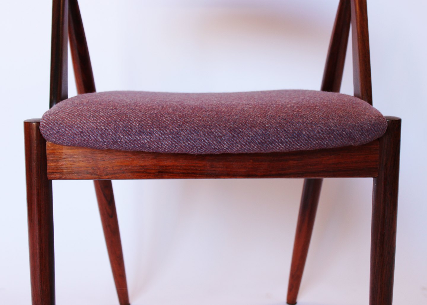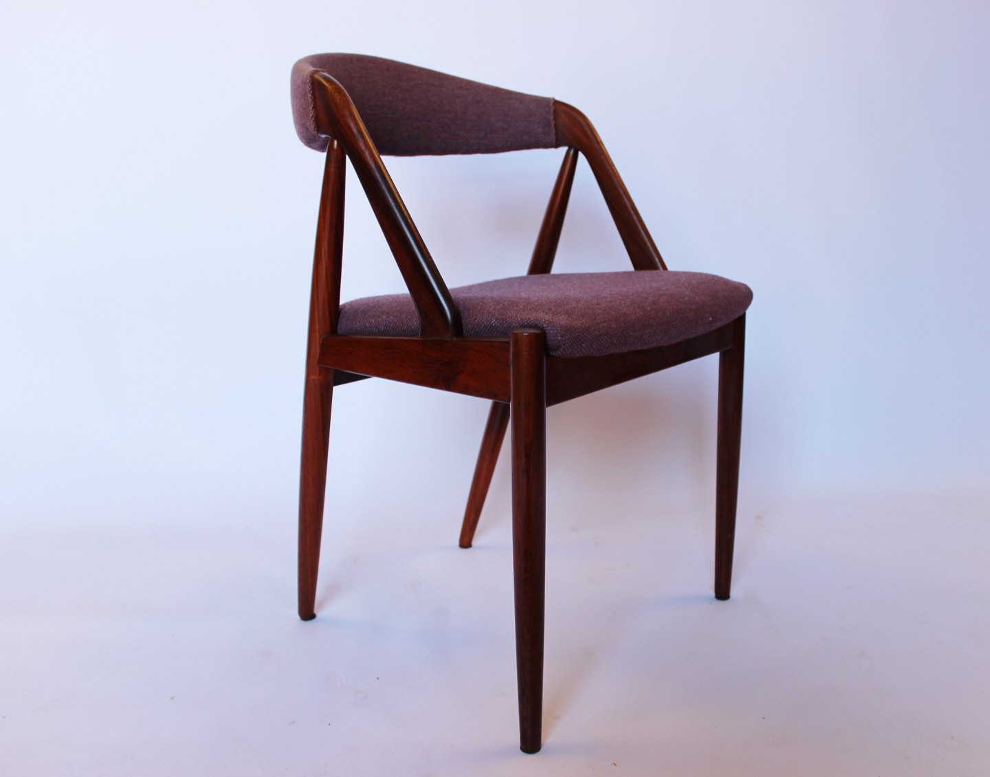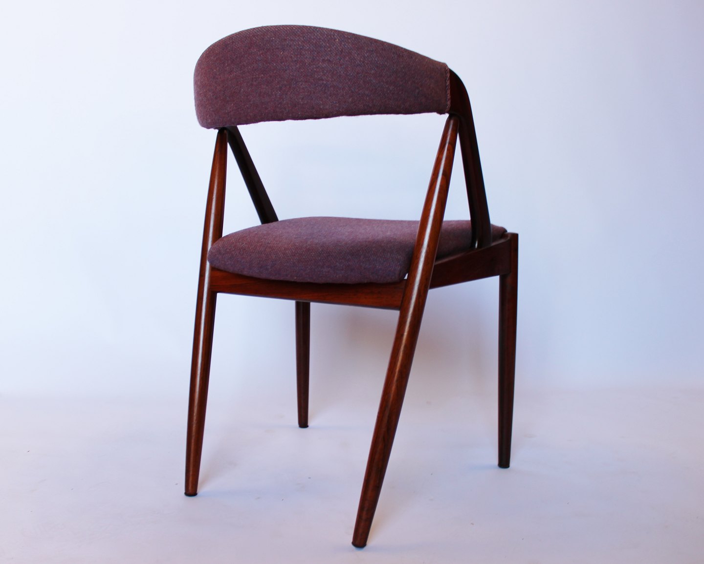 SolgtEt sæt af fire spisestuestole, model 31, designet af Kai Kristiansen i 1956 og fremstillet hos Schou Andersen i 1960erne. Stolene er i palisander og polstret med lilla stof.
