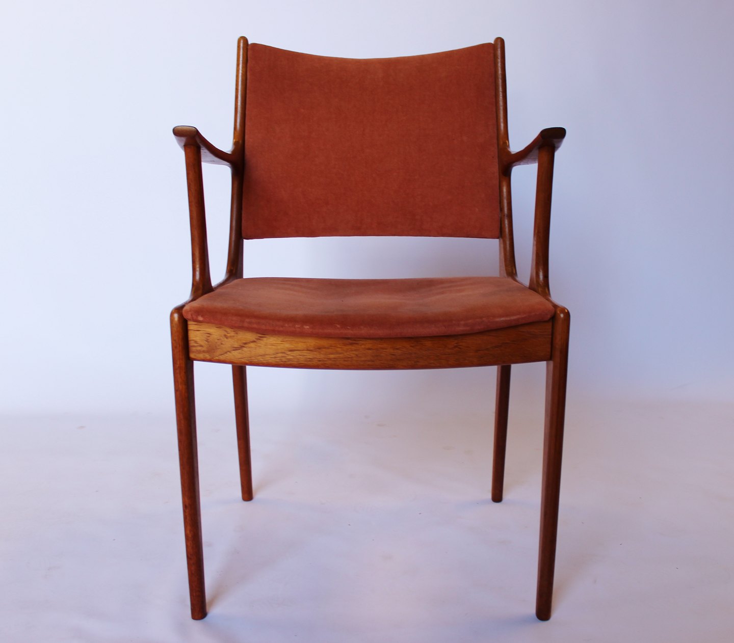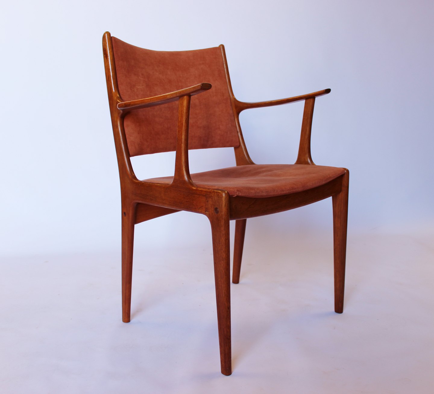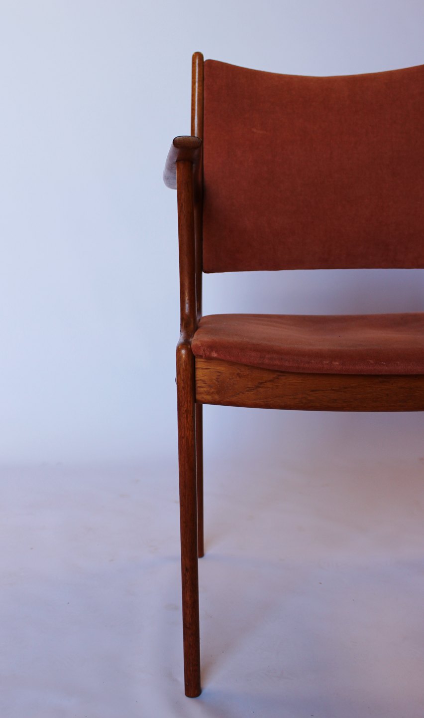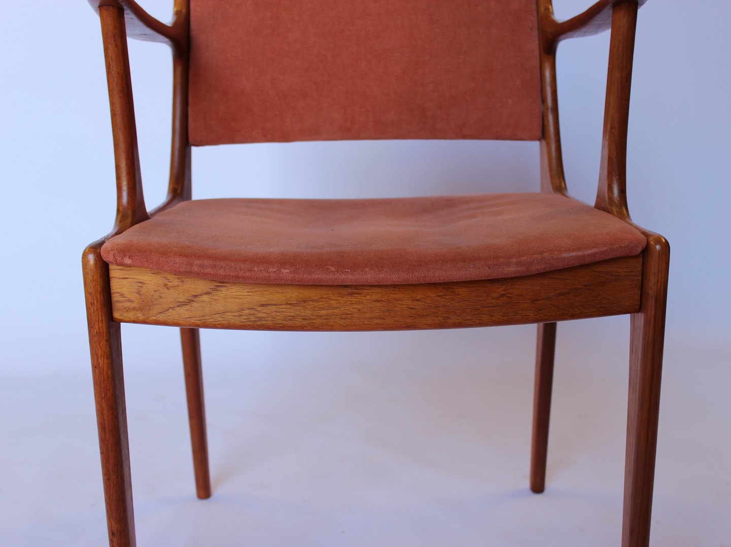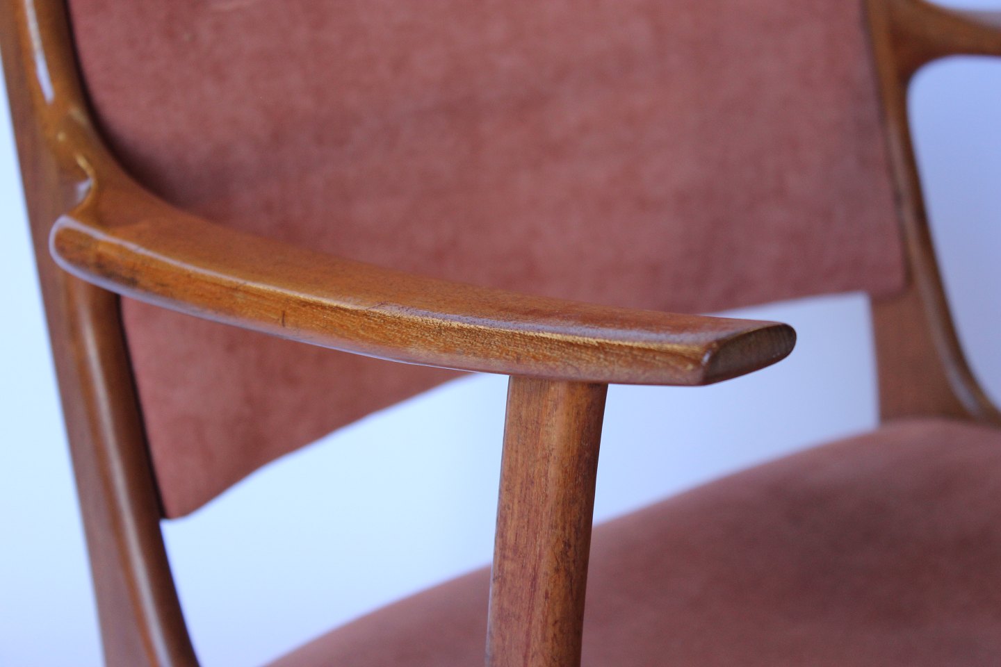 SoldSet of 2 arm chairs in teak and pale pink suede designed by Johannes Andersen and manufactured by Uldum Furniture Factory in the 1960s.