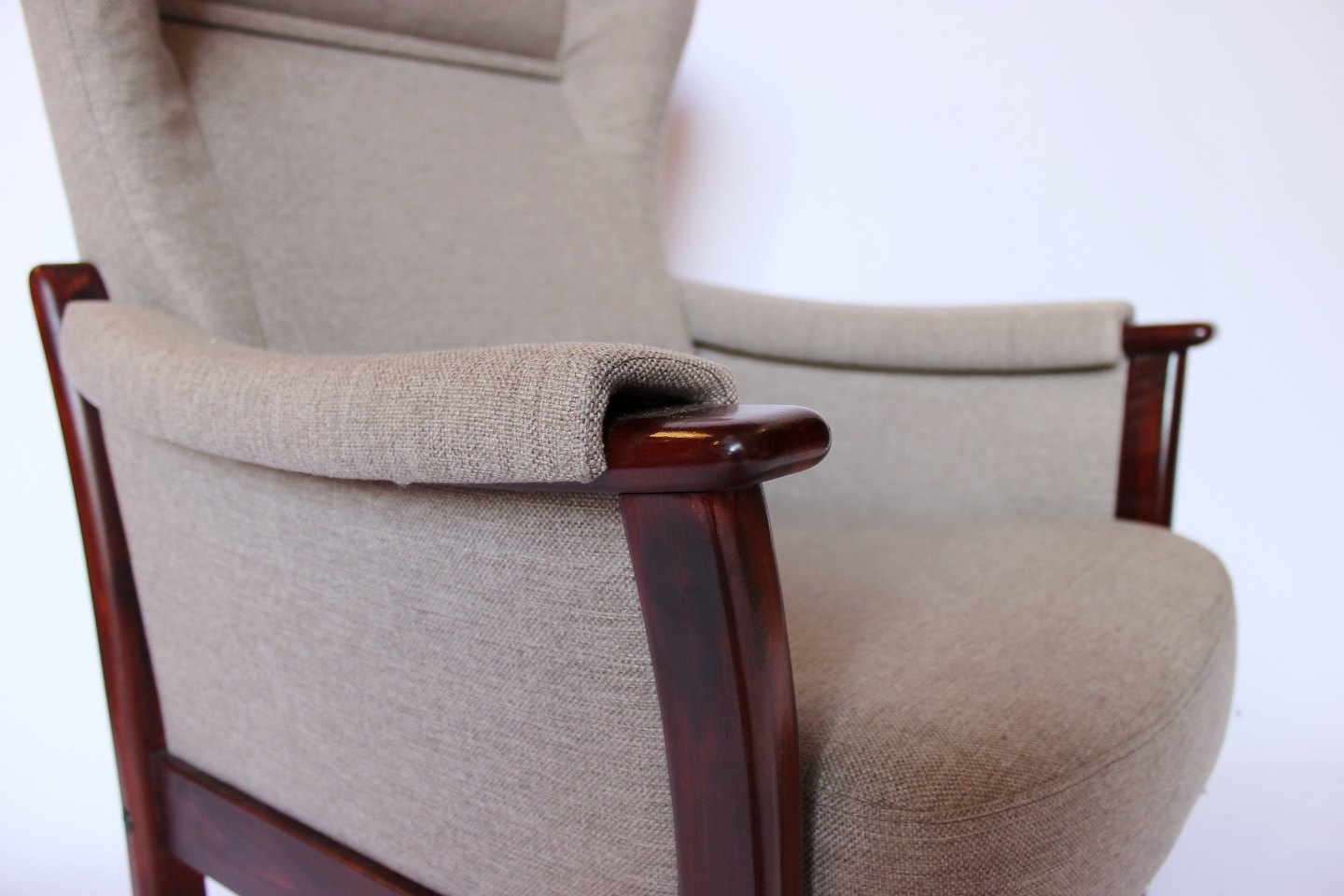 This set of two recliners with matching stools is the perfect combination of comfort, functionality and style. They have been newly upholstered in a beautiful light gray fabric, which adds a modern and fresh touch to the furniture. The dark wood contributes a warm and natural contrast to the light fabric, and it emphasizes the timeless design. The chairs are designed to recline for extra comfort and flexibility, and the height of the stools can be adjusted to meet individual needs. With their elegant appearance and practicality, this set of recliners and stools will be a welcome addition to any home where both comfort and aesthetics are valued.
