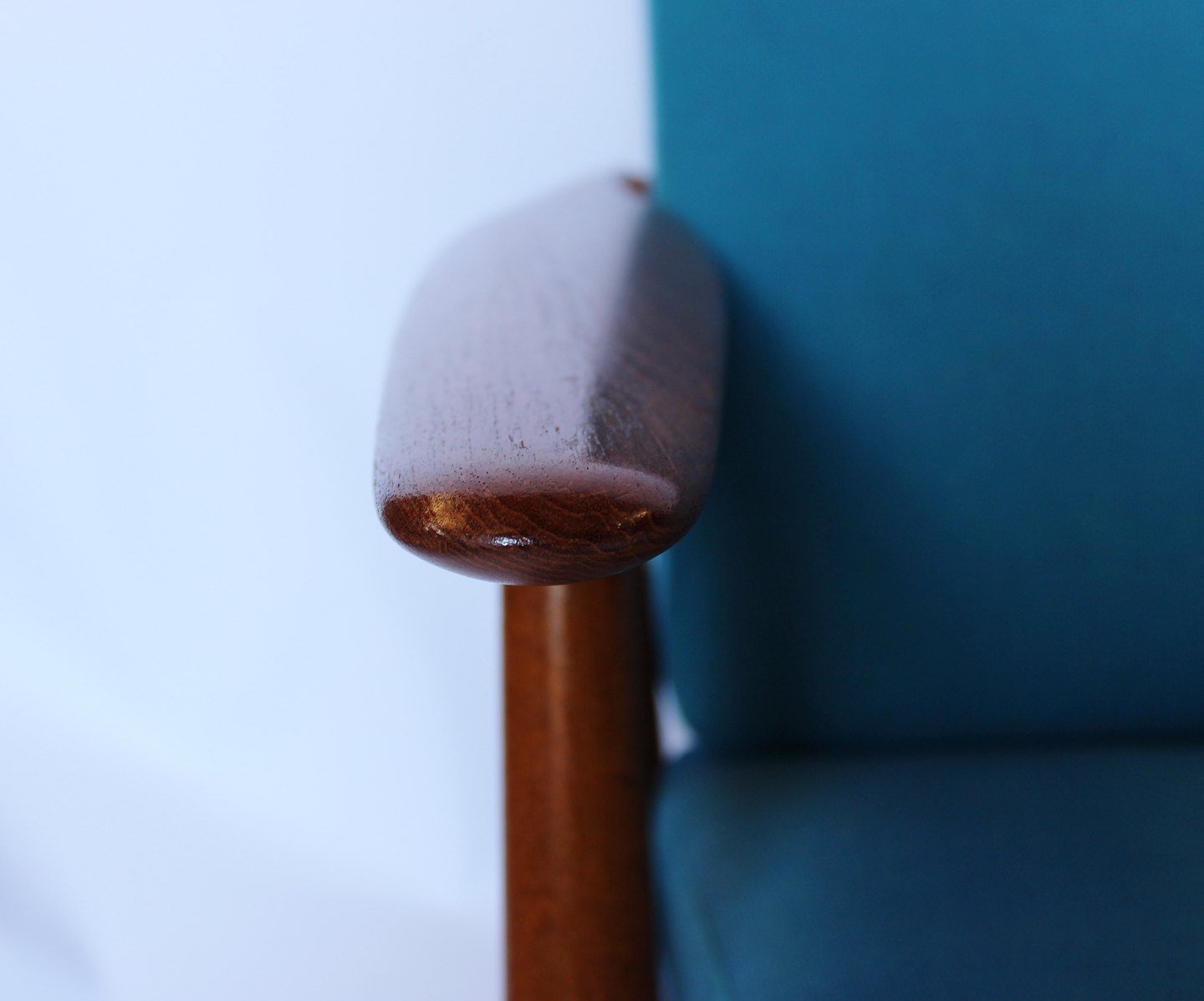 "The Cigar" 3 seater sofa, model GE240/3 designed by Hans J. Wegner and manufactured by Getama in the 1960s. The sofa is of teak and upholstered in dark blue Hallingdal.