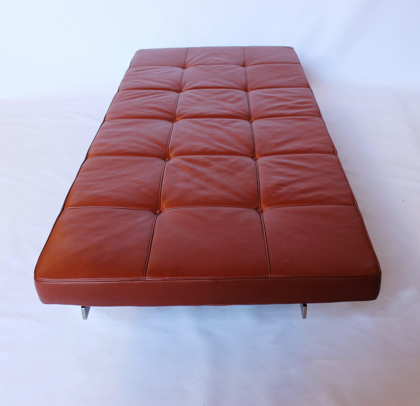 With its timeless design and luxurious cognac leather upholstery, the daybed exudes a sublime elegance. It is simple and streamlined, which is characteristic of Kjærholm's signature style. It is not just a piece of furniture, but a work of art that captures attention with its simple yet sophisticated appearance.