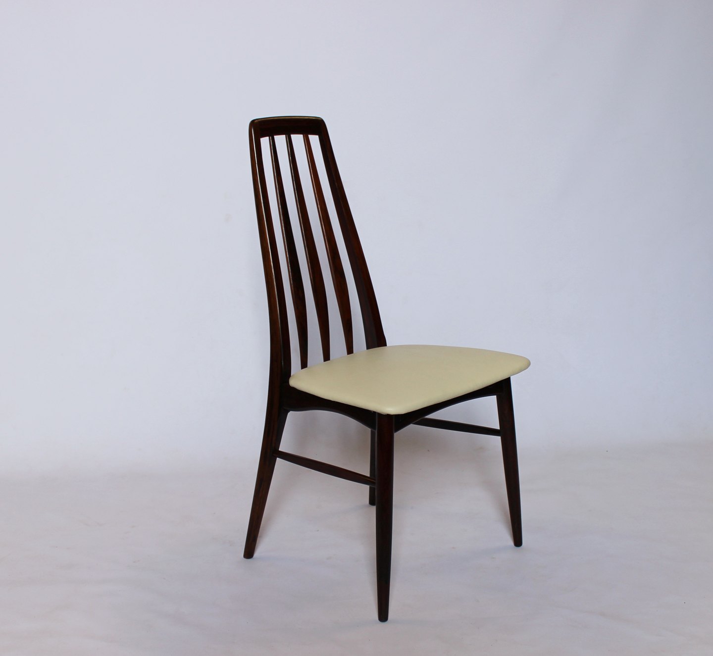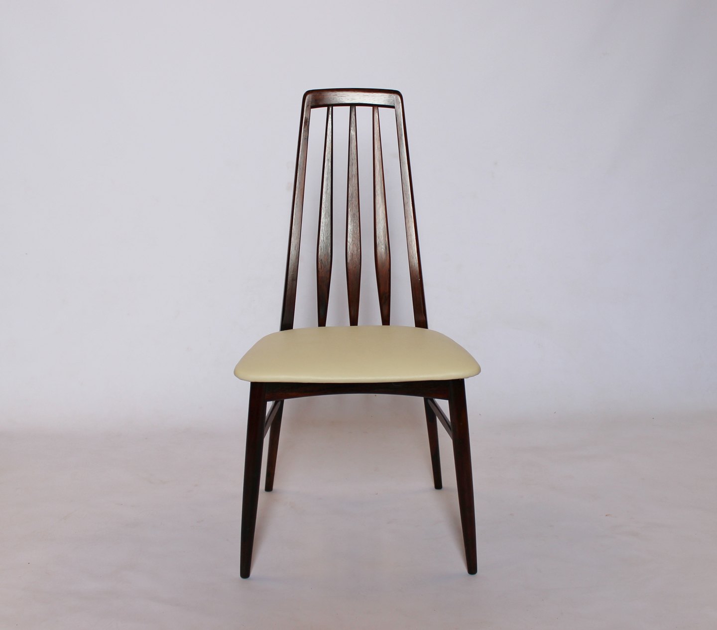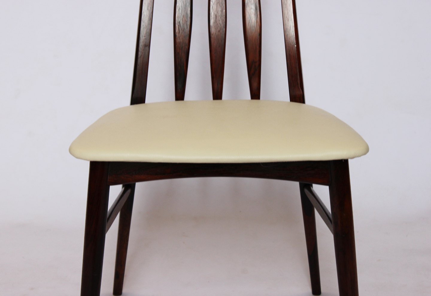 SoldSet of 6 Eva dining chairs in rosewood and white leather seats designed by Niels Koefoed and manufactured Koefoed Furniture factory, Hornslet in the 1960s.