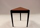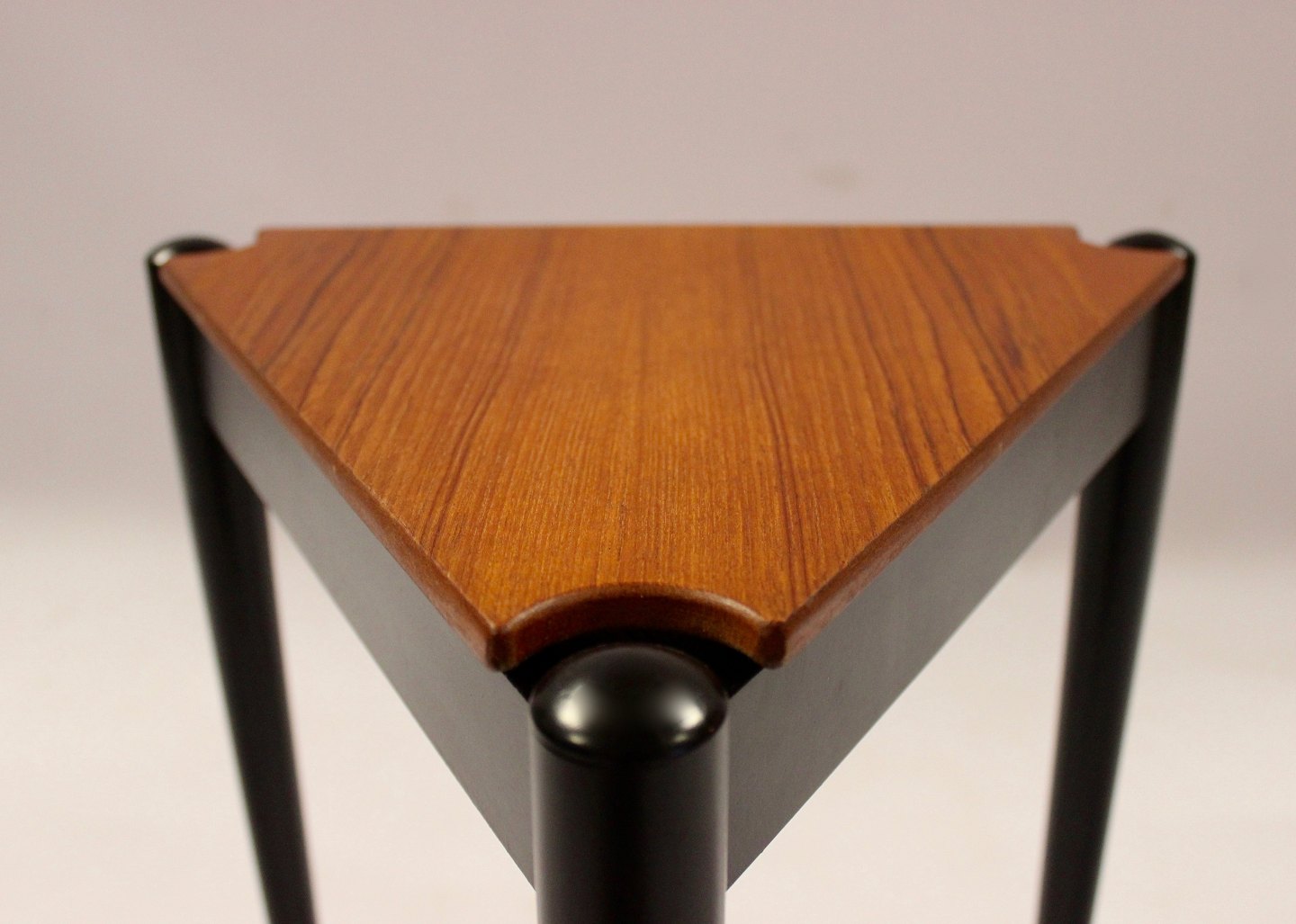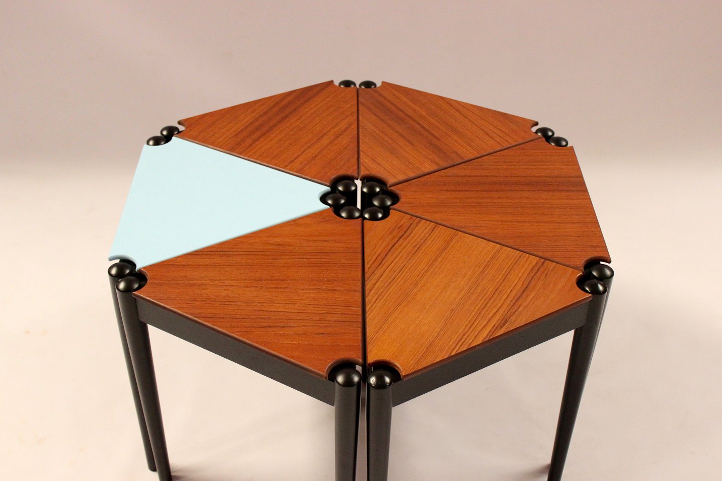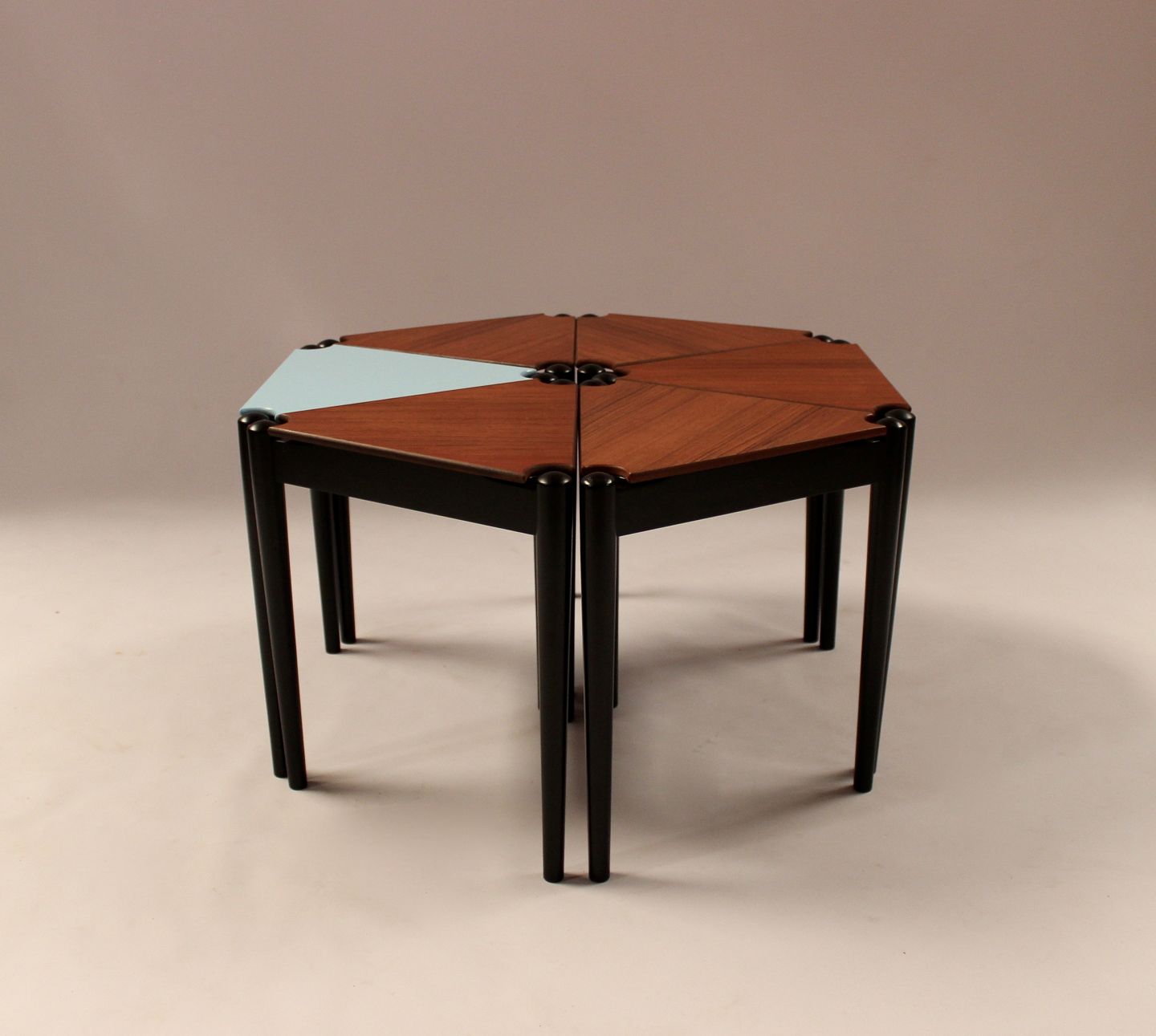 Sofabordet, bestående af 6 trekantede sideborde i teak og blålakeret træ med sorte malede ben, designet af Helge Møller i 1980'erne, udstråler en unik og moderne æstetik, der fanger øjet.