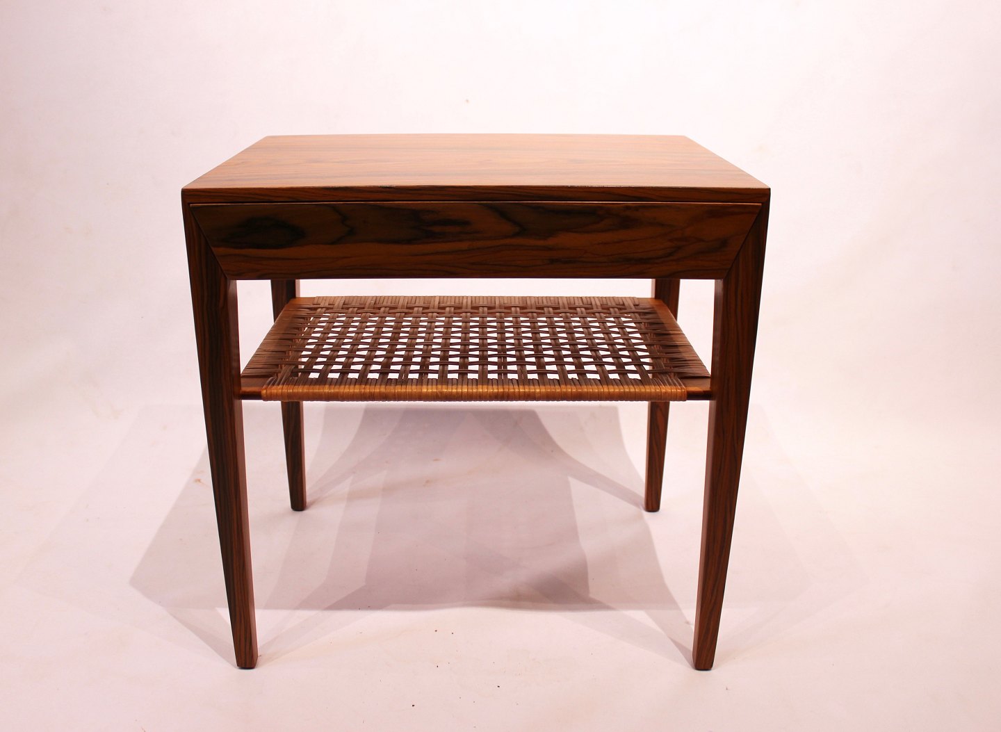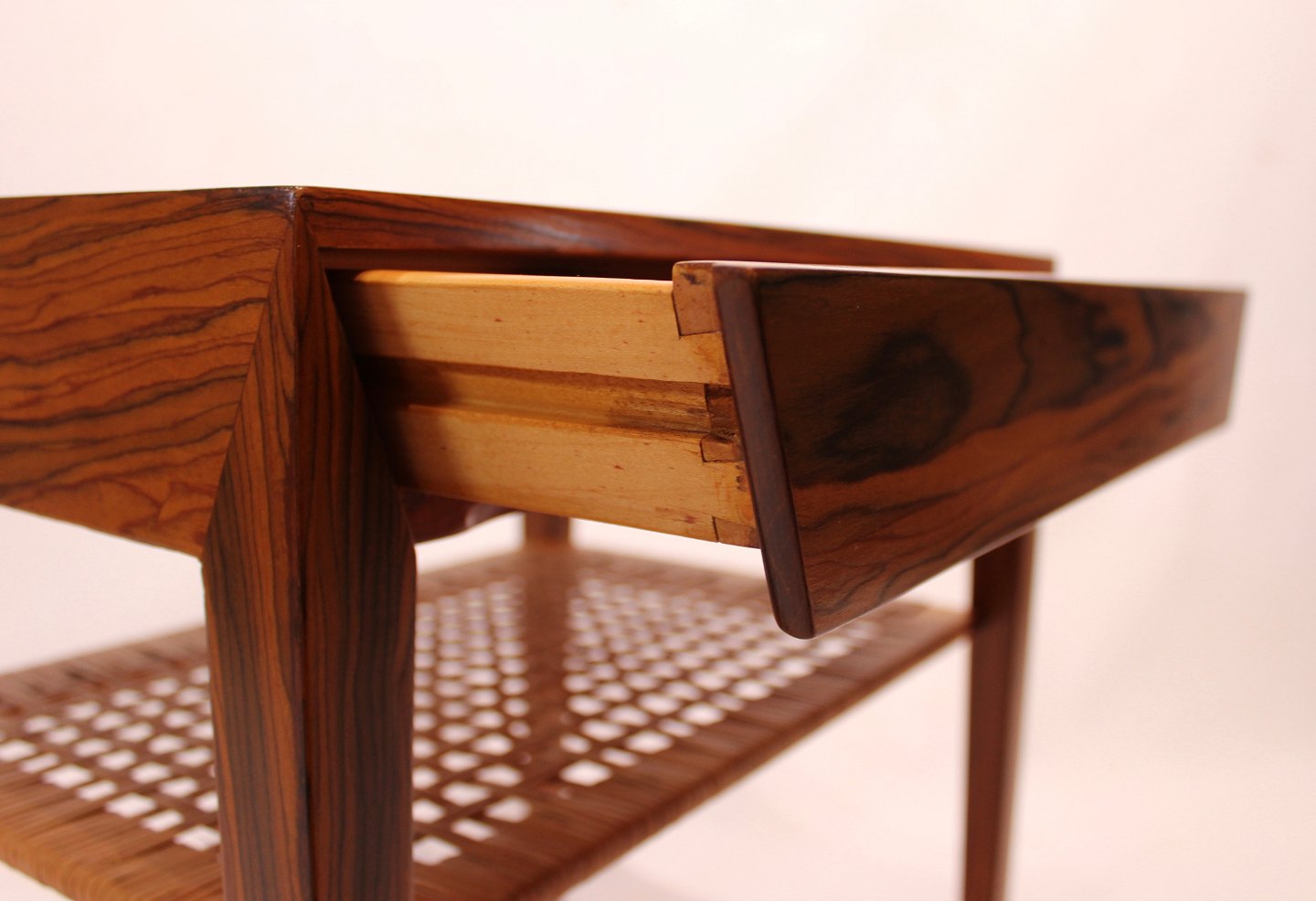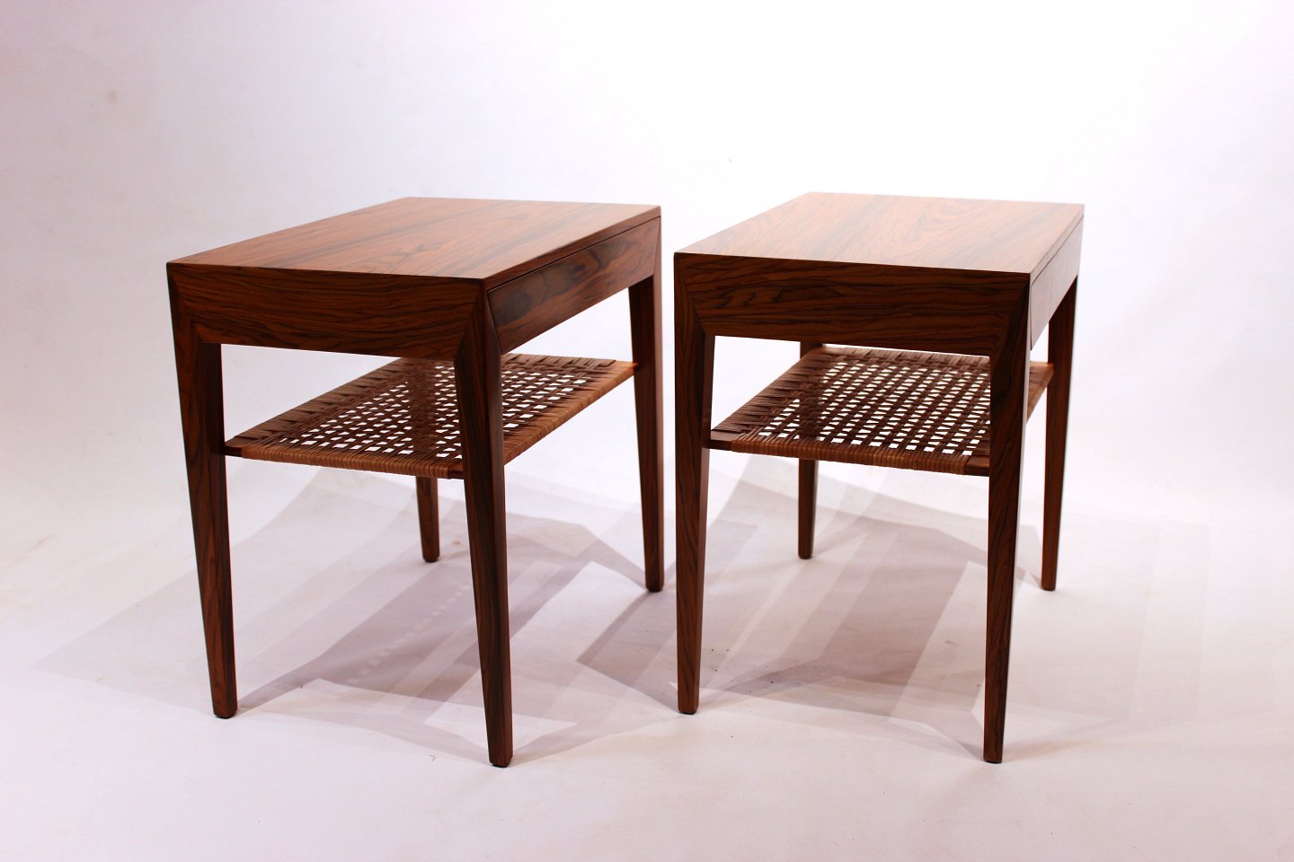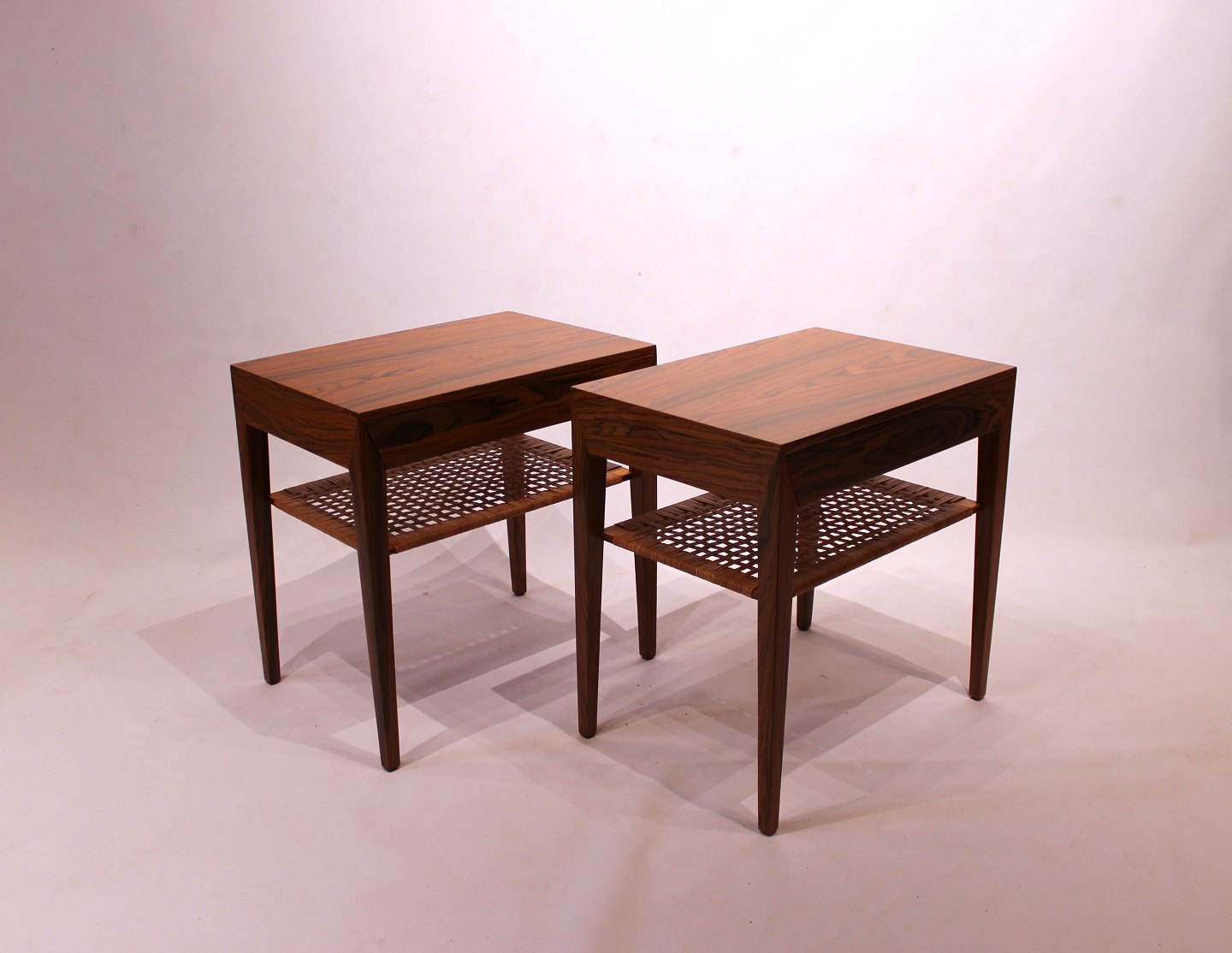 SoldA set of bedside tables in rosewood and papercord shelf designed by Severin Hansen and manufactured by Haslev furniture factory in the 1960s. The tables are in great vintage condition.