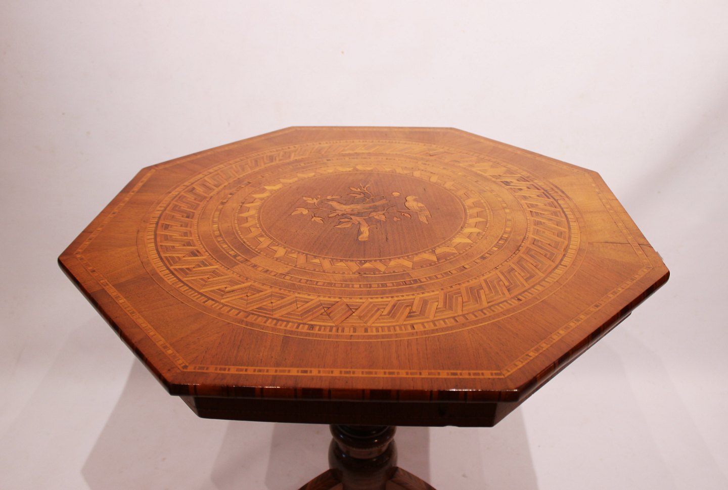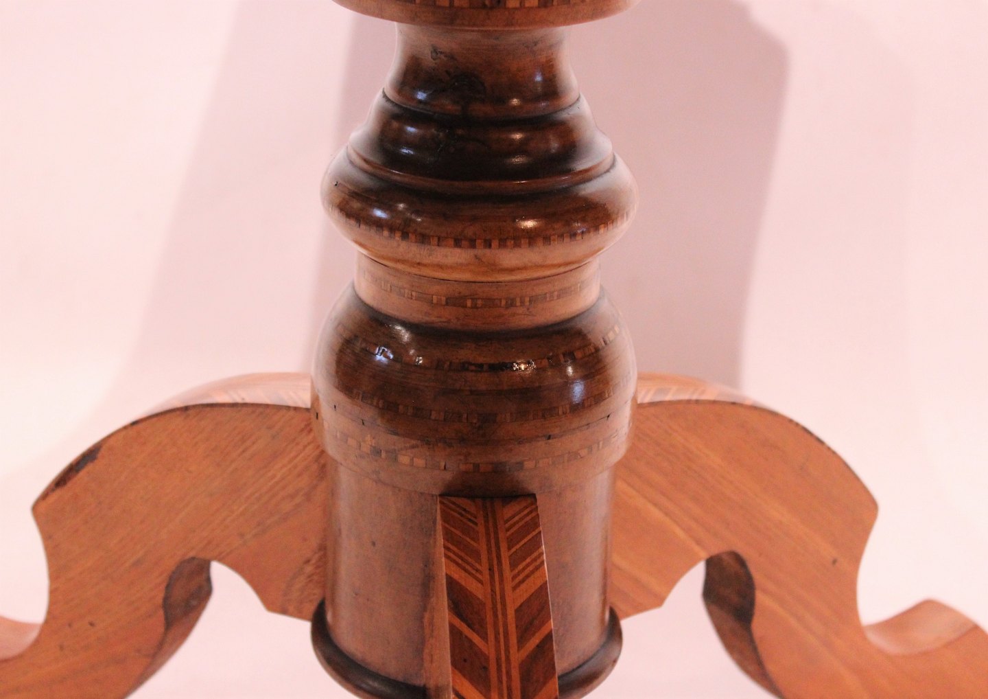 Italian lamp table of handpolished mahogany with inlaid intarsia of fruit wood from the 1880s. The table is in great vintage condition.