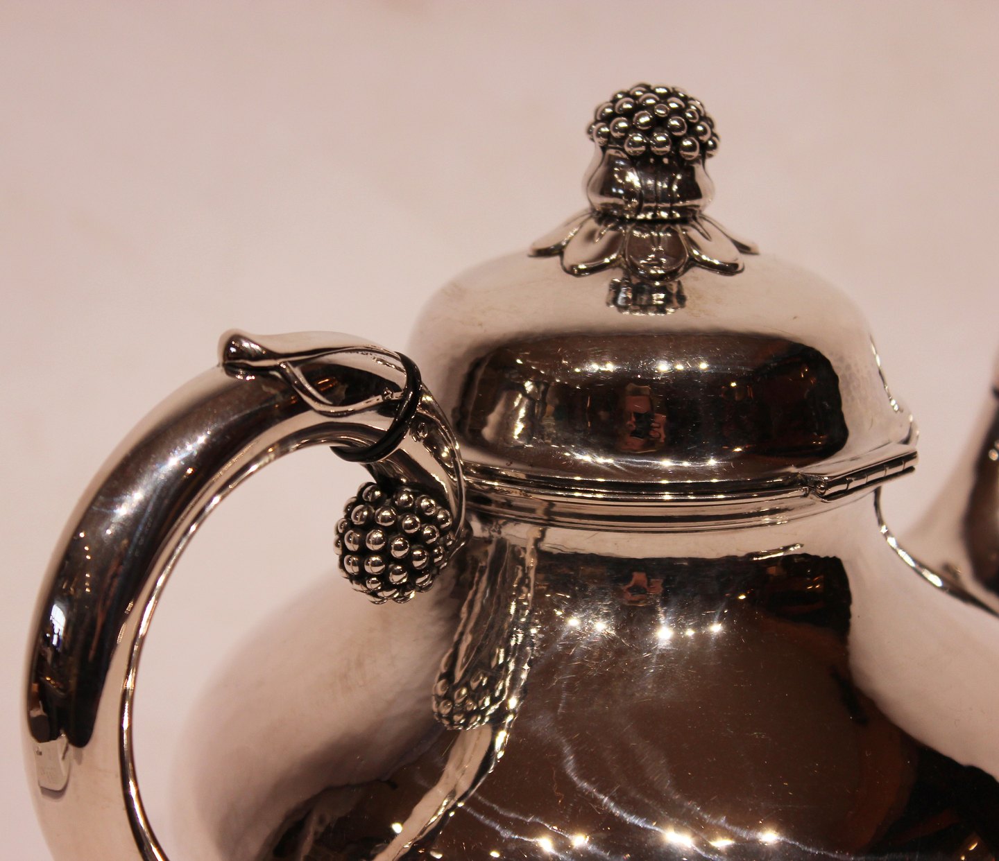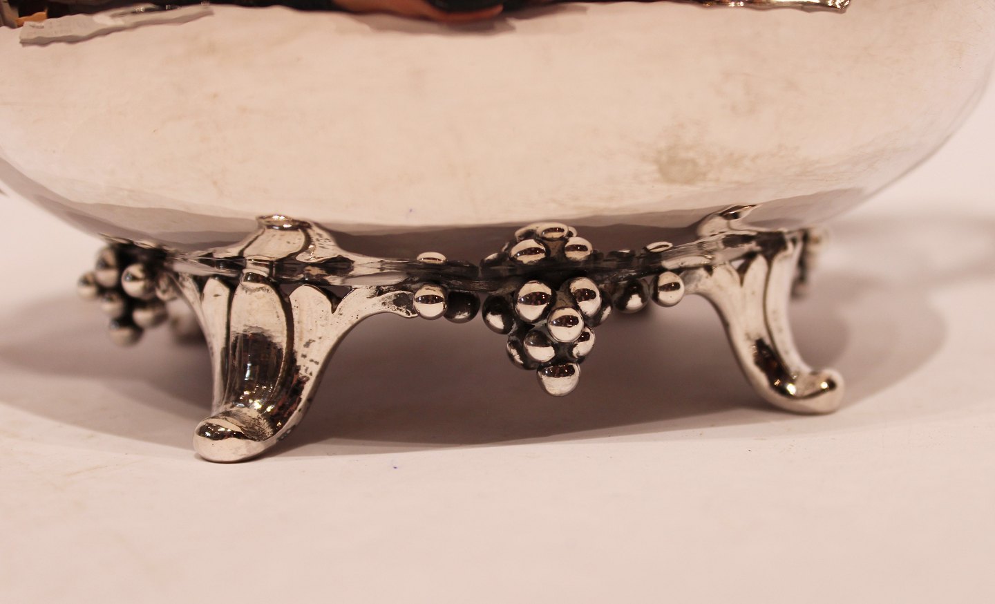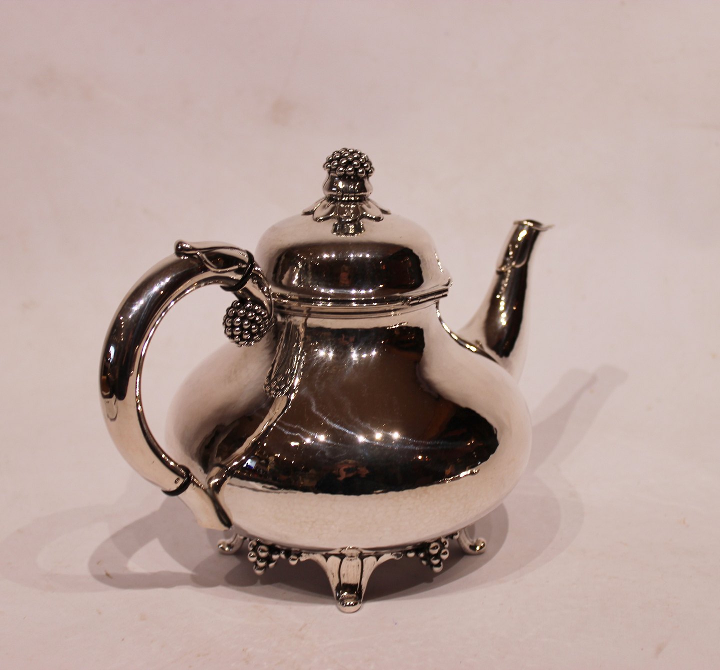 Tea pot of hallmarked silver decorated with grapes and on feet.