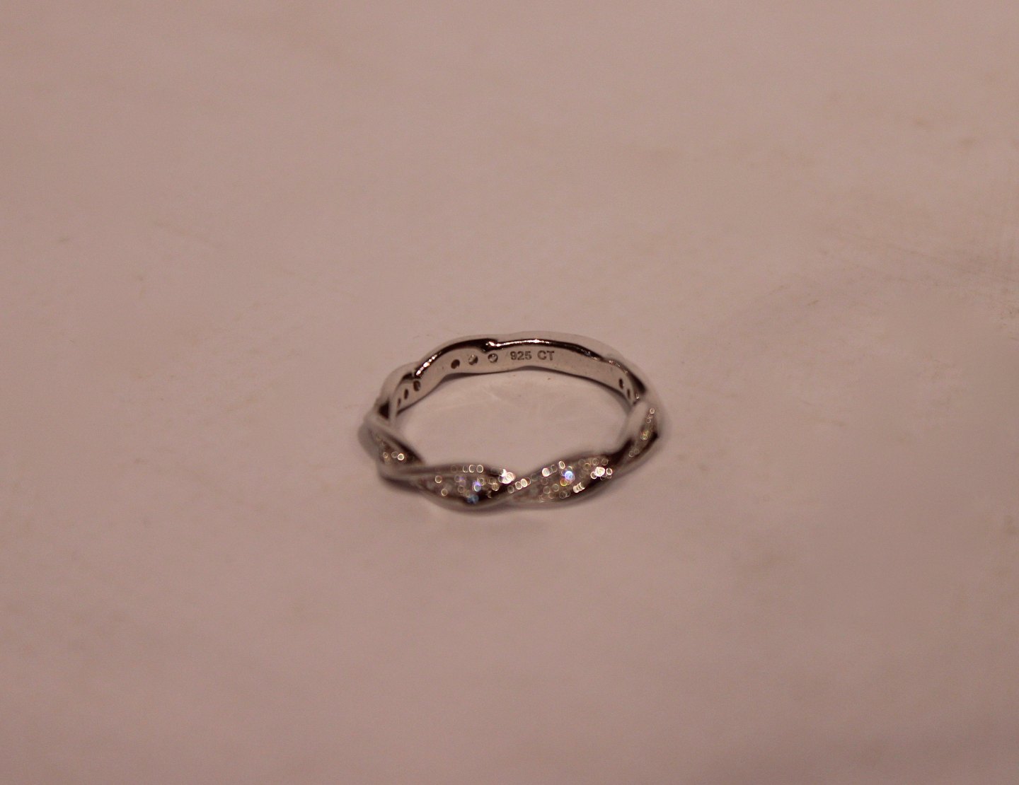 Twisted ring of 925 sterling silver with small clear stones, stamped CT.