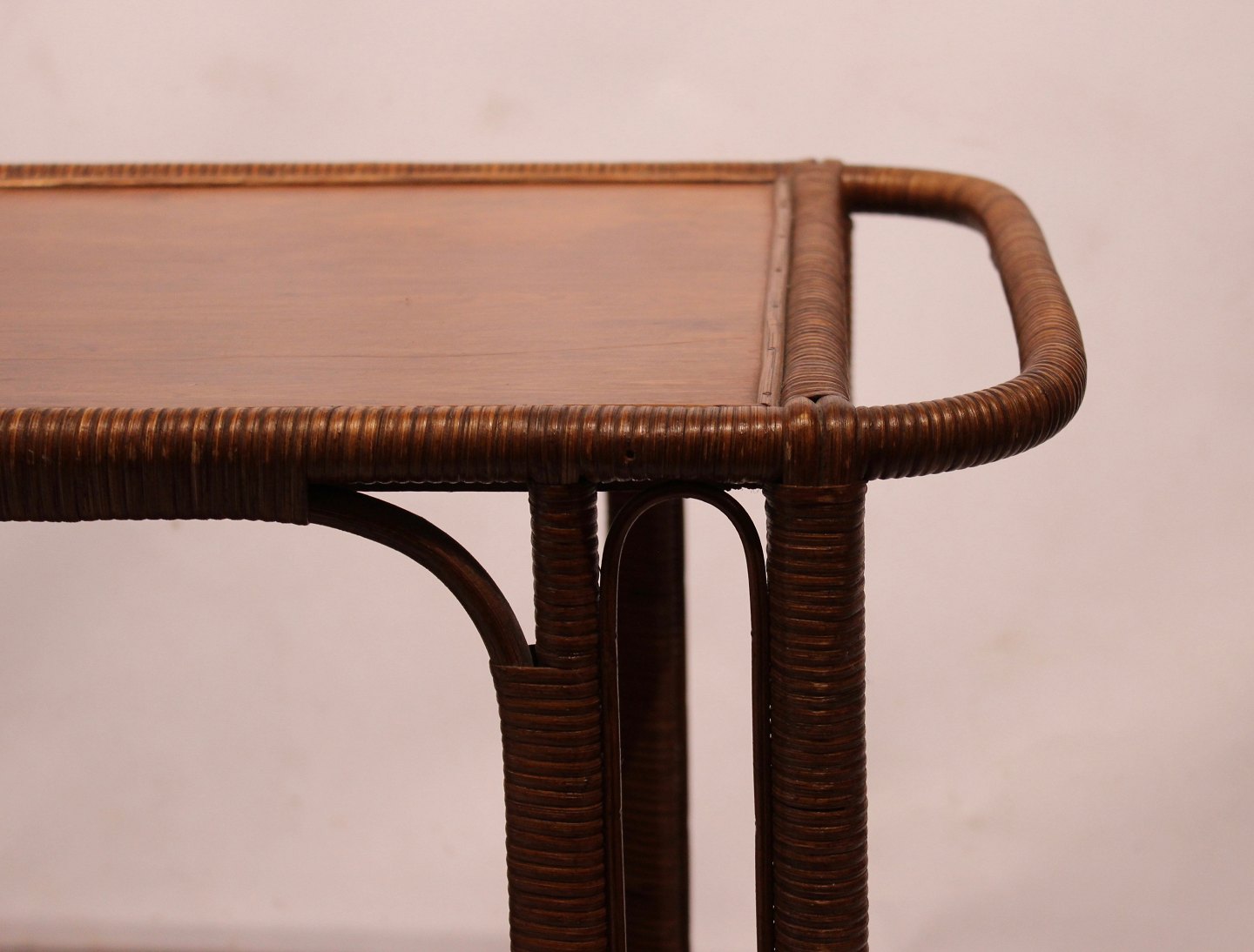 Antique french bar table of papercord and dark wood from around the 1920s. The table is in great vintage condition.