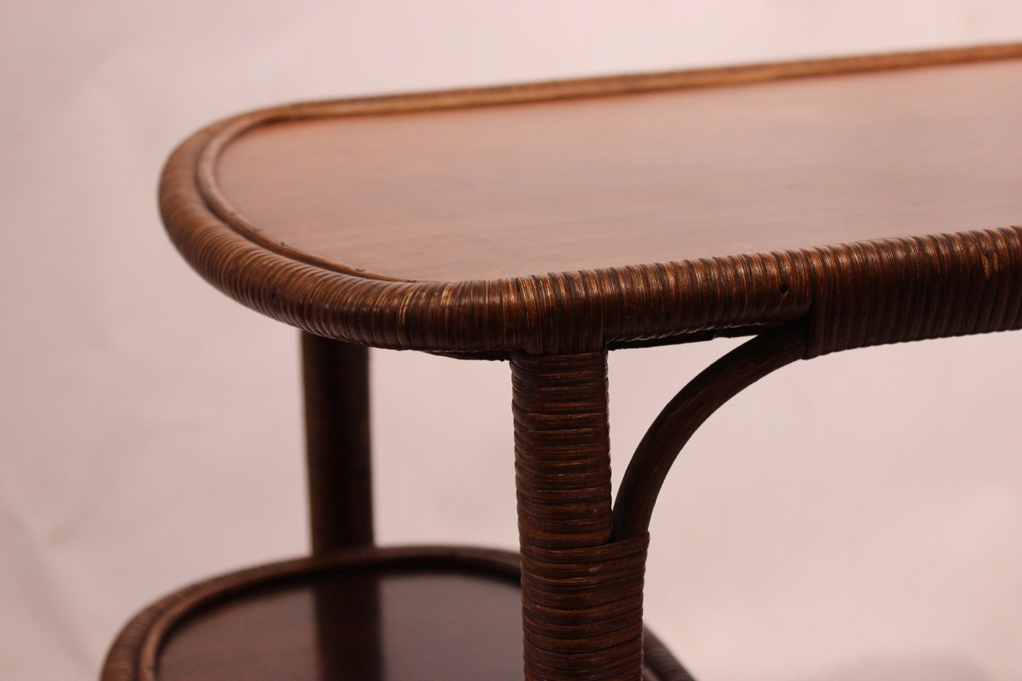 Antique french bar table of papercord and dark wood from around the 1920s.