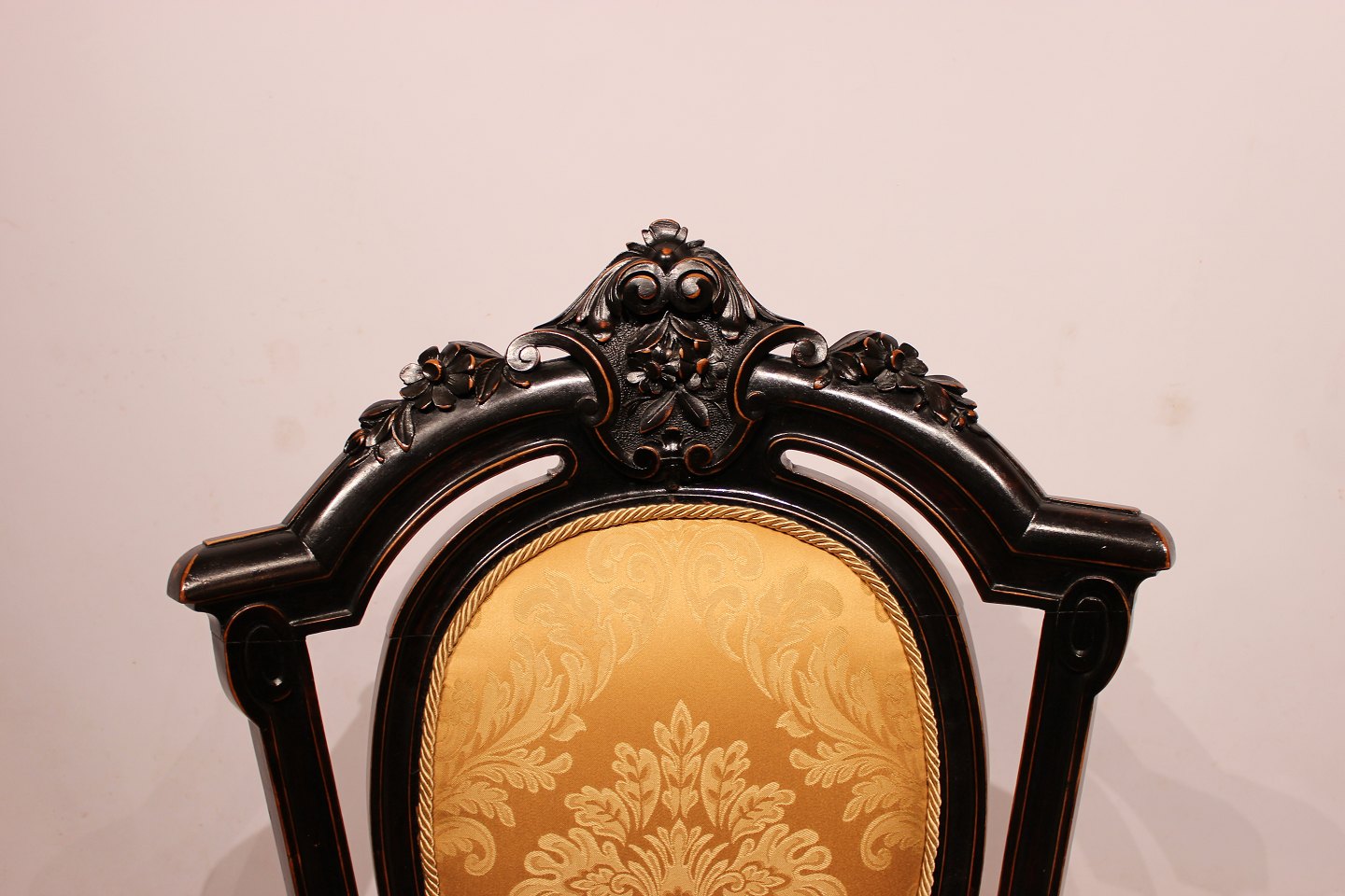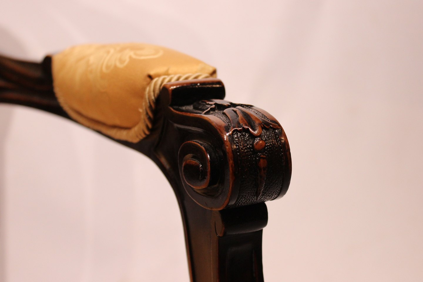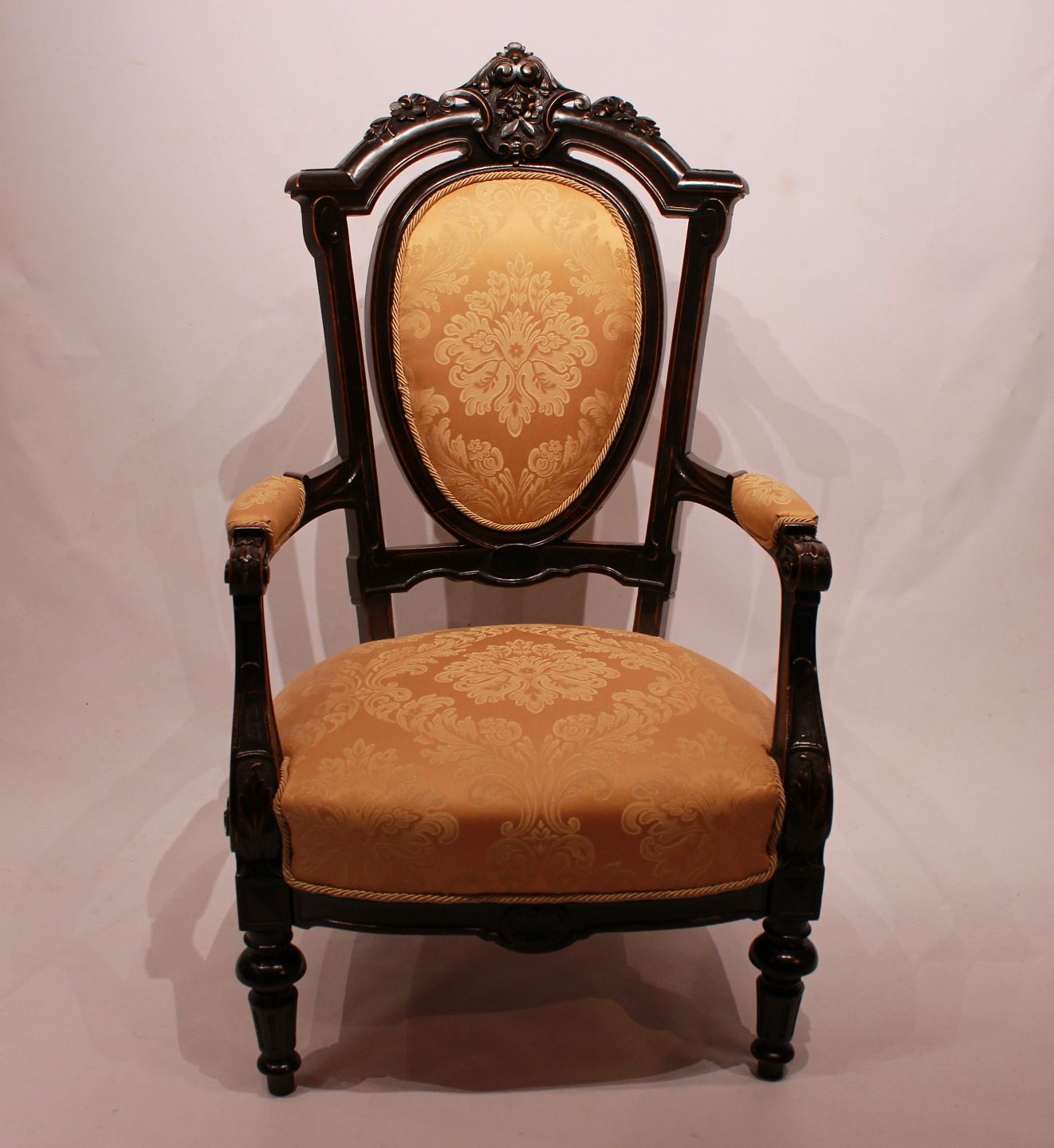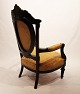 SolgtArmstol i stilen rokoko af Mahogni og gult stof. Stolen er i flot brugt stand.