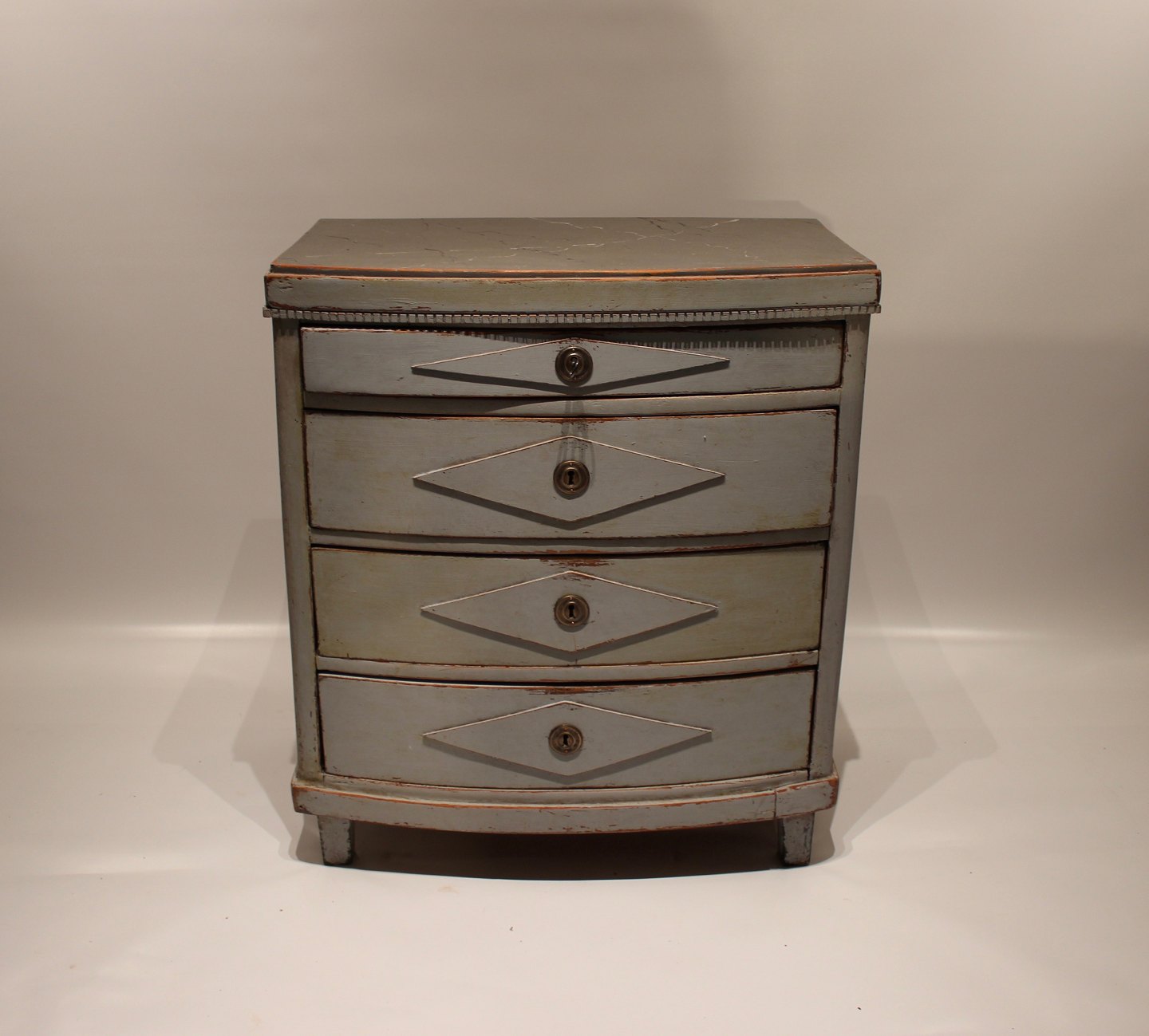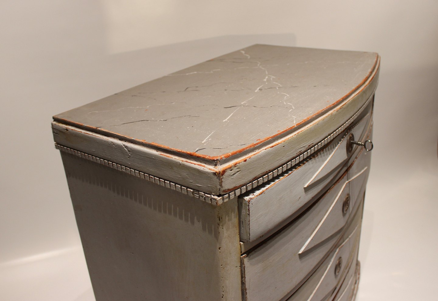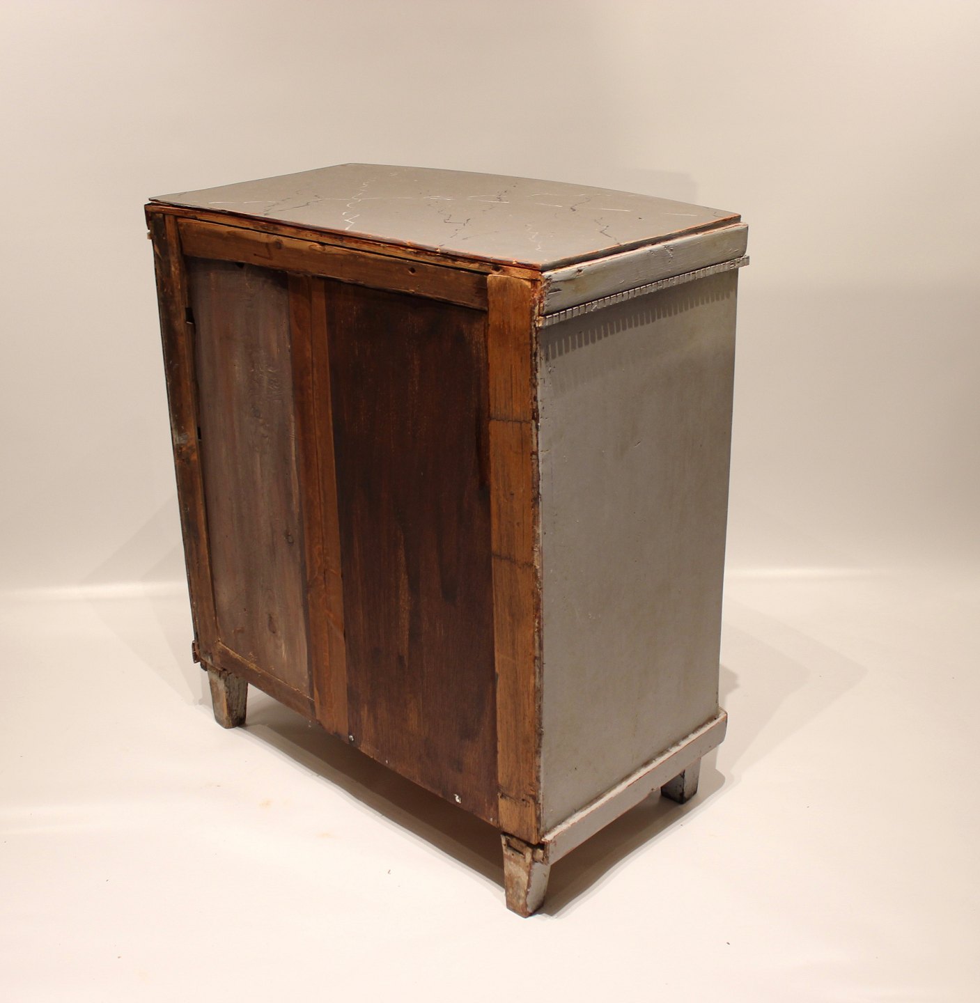 Gustaviansk gråmalet kommode med buet front og marmoreret topplade fra 1830erne.