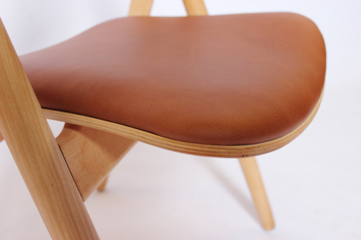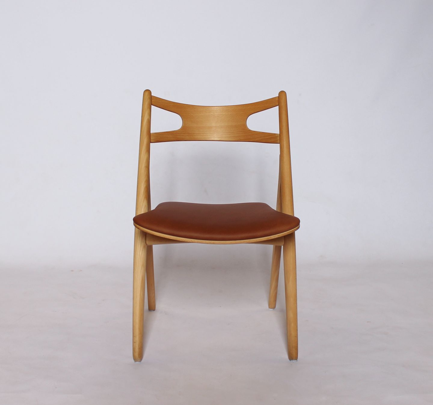 SolgtEn Savbuk stol, model CH29, designet af Hans J. Wegner i 1952 og fremstillet af Carl Hansen & Søn i 1970erne. Stolen er af sæbebehandlet bøg og med sæde af cognac elegance læder.
