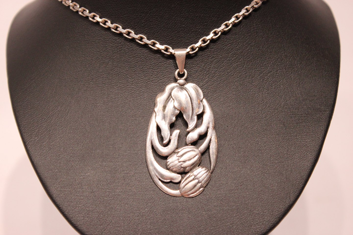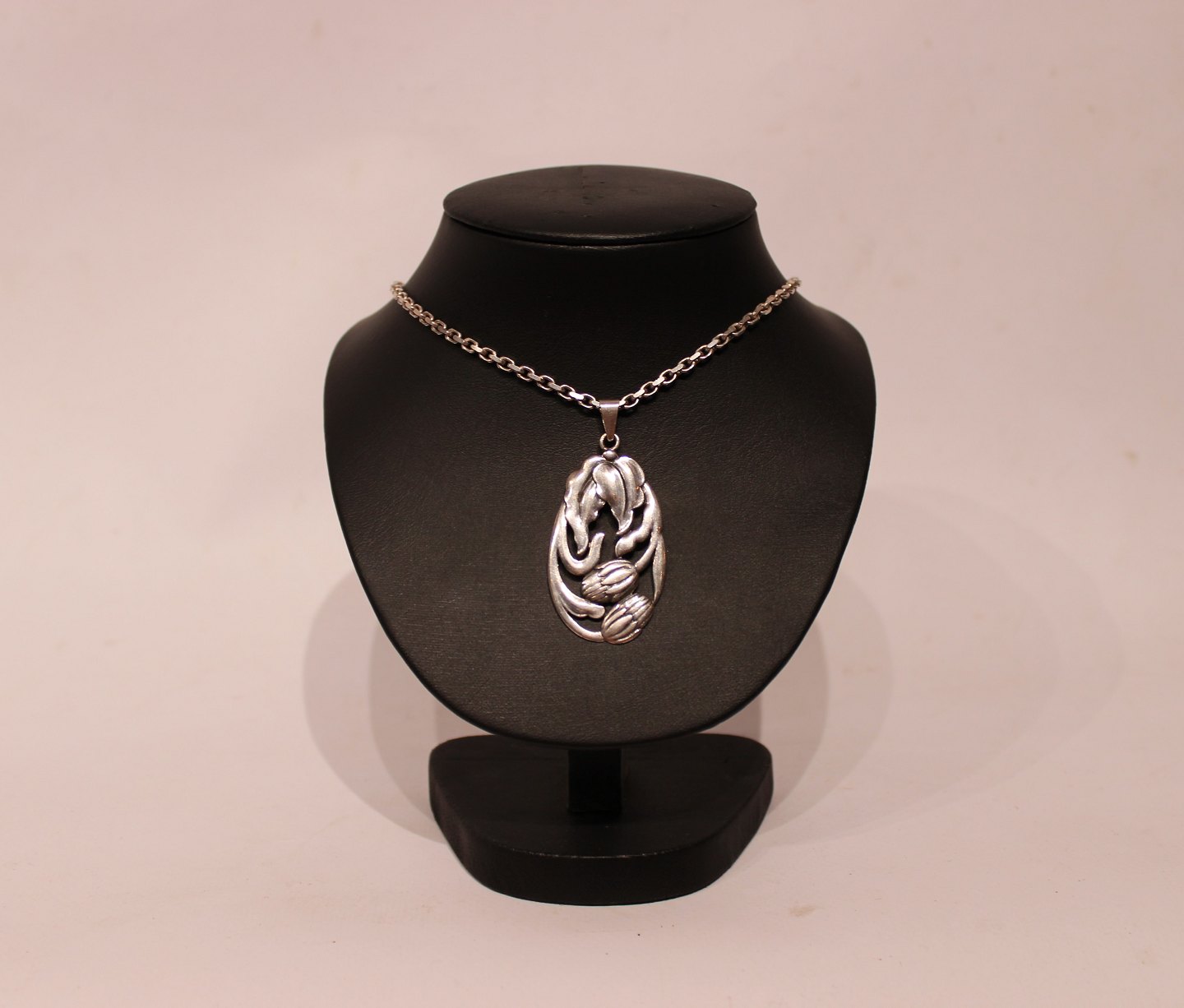 SoldSilver necklace with large pendant with flower motif.