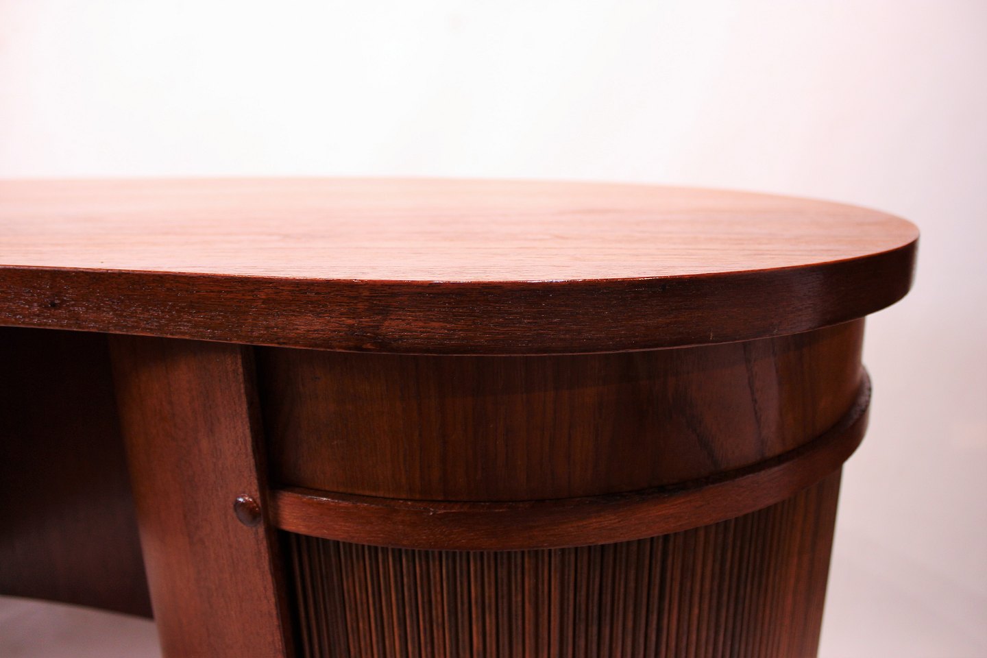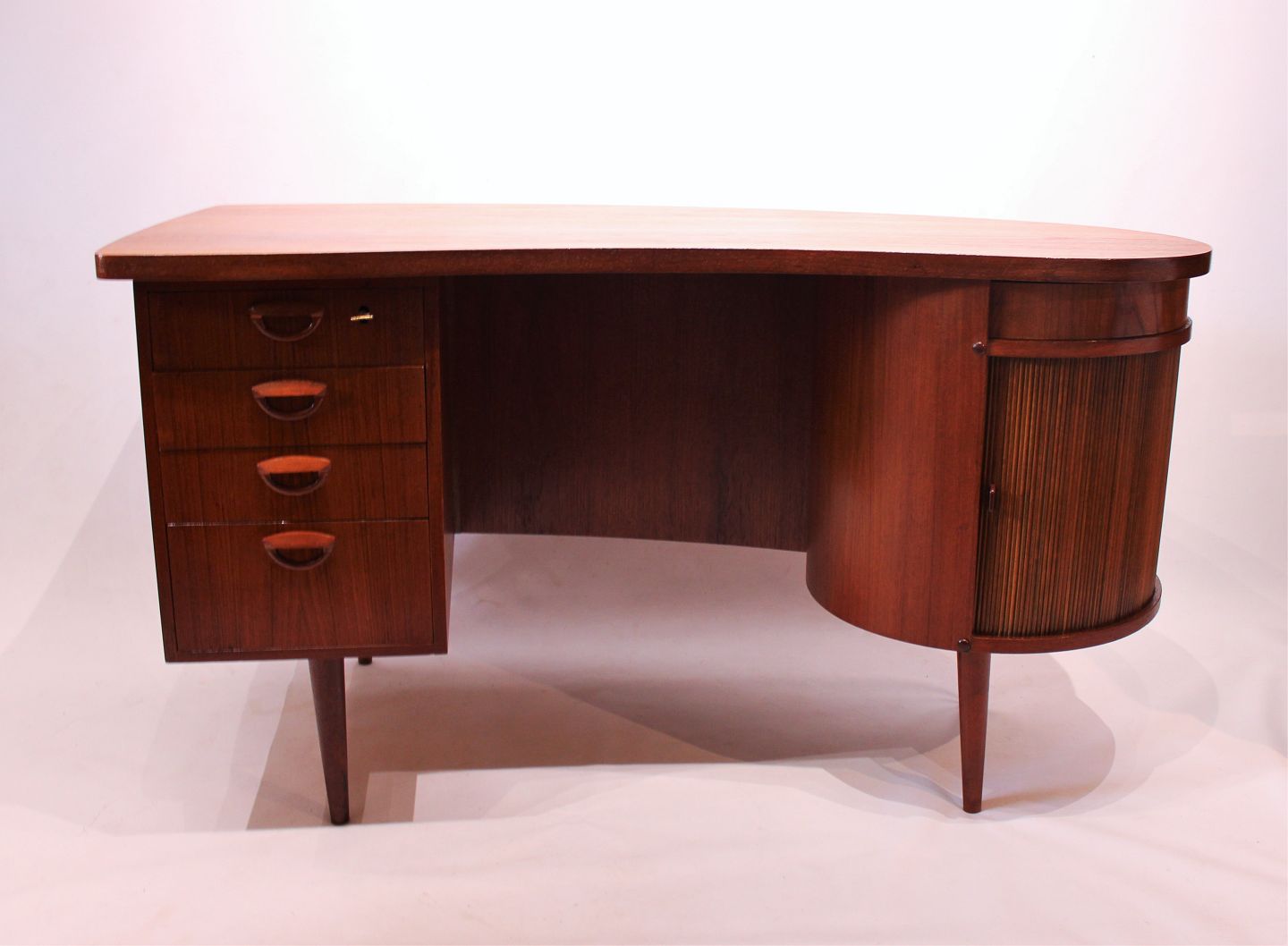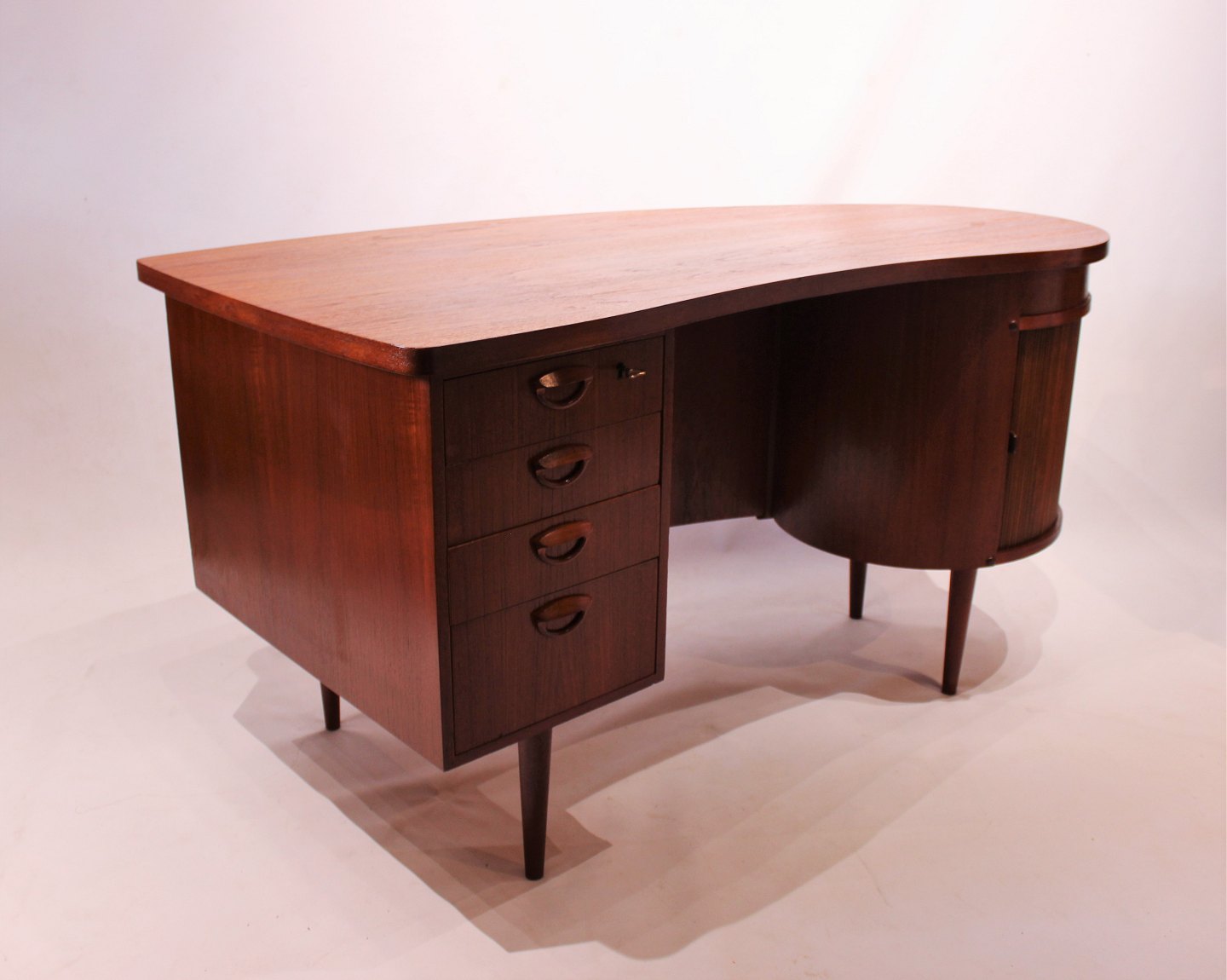 SoldDesk with sliding door and bar cabinet, of teak and designed by Kai Kristiansen. The table is from the 1960s and is in great vintage condition.