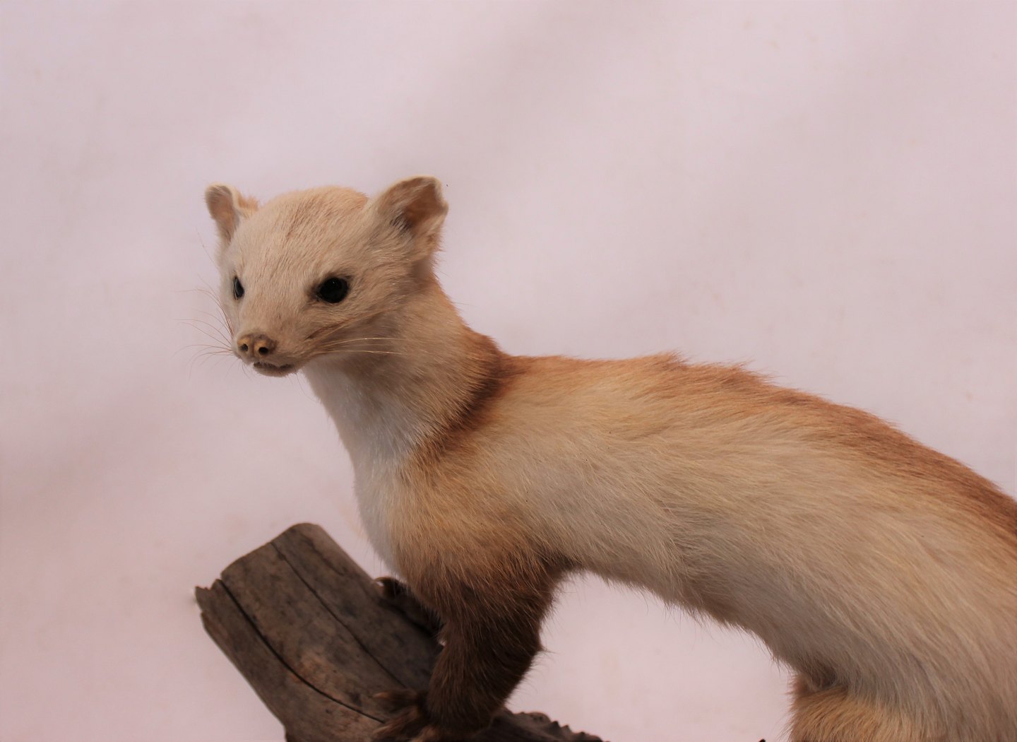 Udstoppet husmår siddende på træstamme fra 1980erne. Dyret er i flot brugt stand.