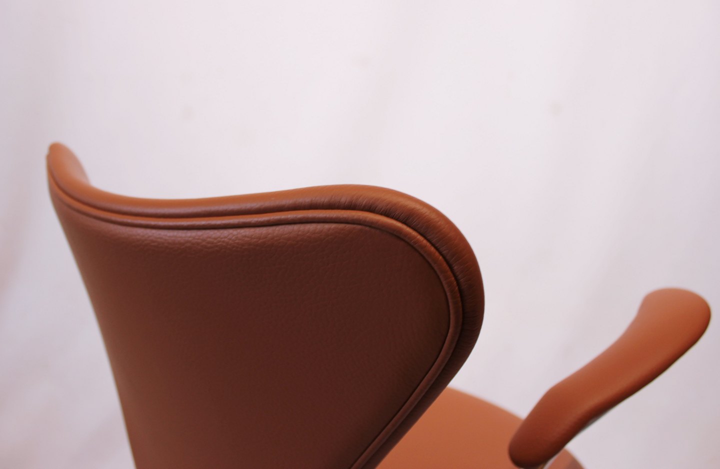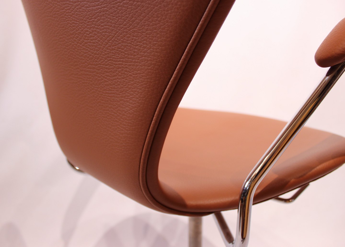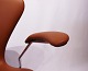 Arne Jacobsen originally designed this chair for the SAS Royal Hotel in Copenhagen, where it became an integral part of the hotel's famous interior. The chair is constructed with a solid frame and chrome armrests that provide stability and support, while the inviting and luxurious cognac colored leather upholstery adds elegance and warmth to any room.