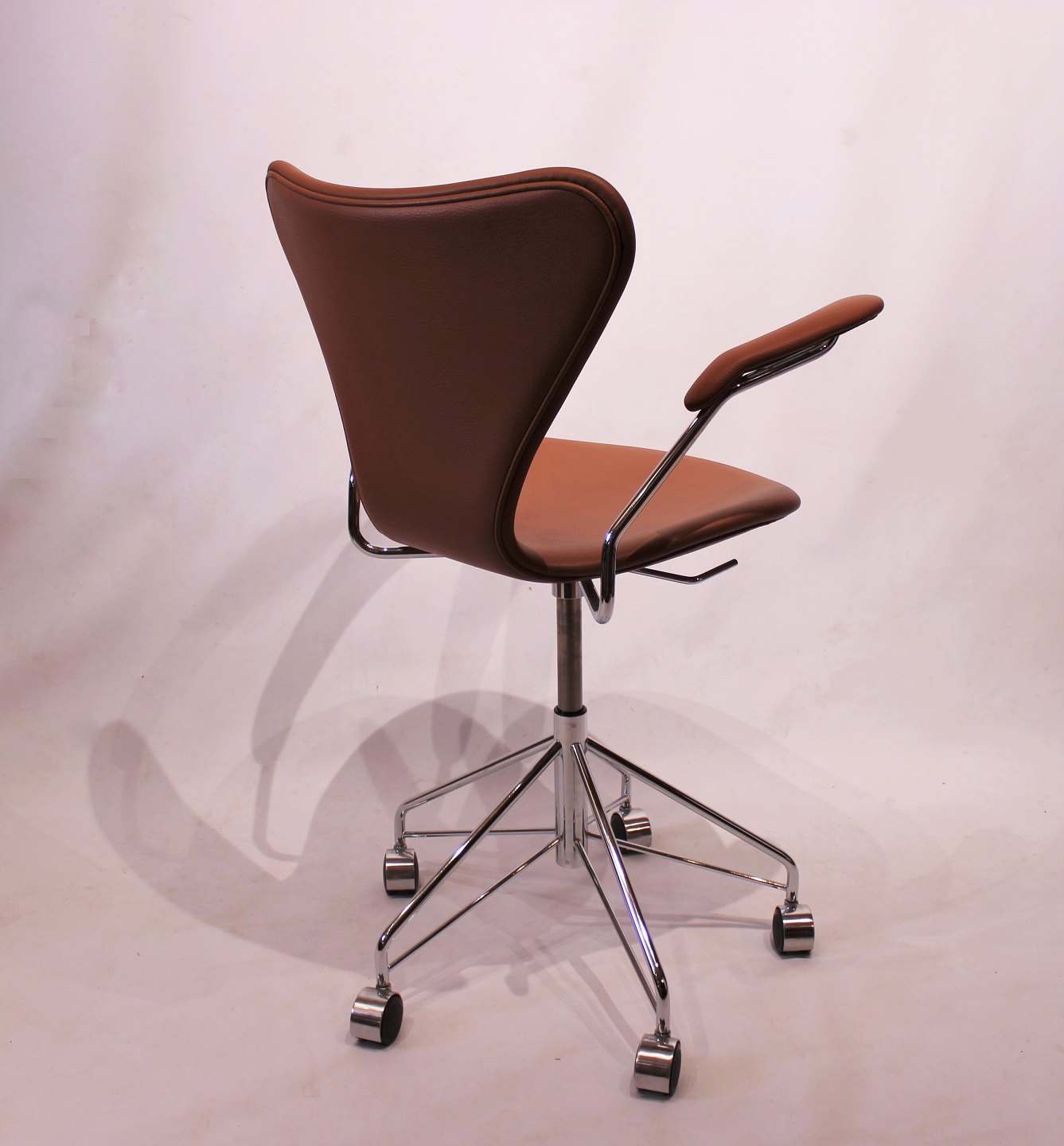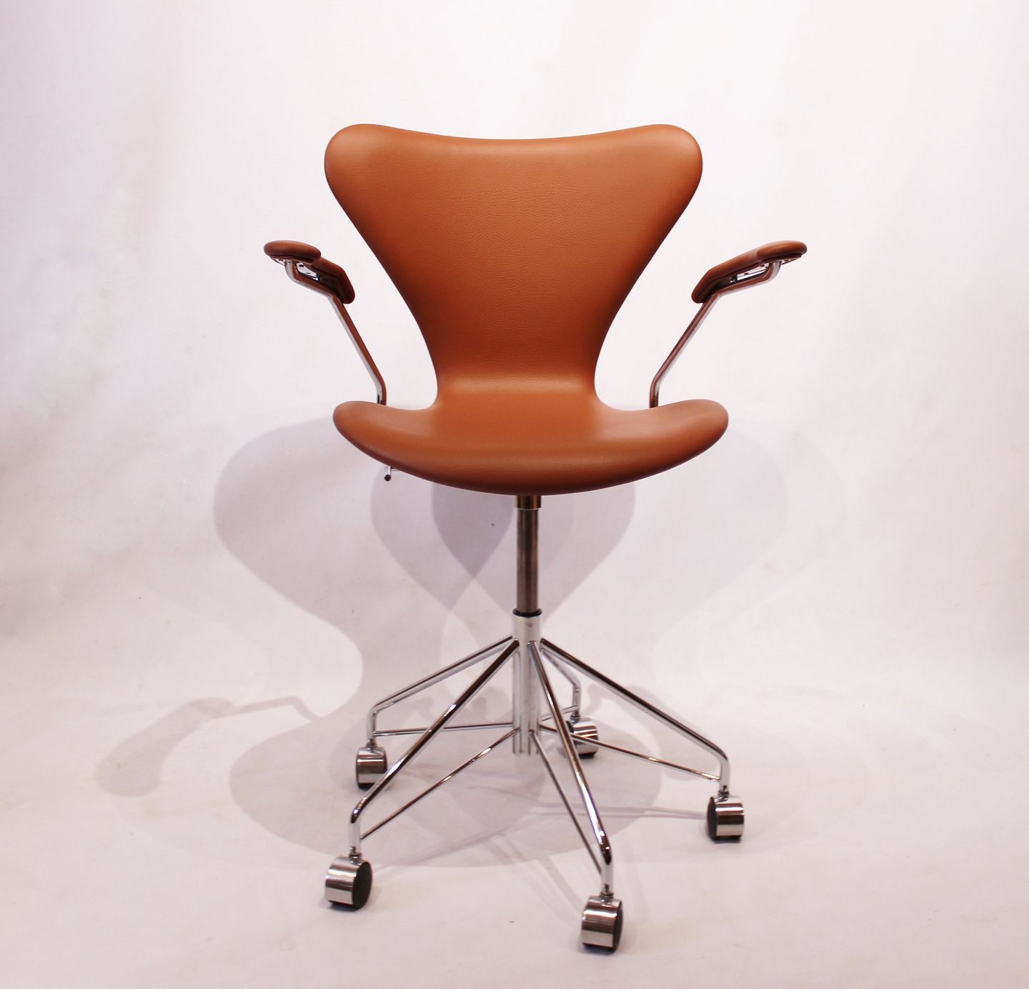 The Syver office chair, model 3217, with armrests and swivel function, is an icon in modern furniture design. It was created by renowned Danish architect and designer Arne Jacobsen in the 1950s and has since become one of his most iconic creations. Manufactured by the renowned Danish furniture company Fritz Hansen, known for their focus on quality and craftsmanship, the Syver office chair represents a perfect example of Scandinavian design aesthetics and functionality.