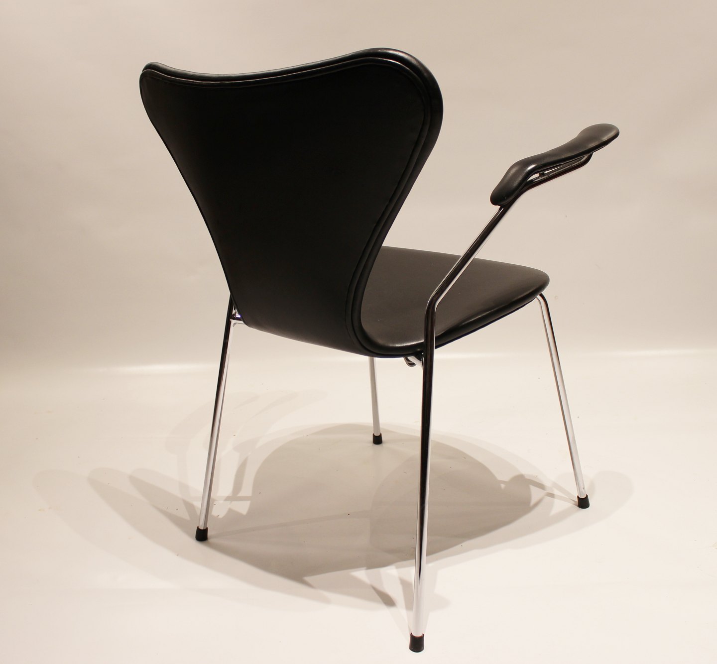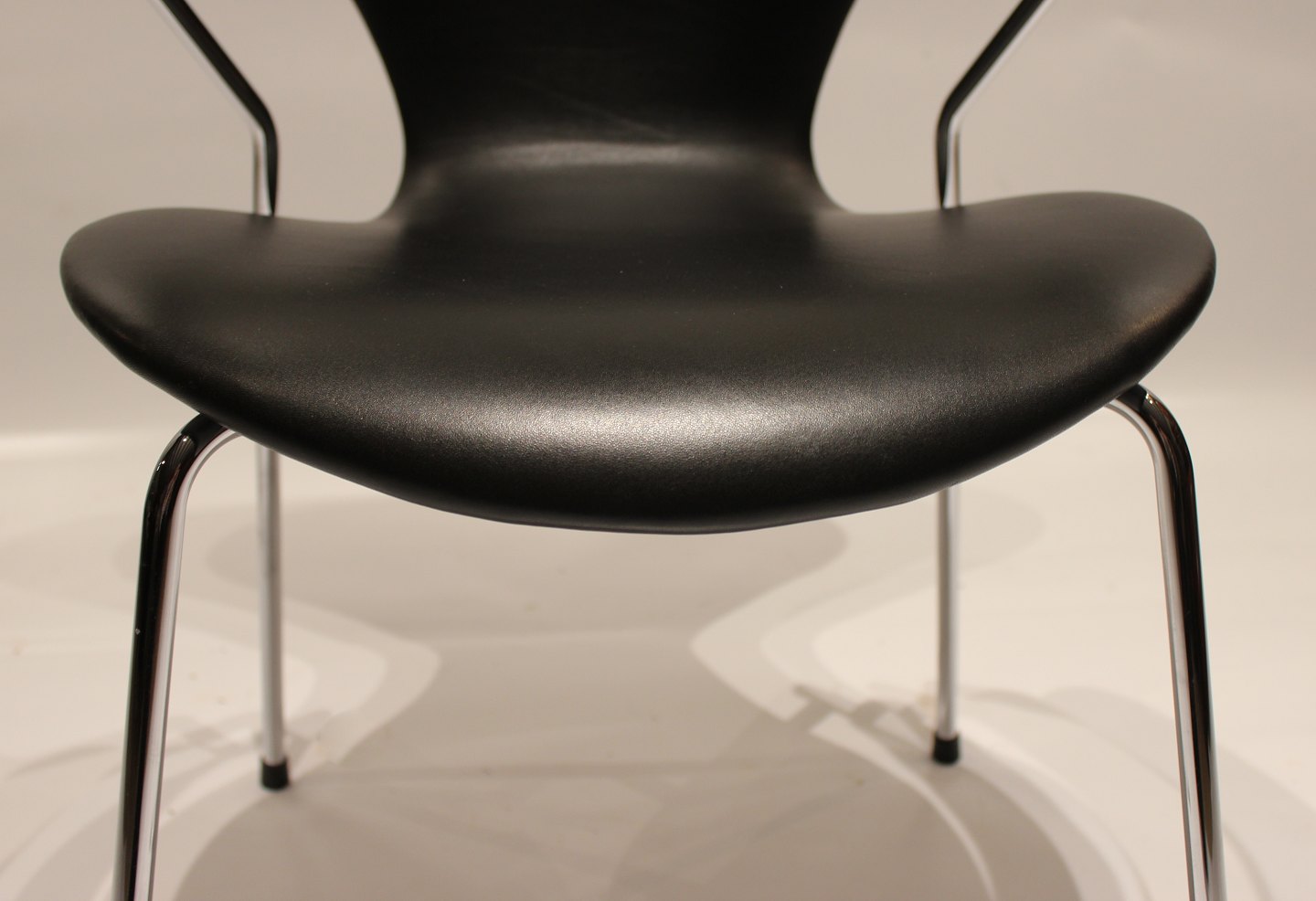 Et sæt af fire Syver stole, også kendt som model 3207, med armlæn i sort Savanne læder er et ikonisk eksempel på dansk møbeldesign fra midten af det 20. århundrede. Disse stole, designet af den legendariske danske arkitekt Arne Jacobsen i 1955, og fremstillet af den anerkendte danske producent Fritz Hansen i 2006, udtrykker en tidløs elegance og funktionalitet.