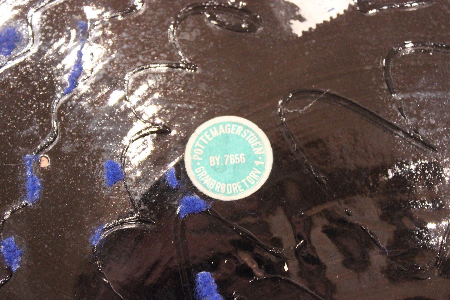 Large round ceramic dish with dark blue glaze and motif of a fish, by Pottemagerstuen at Graabrødretorv 1. The dish is in great vintage condition.
