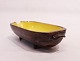 Keramik skål på fødder med brun glasur udvendig og gul indvendig af dansk design fra 1960erne. Skålen er i flot brugt stand.
