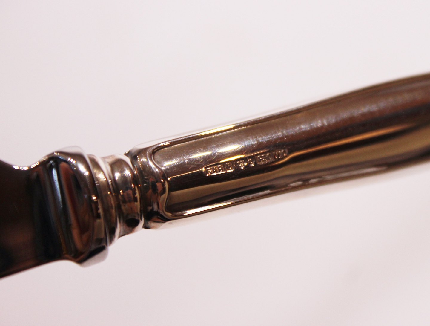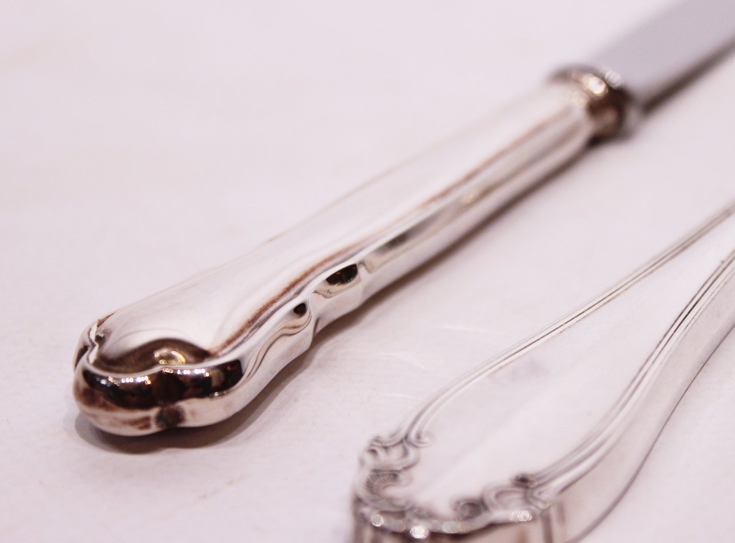 Middagsknive i forskellige mønstre af 830 og tretårnet sølv. Spørg for antal på lager.