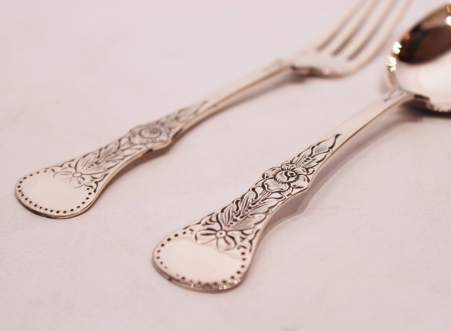 SolgtBørnebestik, ske og gaffel, i andet mønster af tretårnet sølv. Spørg for antal på lager.
