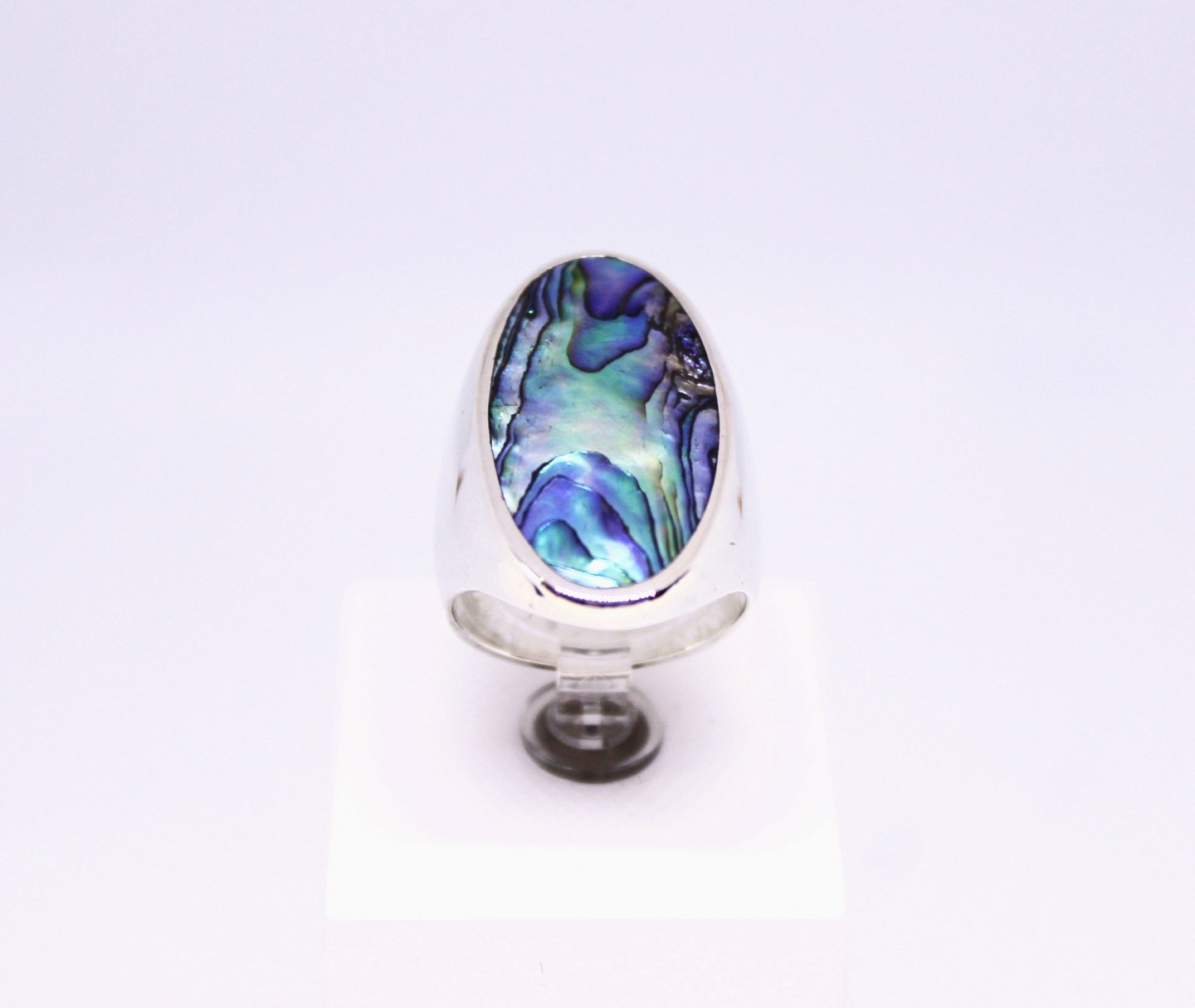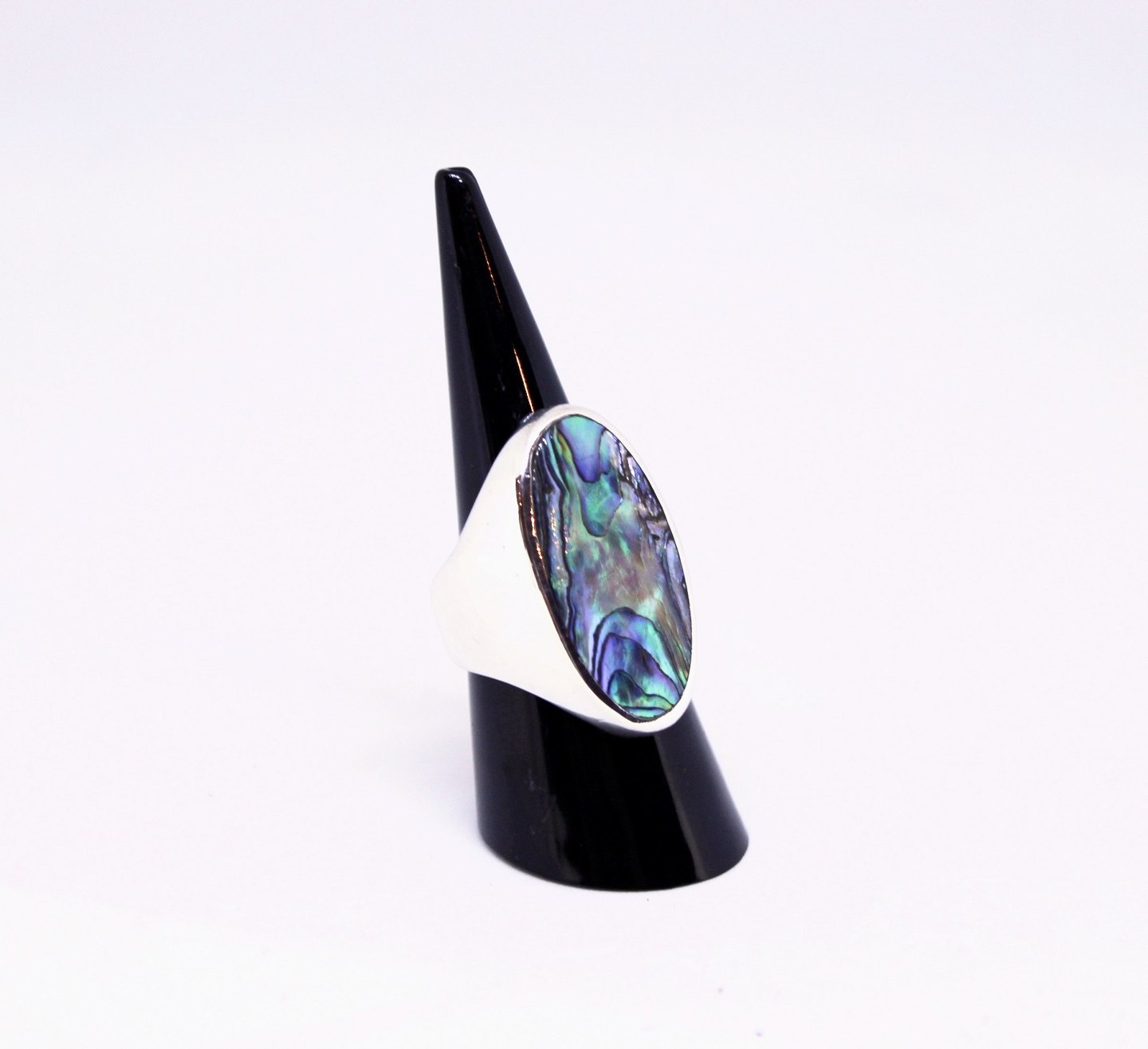 SoldRing decorated with colored mother of pearl, stamped ALE and of 925 sterling silver. The ring is in great vintage condition.