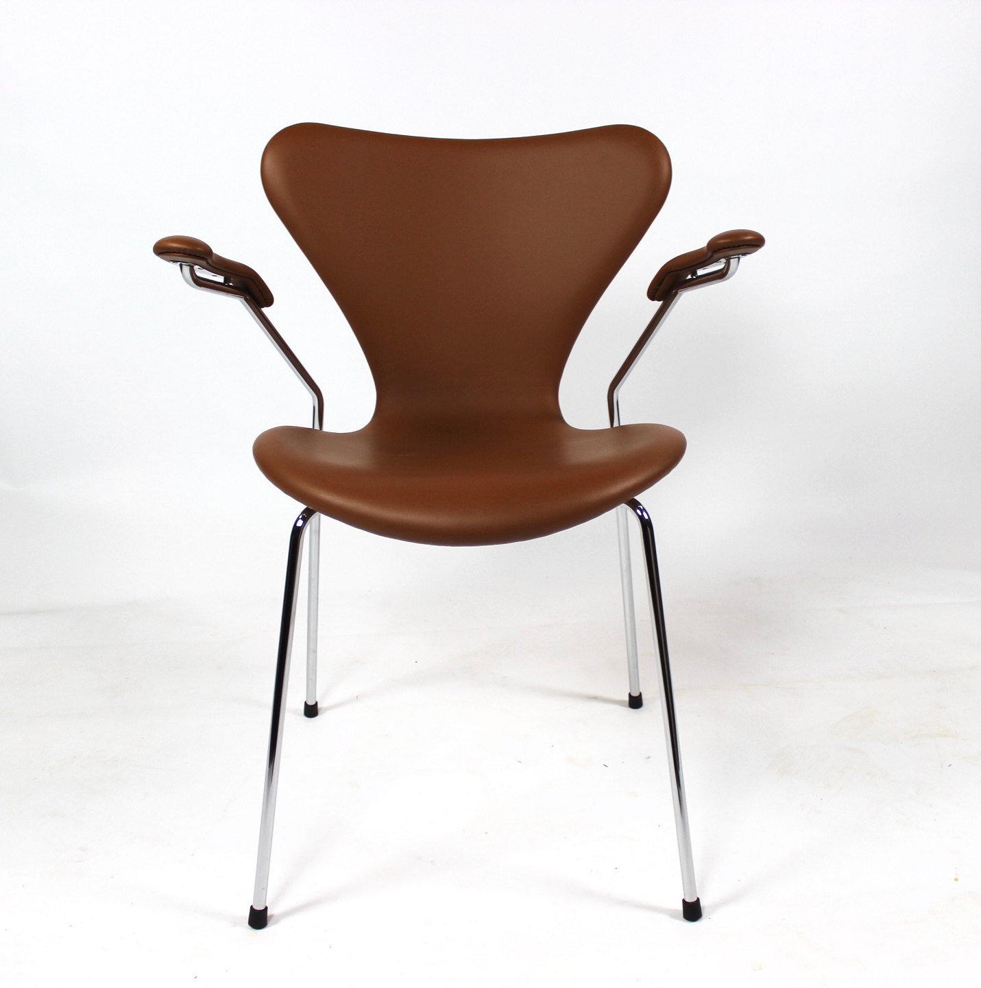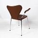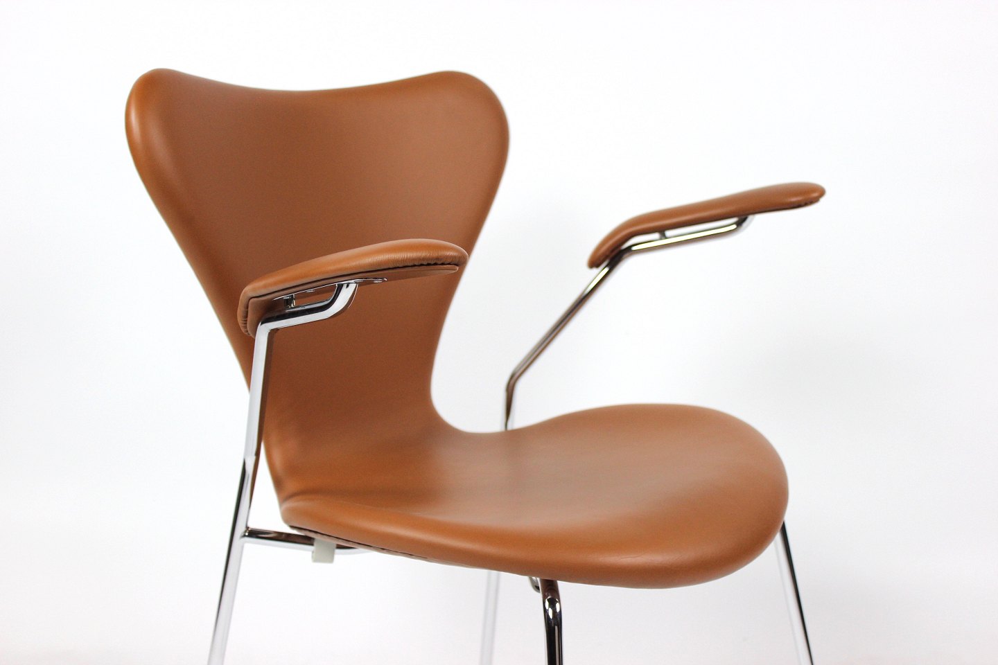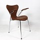 Dette sæt af Syver stole, model 3207, er et tidløst og ikonisk udtryk for dansk design, designet af den legendariske Arne Jacobsen i 1955 og fremstillet af Fritz Hansen i 2019. Stolene er udført i cognacfarvet læder og har elegante armlæn, der tilføjer både stil og komfort til deres design.