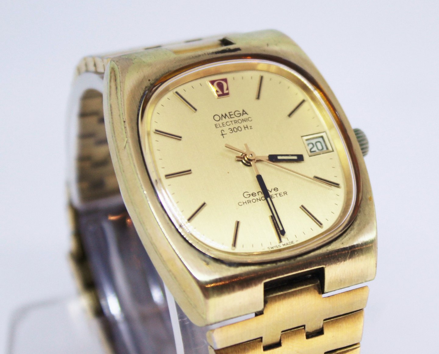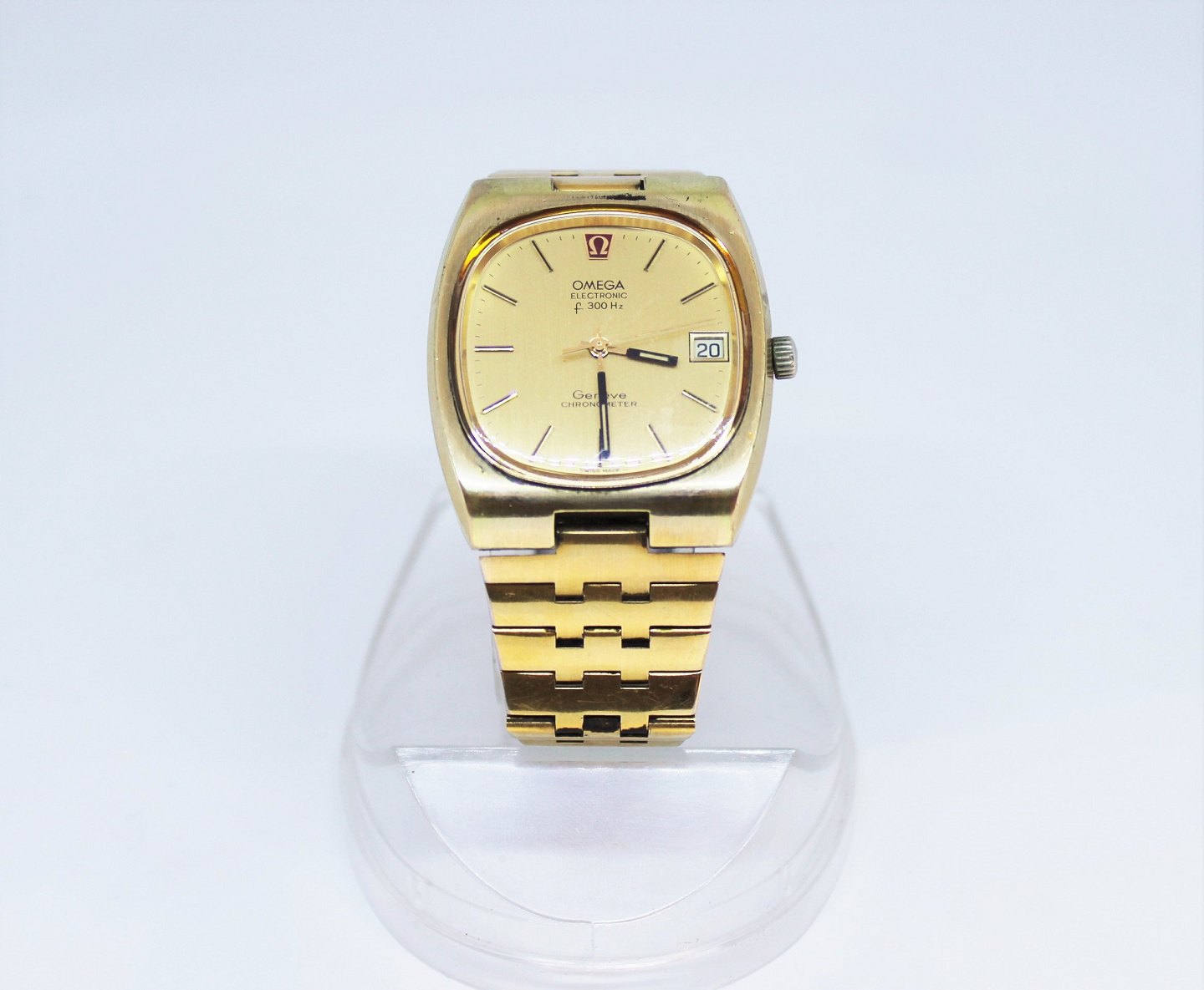 Omega Electronic F300HZ gilded stainless steel men's wristwatch, 1232/219. The watch is with chronometer and date. The watch is mecanic and from the beginning of the 1970s.