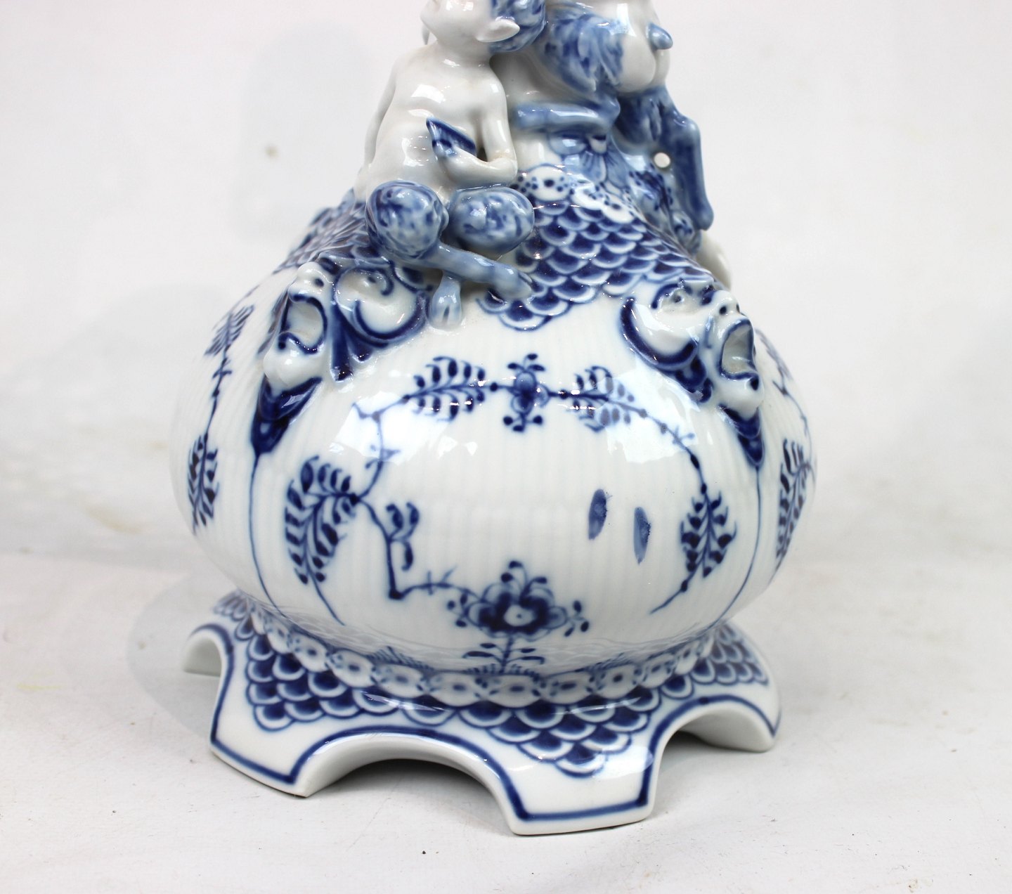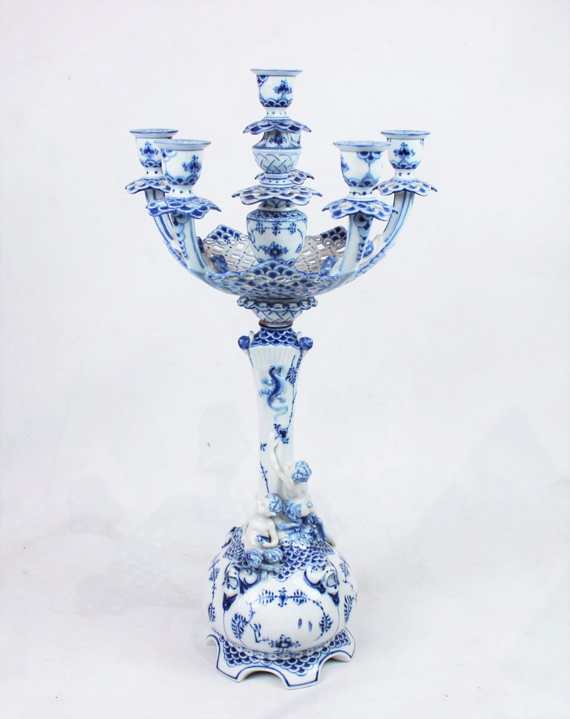 We buyThis five-armed candelabra, from Kgl. The Musselmalet Helblonde series is a unique example of Danish porcelain art. The candelabra is beautifully decorated with detailed figures and the classic mussel painted pattern, which has been a cornerstone of Royal Copenhagen's range since 1775.