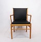 Vi køberDenne armstol, model PJ-301, er designet af den anerkendte danske møbeldesigner Ole Wanscher og fremstillet af PJ Møbler i 1960'erne. Stolen er udført i kirsebærtræ, hvilket giver den en varm og elegant fremtoning. Hynderne er betrukket med sort læder, der tilføjer et moderne og sofistikeret touch.