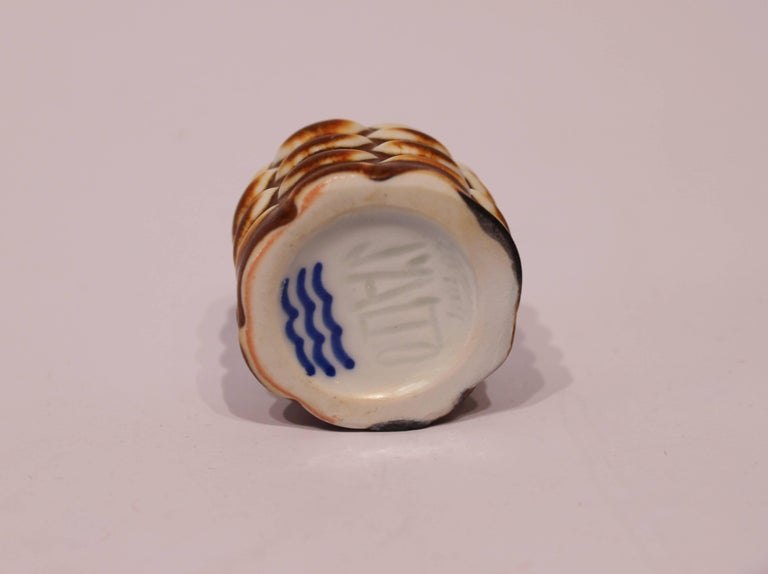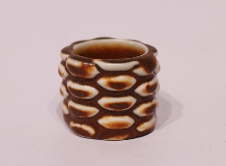 Vi køberDette keramik saltkar, designet af Axel Salto for Royal Copenhagen i 1950'erne, er et smukt eksempel på mid-century dansk keramik. Saltkaret er dekoreret i lyse og mørke brune nuancer, hvilket fremhæver Saltos karakteristiske stil og ekspertise i at skabe teksturerede og organiske former.