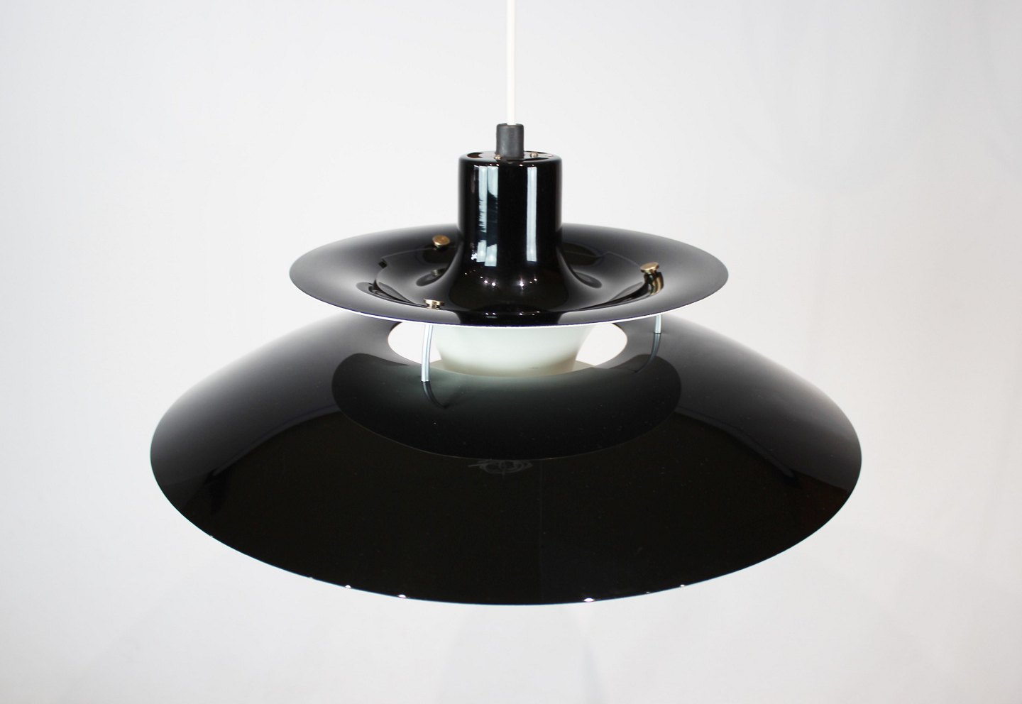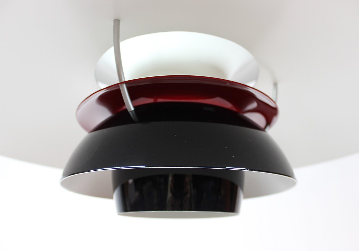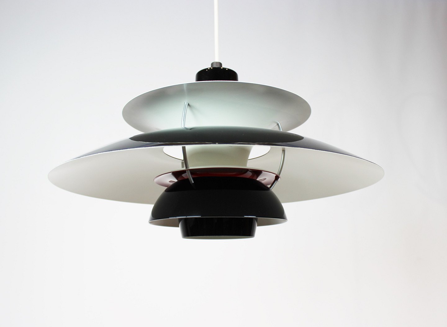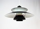 SoldPH5 lamp designed by Poul Henningsen in 1958 and manufactured by Louis Poulsen. The lamp has lacquered metal shades in black, red and white, and is a newer model.