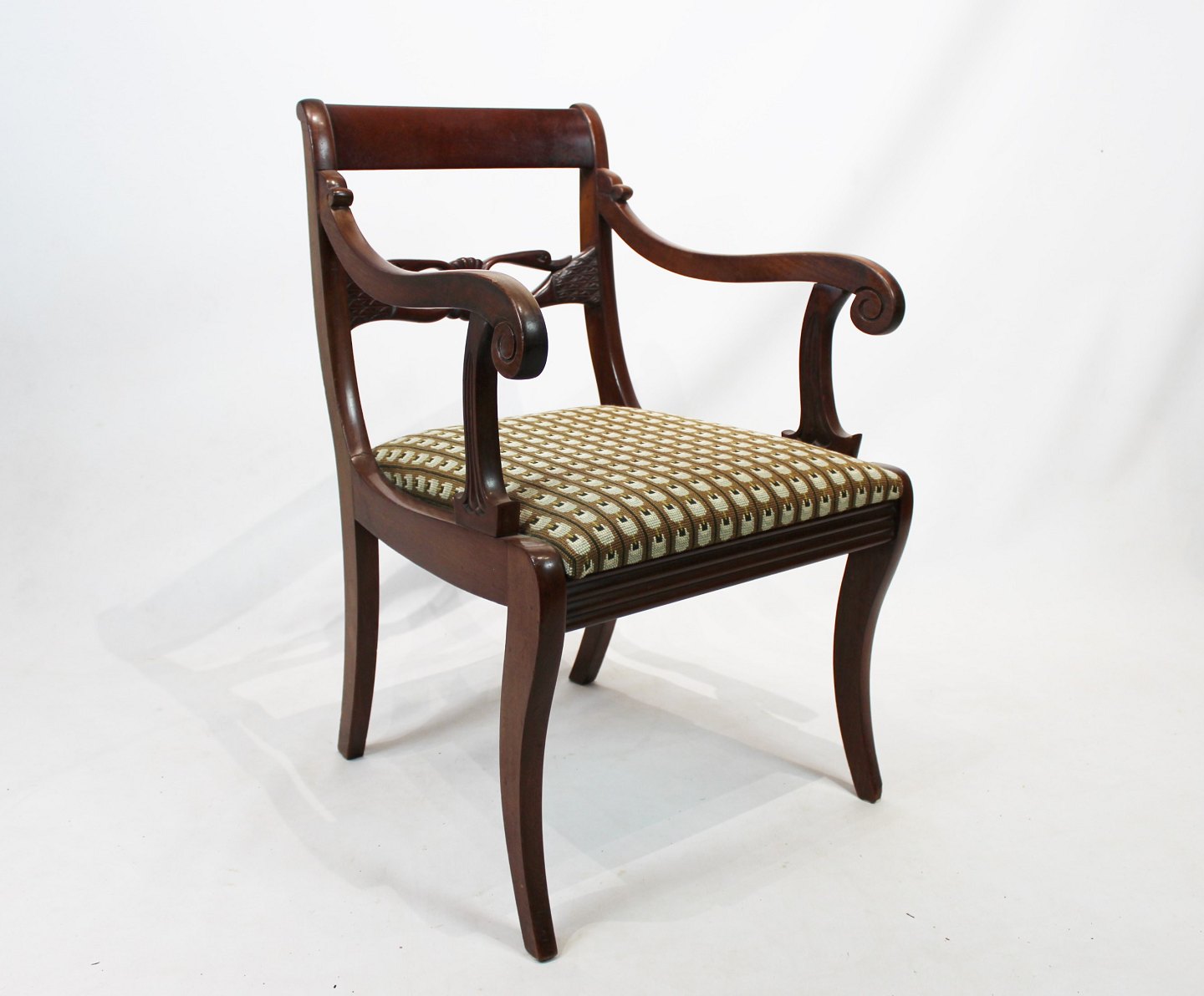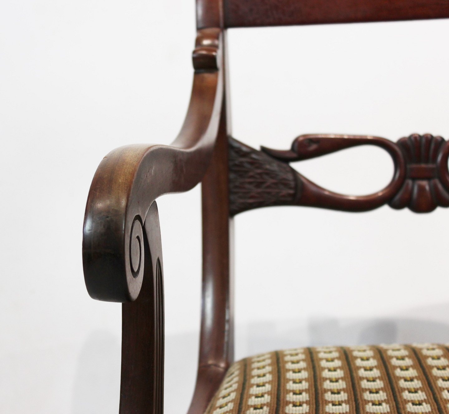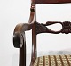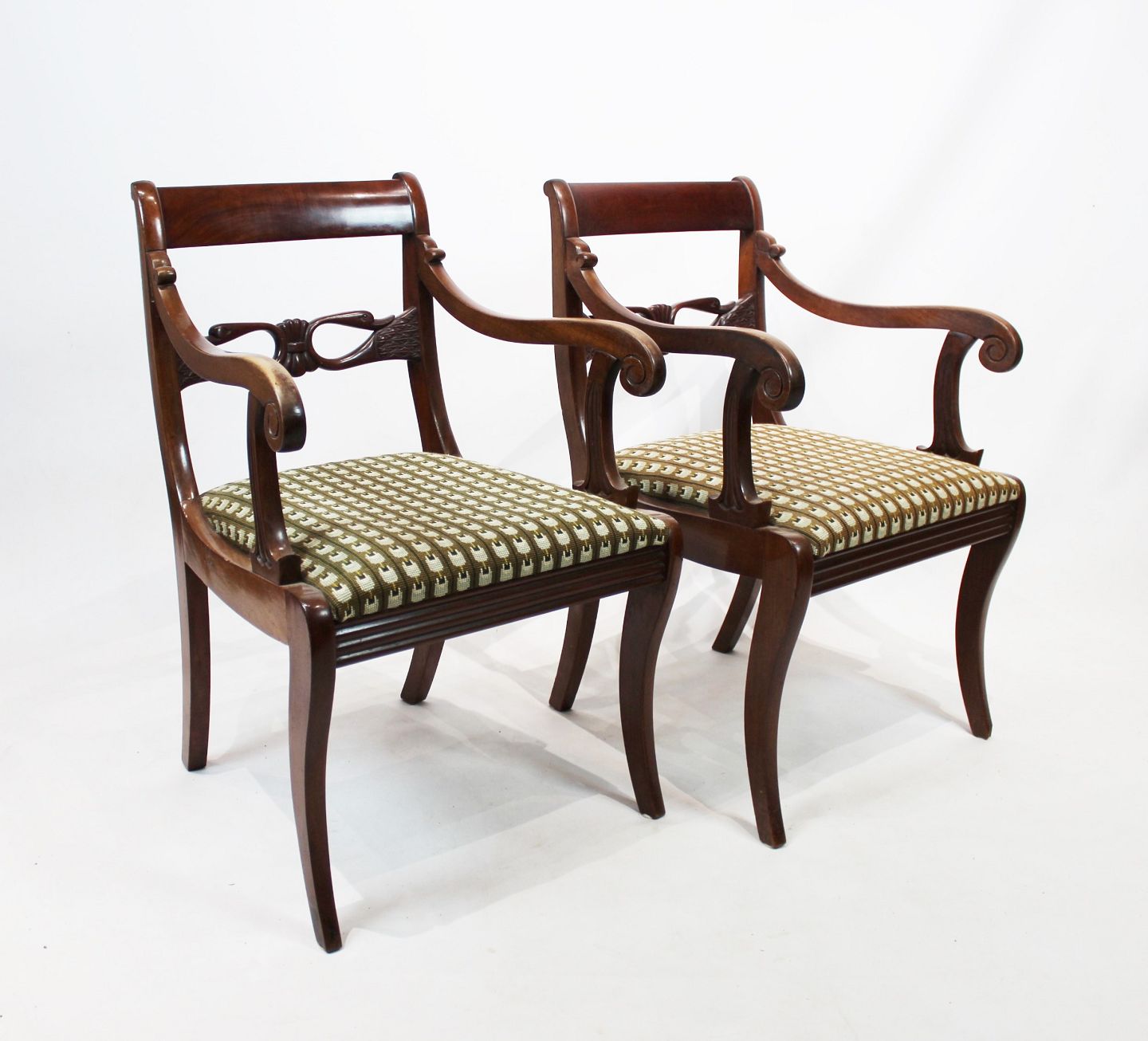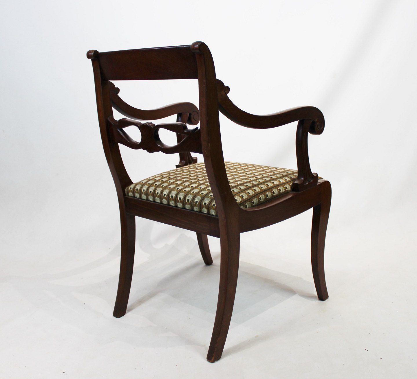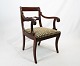 Et par armstole i Sen Empire af mahogni og polstret med mørke grønt stof fra 1860erne. Stolene er i flot antik stand.