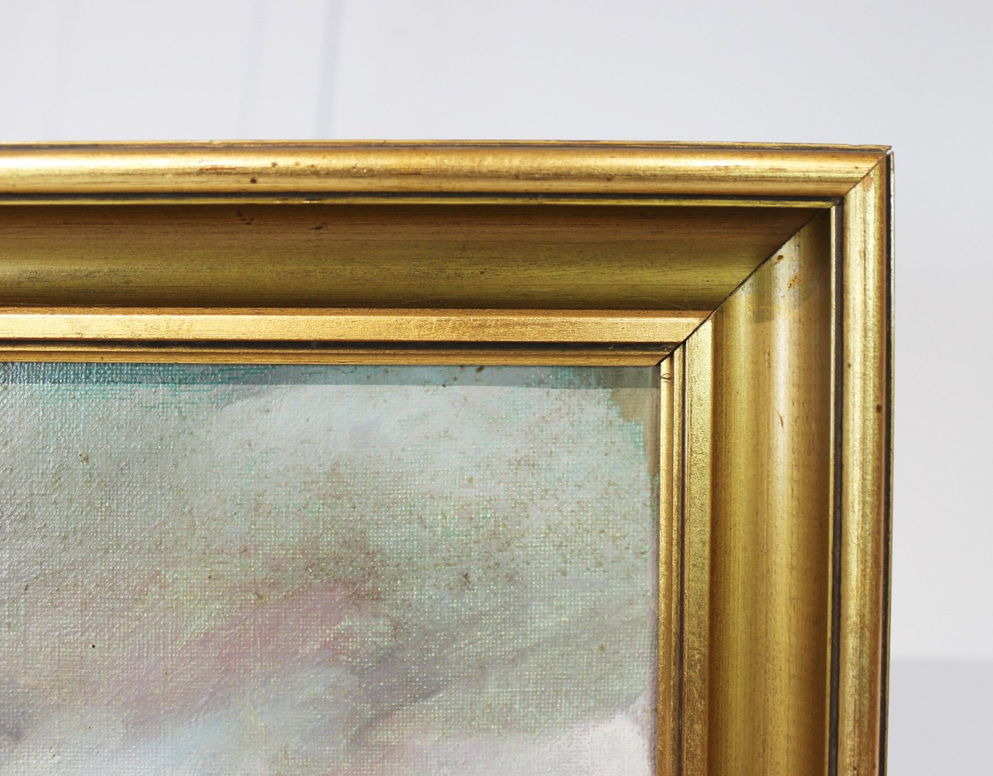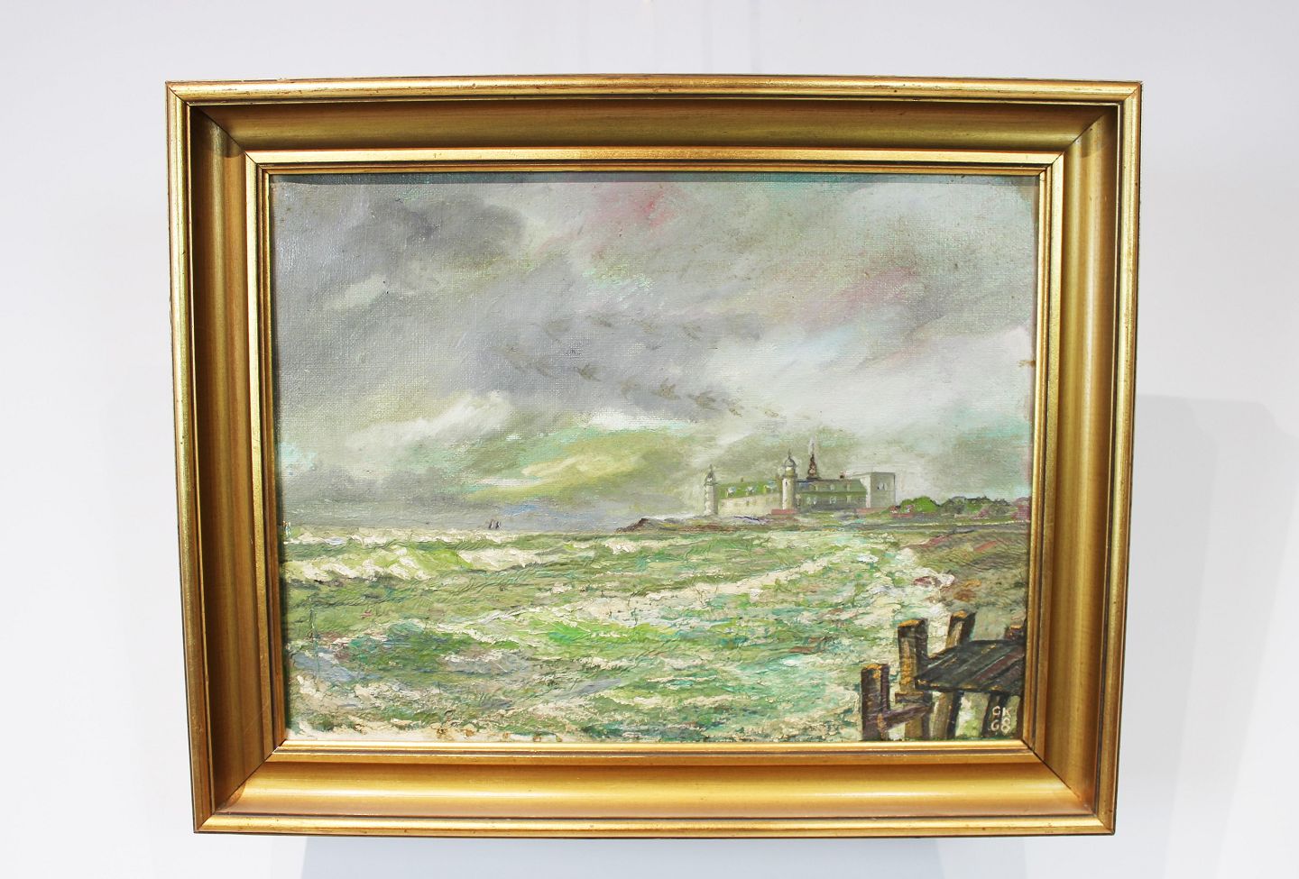 Painting with of the Danish castle Kronborg motif and gilded frame signed GK from 1968. The painting is in great vintage condition.