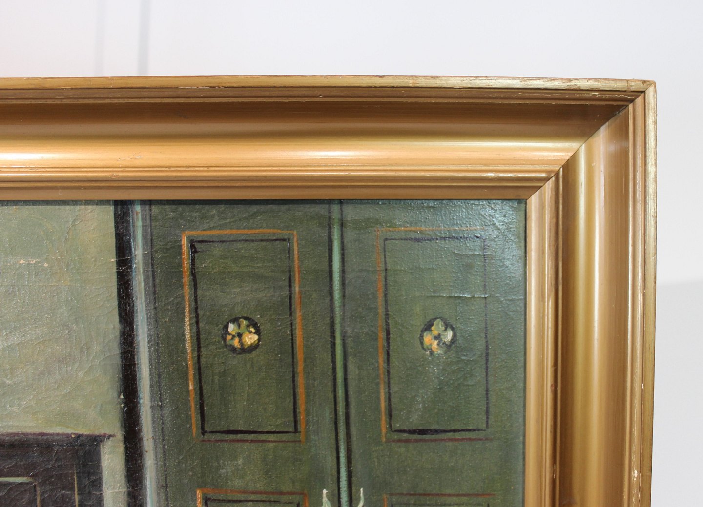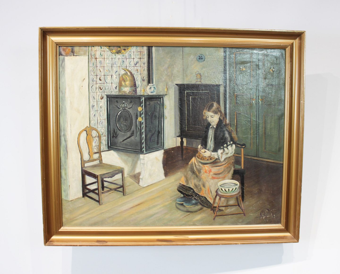 Maleri med motiv af bondepige og guldramme signeret H.P. fra 1942. Maleriet er i flot brugt stand.