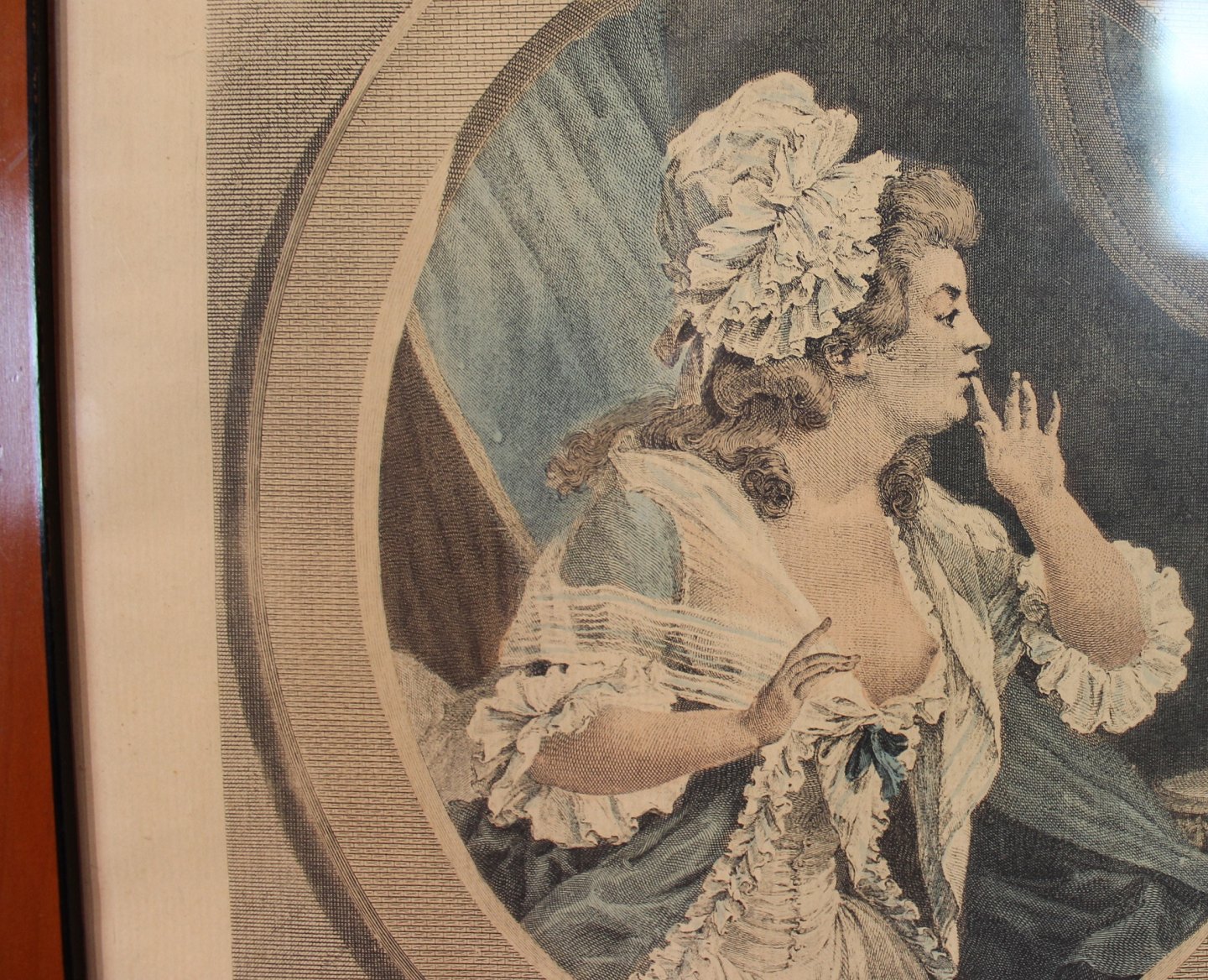 Hand-tinted engraving after painting, in two colored frame, in great condition.