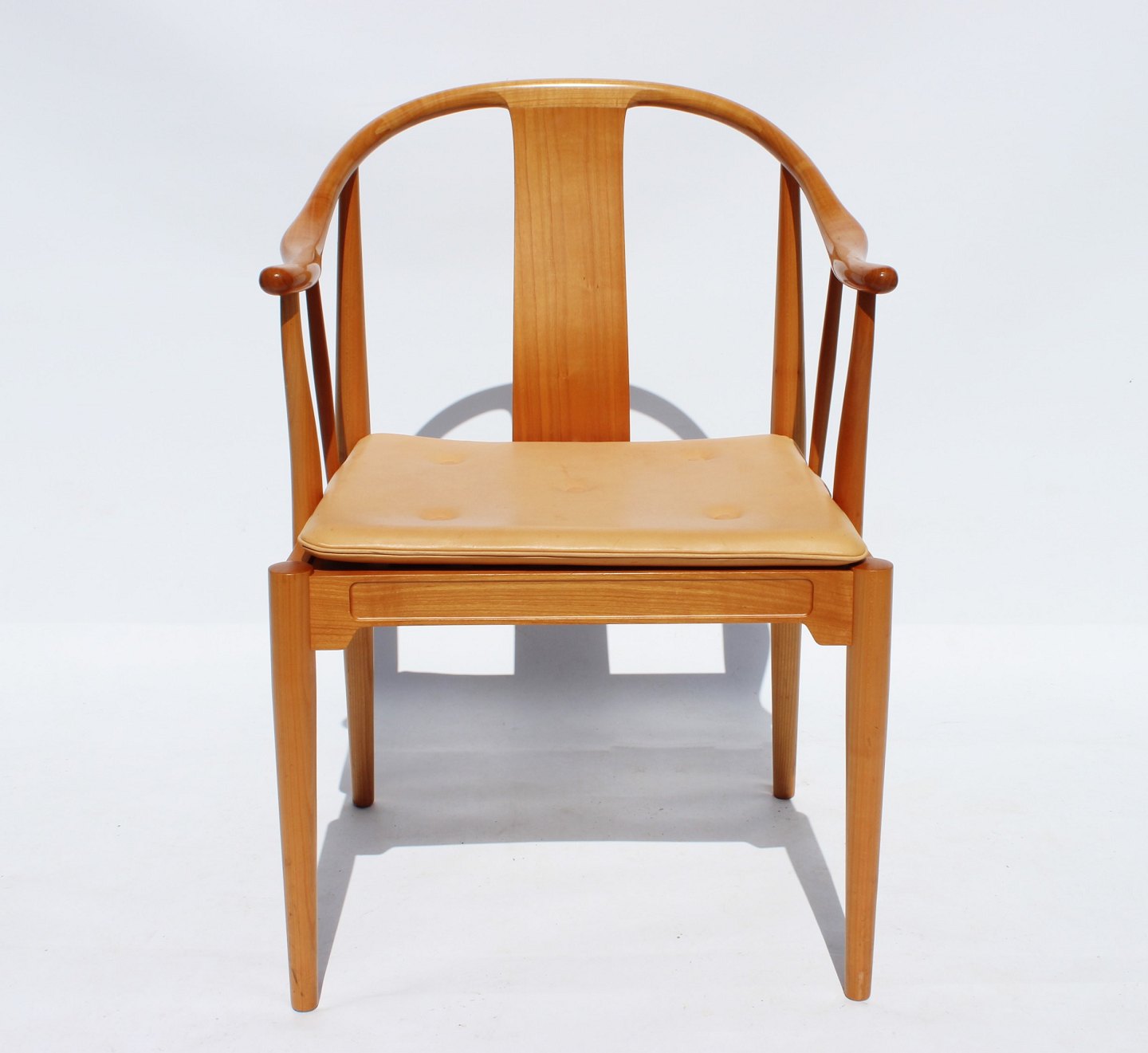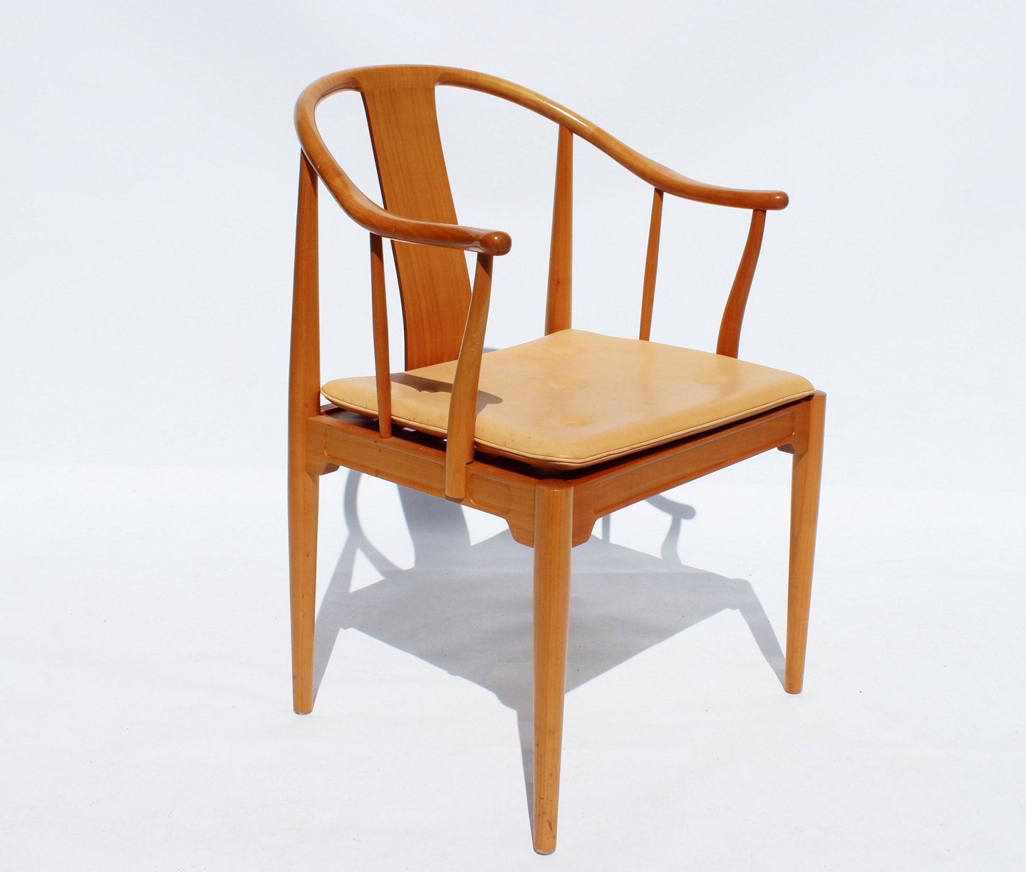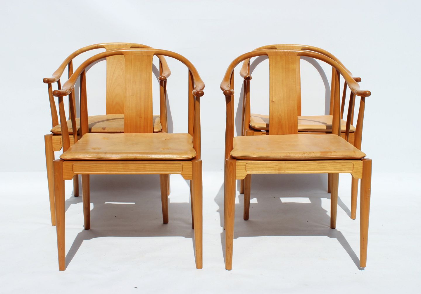 Et sæt af fire Kina stole, model 4283, designet af Hans J. Wegner i 1944 og fremstillet af Fritz Hansen i 1999. Stolene er af kirsebær og med hynde af natur læder. 2 stk tilbage