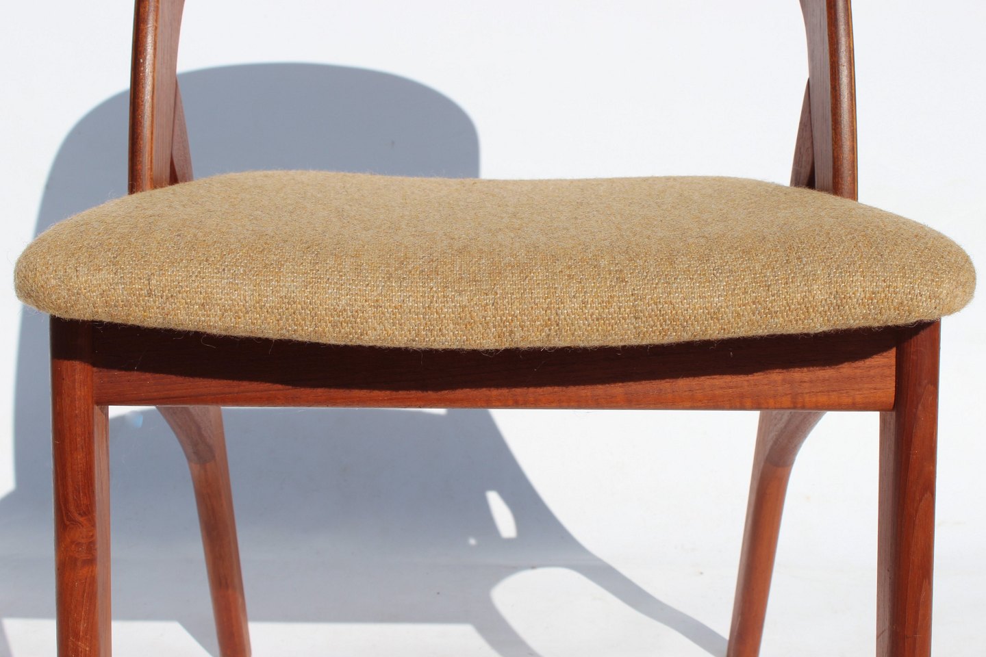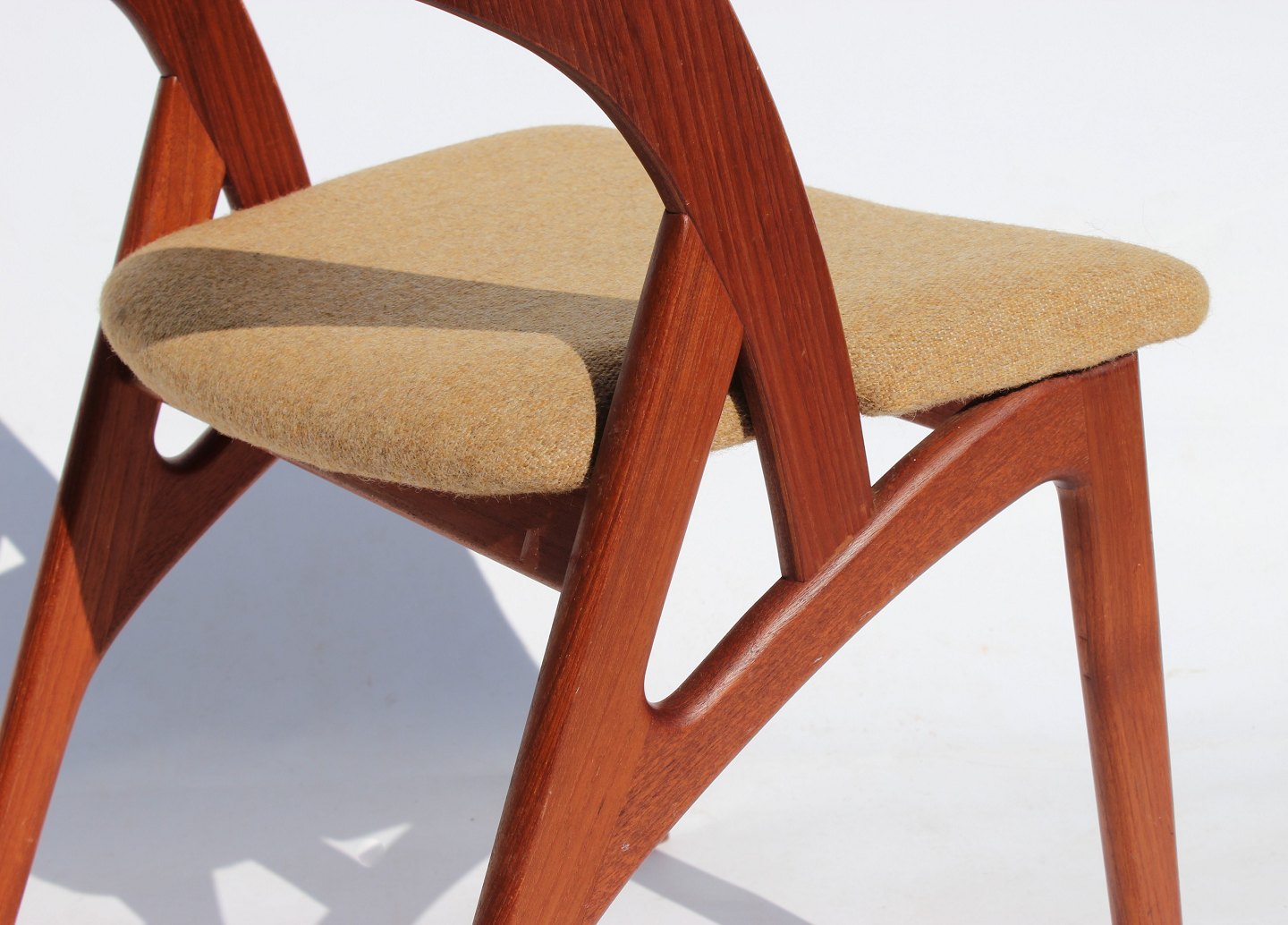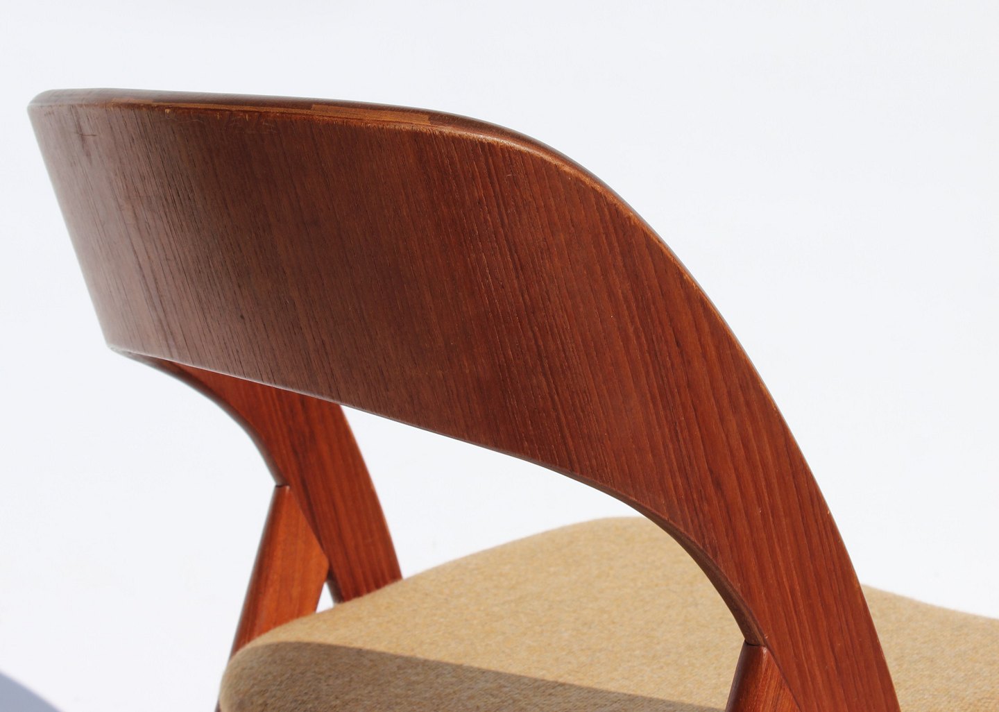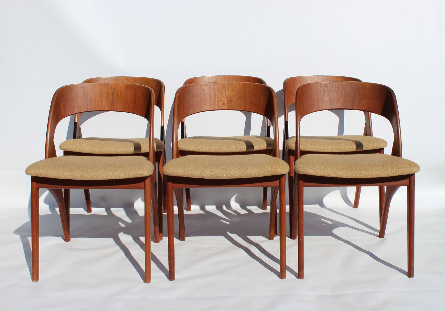 SolgtEt sæt af seks spisestuestole i teak og lyst stof af dansk design fra 1960erne. Stolene er i flot brugt stand.