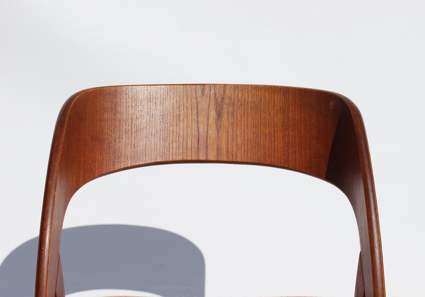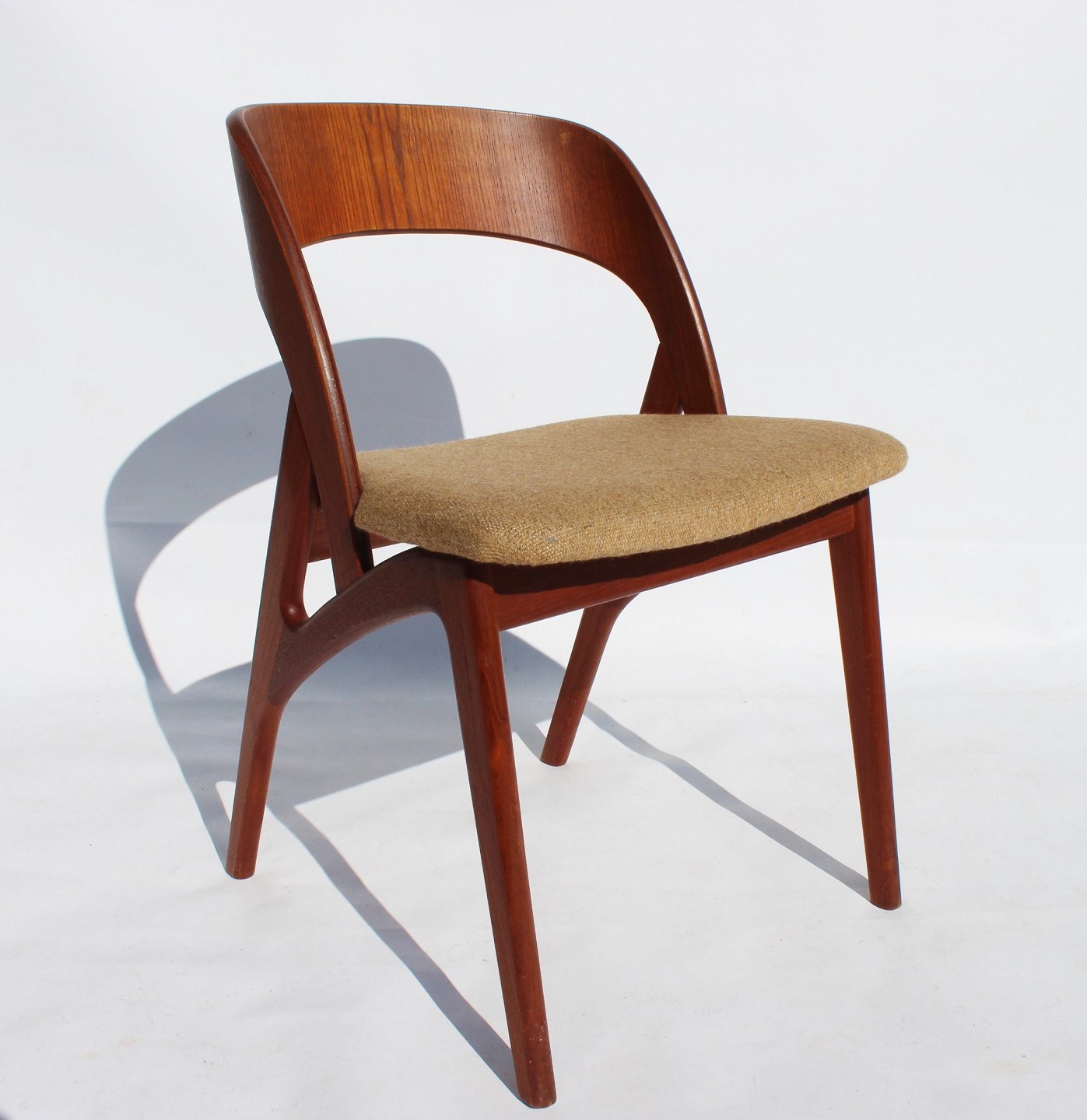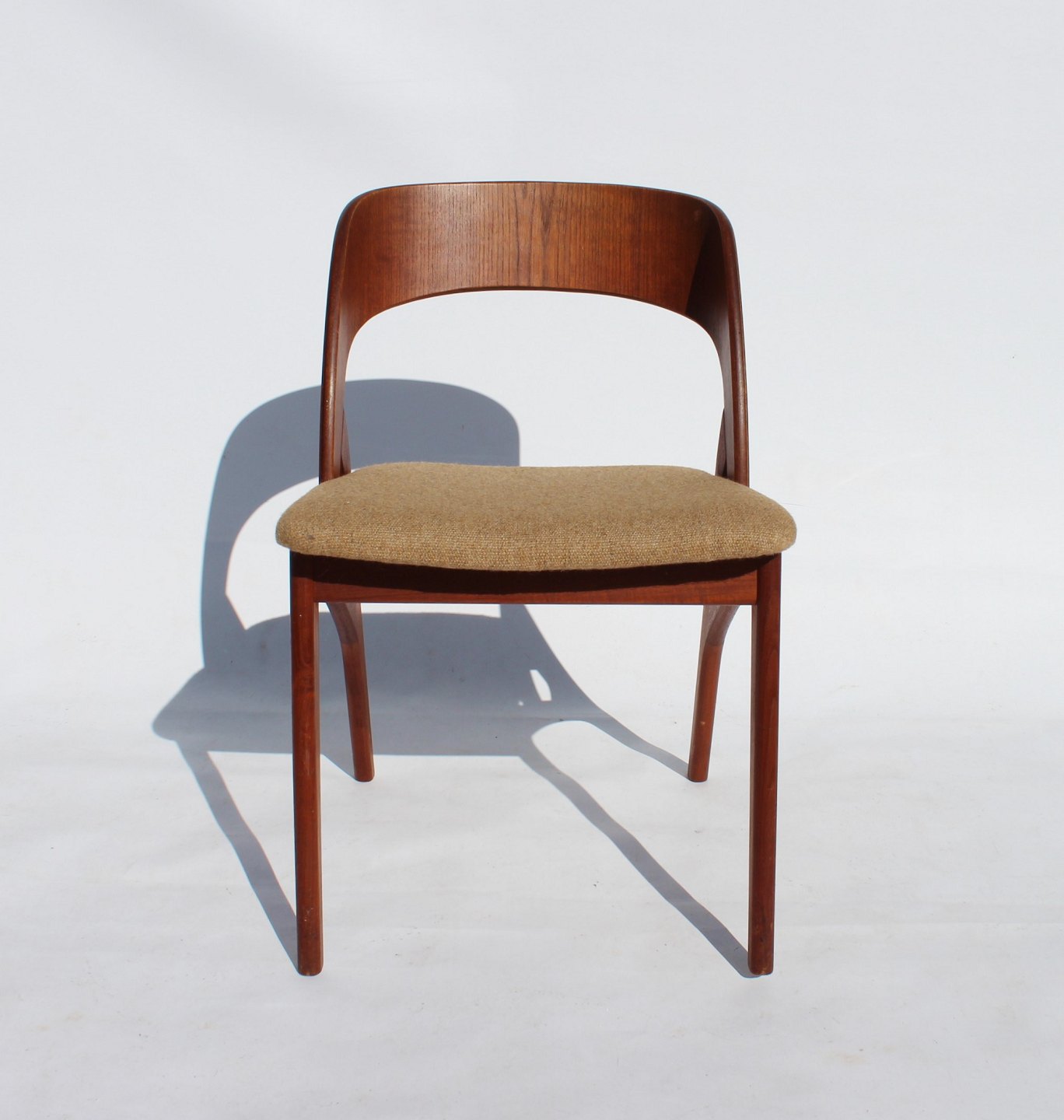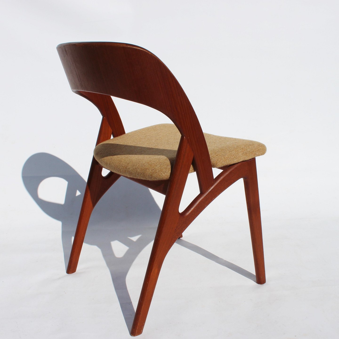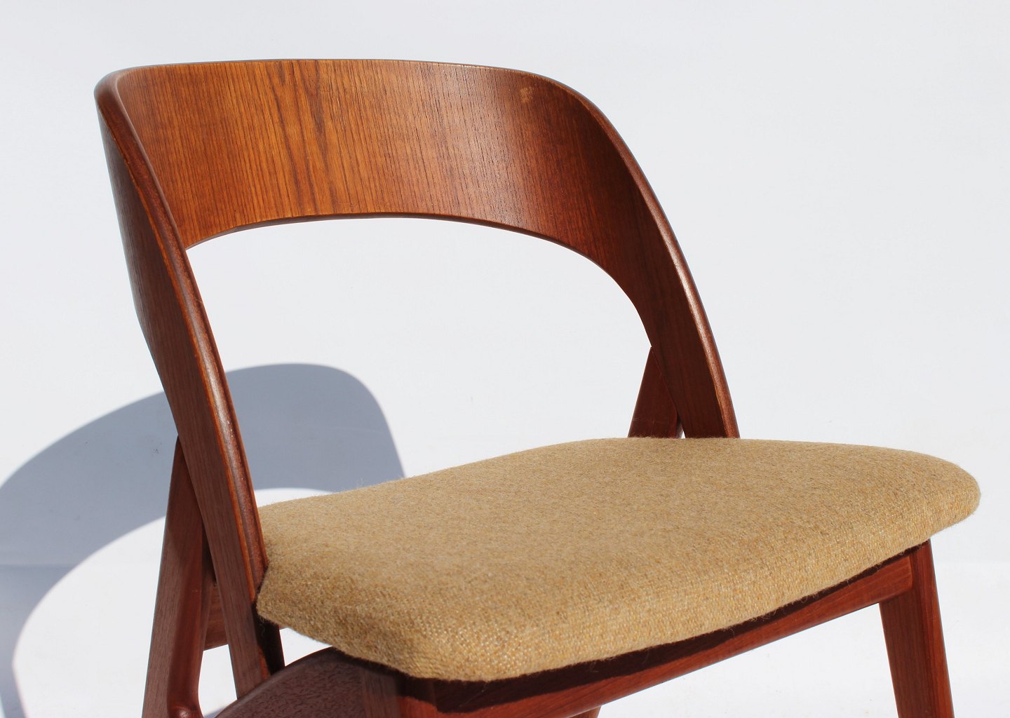 SolgtEt sæt af seks spisestuestole i teak og lyst stof af dansk design fra 1960erne. Stolene er i flot brugt stand.