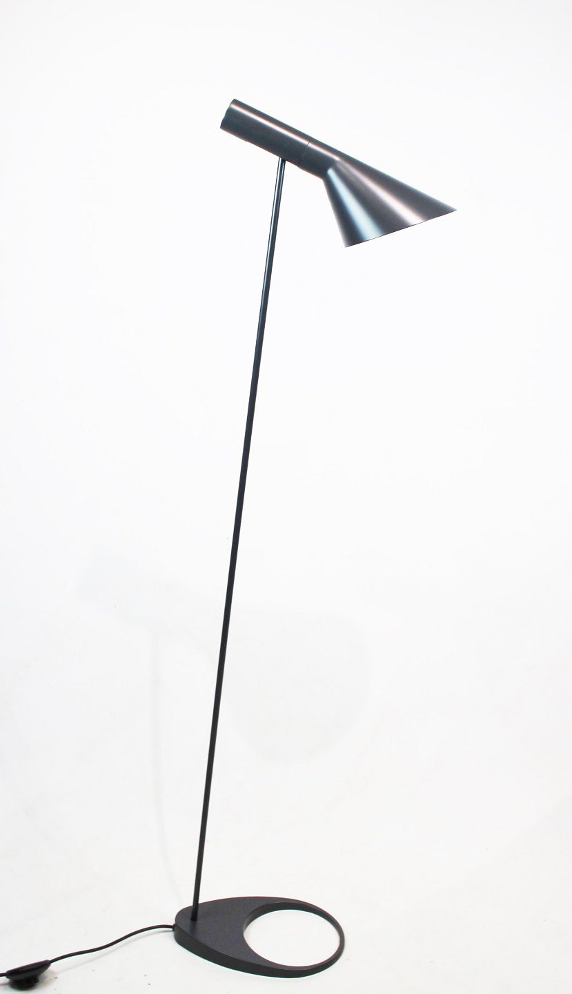Dark grey floor lamp desgined by Arne JAcobsen in 1957 and manufactured by Louis Poulsen.