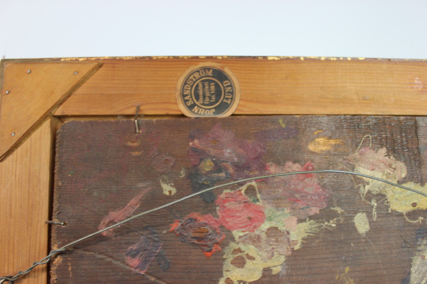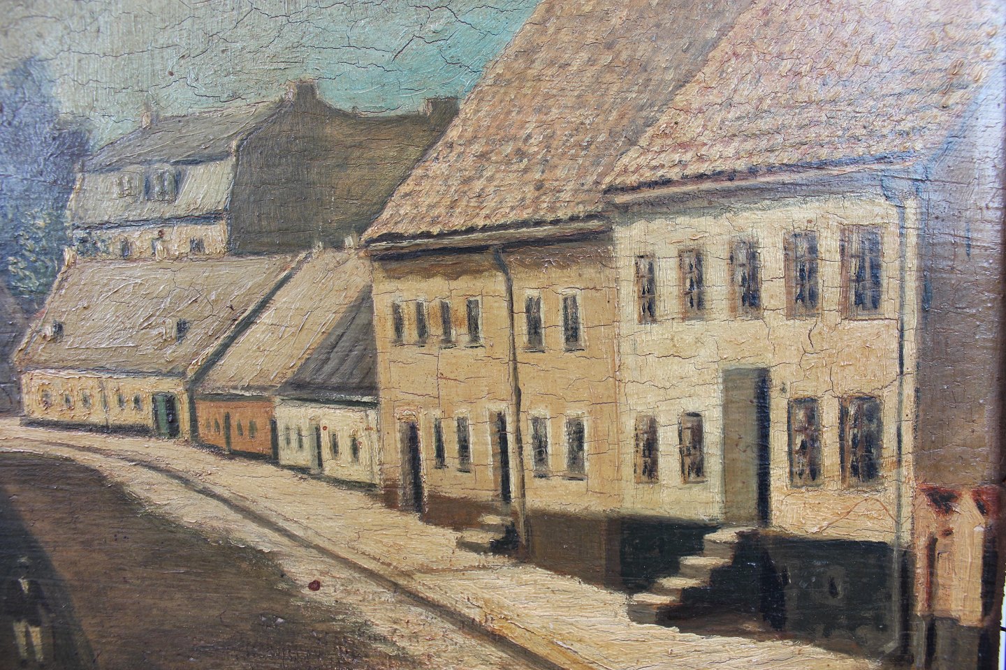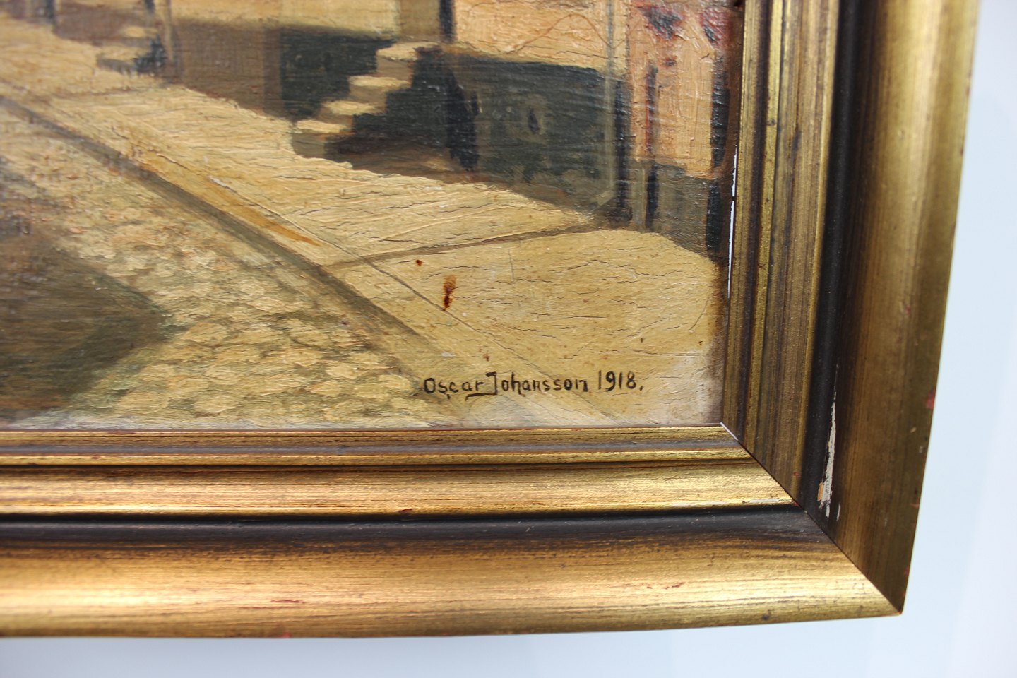 SoldOil painting with motif of a village signed by Oscar Johansson in 1918.