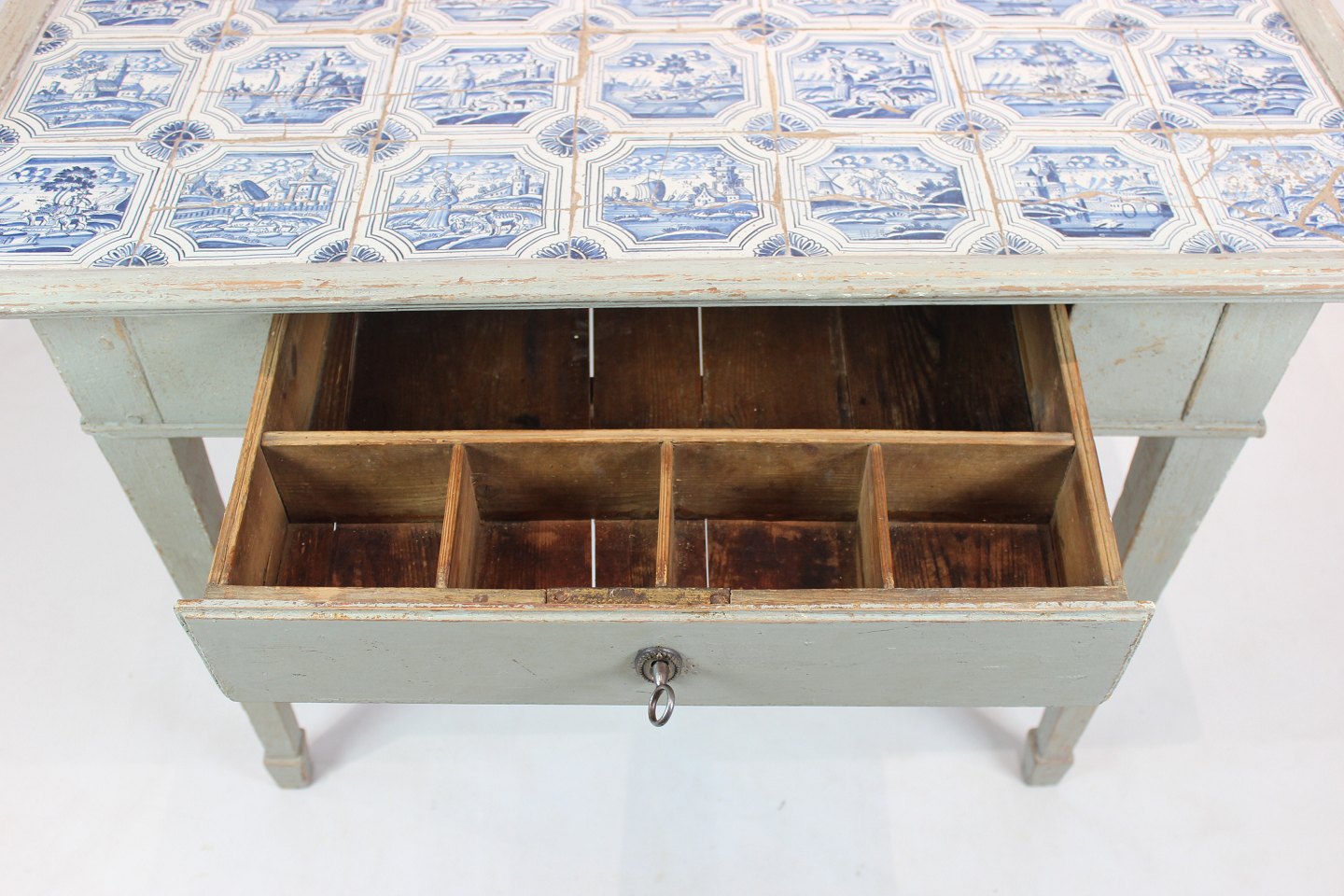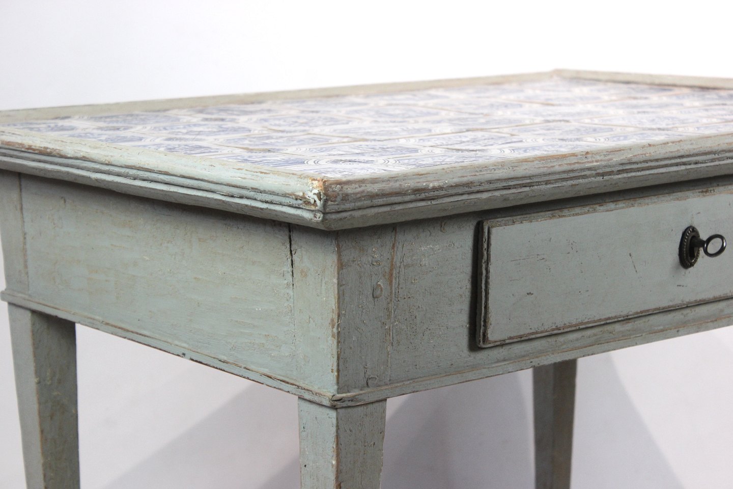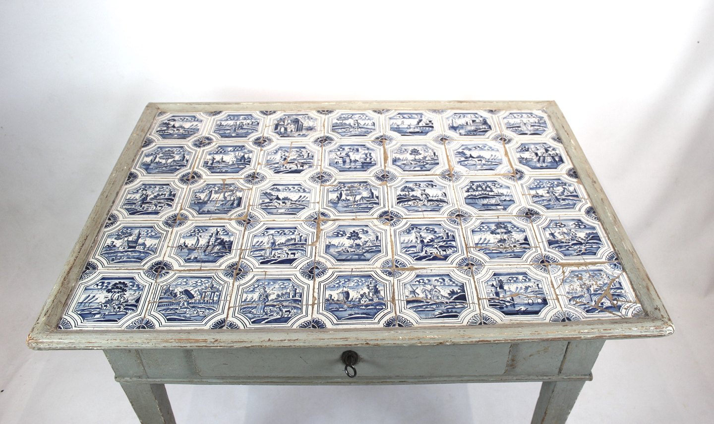 SoldGrey painted danish tile table from the 1780s with dutch tiles. The table is in great vintage condition.