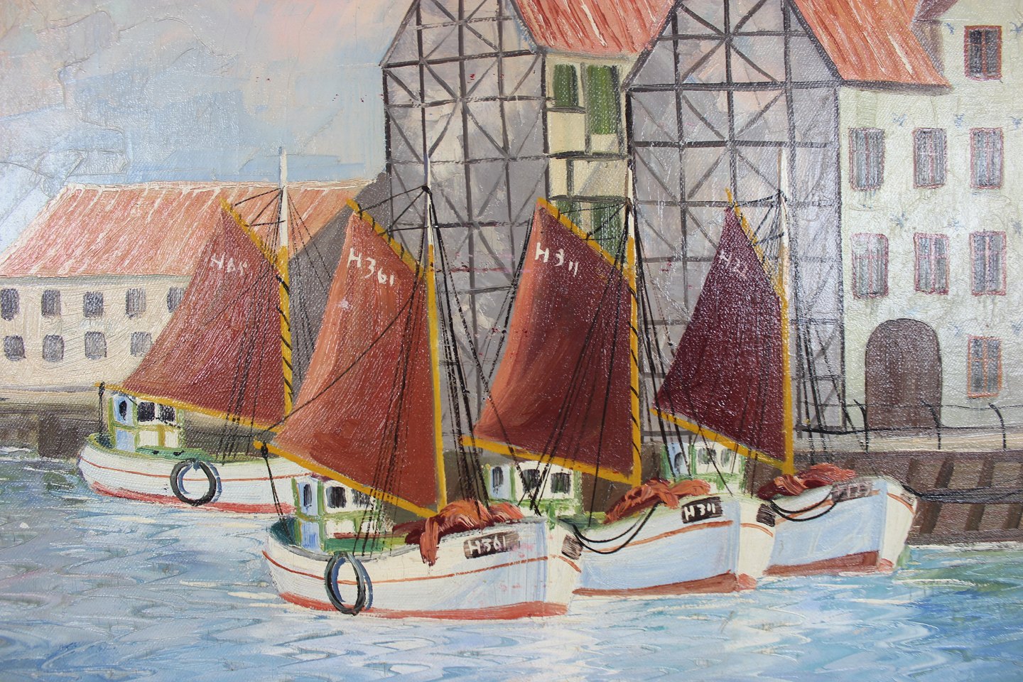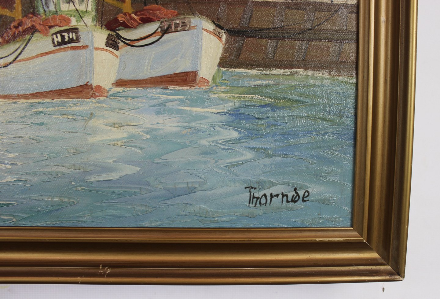 Oil painting with motif of ships and gilded frame signed Thornøe.
